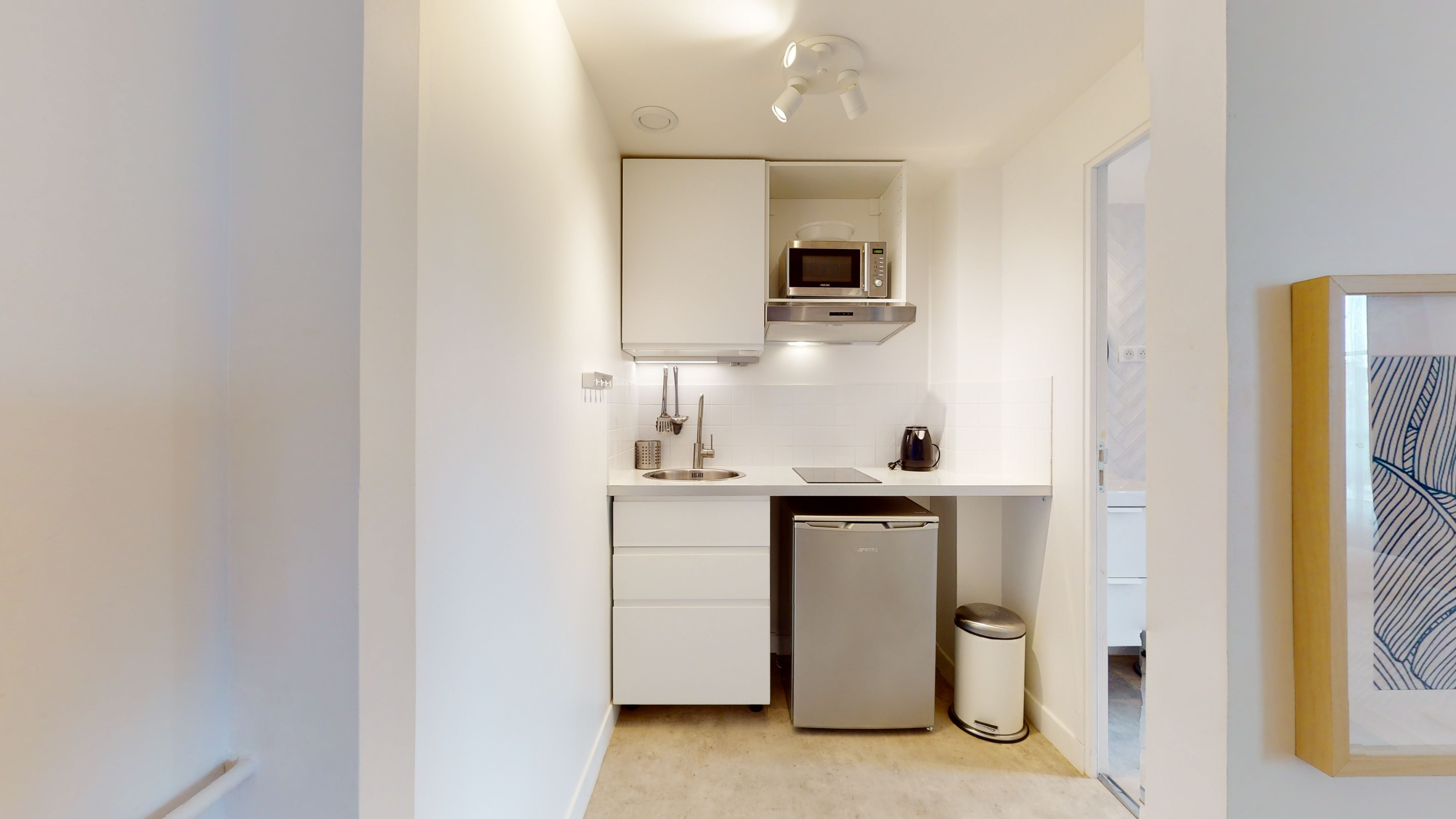 Le XL Studio 10, situé au 2ème étage, est un espace personnel juste pour vous. Avec une superficie de 15m², il comprend une cuisine privée et une salle de bain avec douche. Le studio est meublé d'un lit double avec rangements intégrés, d'une penderie pour vos vêtements, d'un fauteuil confortable et d'une table pratique. Vous y trouverez aussi tout ce dont vous avez besoin pour vivre confortablement : micro-ondes, machine à café, réfrigérateur, plaques de cuisson, bouilloire et même des ustensiles de cuisine.