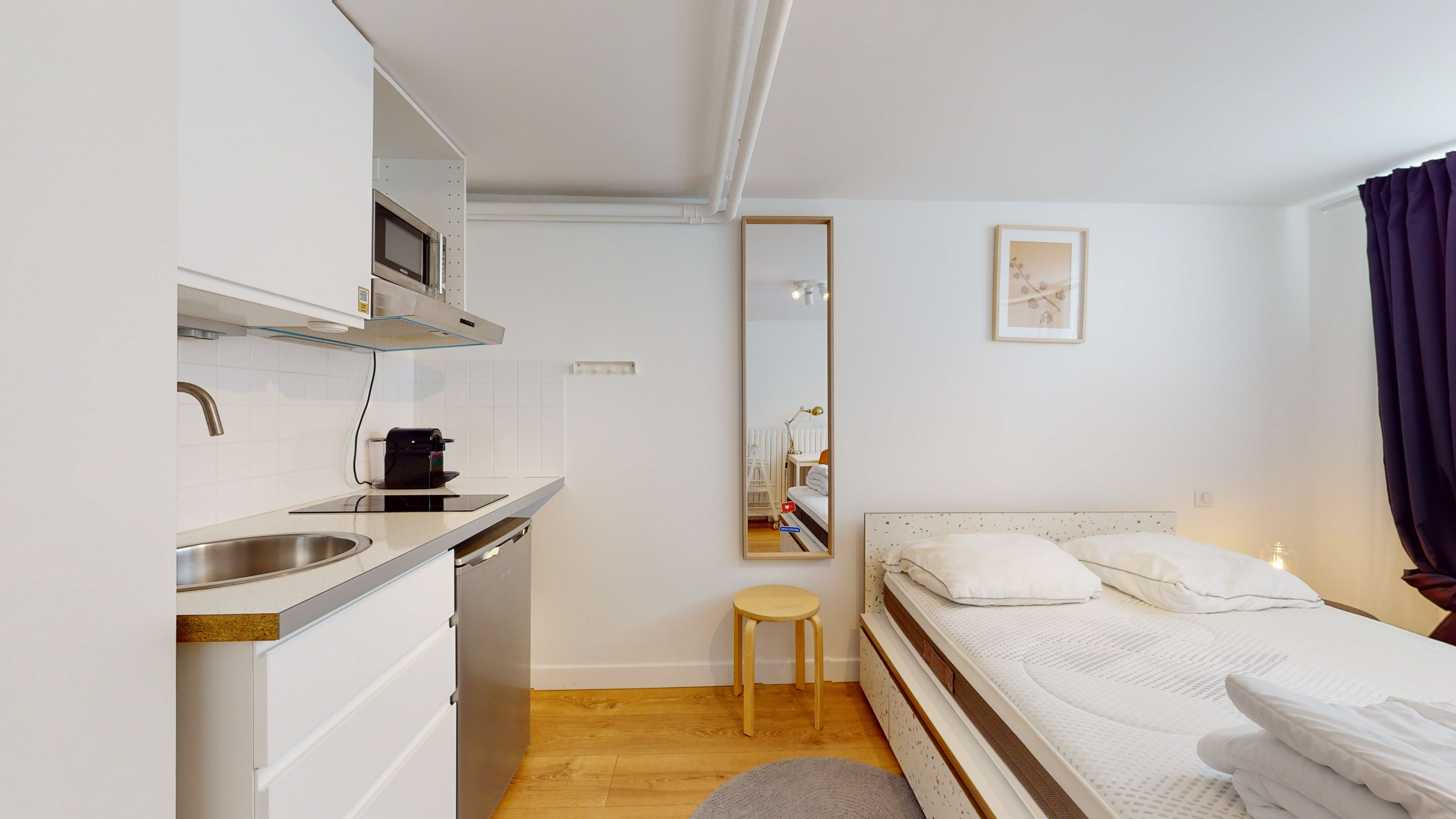 Le Studio 14 est votre espace personnel au sein de "Woods". Situé au sous-sol, ce studio de 16m² est conçu pour une personne et offre tout le confort nécessaire : un lit double avec rangements intégrés, une penderie spacieuse, un fauteuil confortable et une table pratique. La cuisine privée est équipée de tout ce dont vous avez besoin pour cuisiner : plaques de cuisson, réfrigérateur, micro-ondes et même une machine à café pour bien démarrer la journée. La salle de bain privée comprend une douche moderne, et le studio bénéficie également d'un chauffage par radiateur.