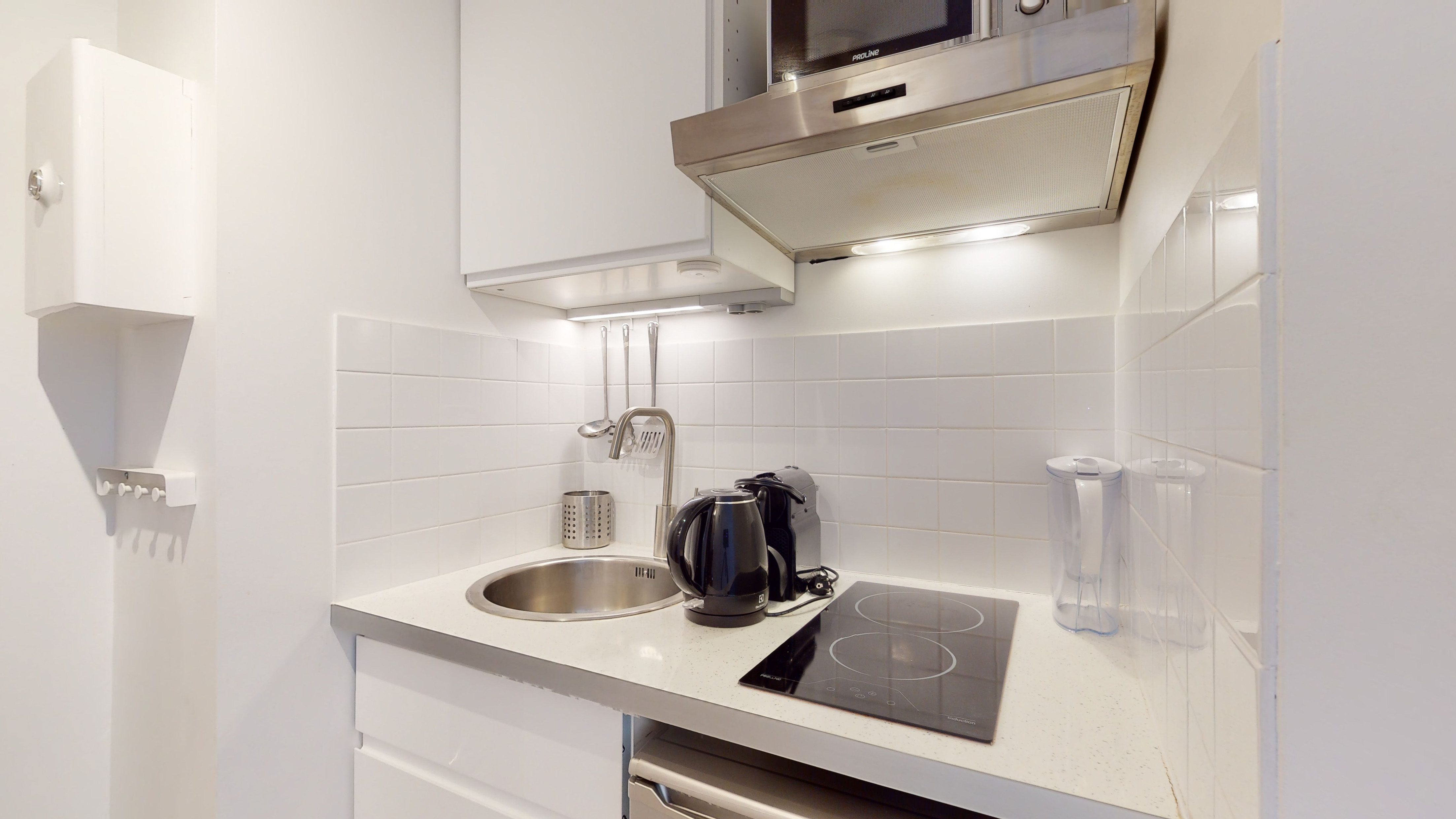 Le XL Studio 7, situé au premier étage, est un espace personnel conçu pour une personne. Avec ses 19m², il comprend une cuisine privée et une salle de bain attenante. Le studio est meublé d'un lit double avec rangements intégrés, d'une penderie spacieuse, d'un fauteuil confortable et d'une table pratique. Vous bénéficierez également d'équipements tels qu'une bouilloire, un micro-ondes, des plaques de cuisson, un réfrigérateur et une machine à café pour votre confort quotidien.