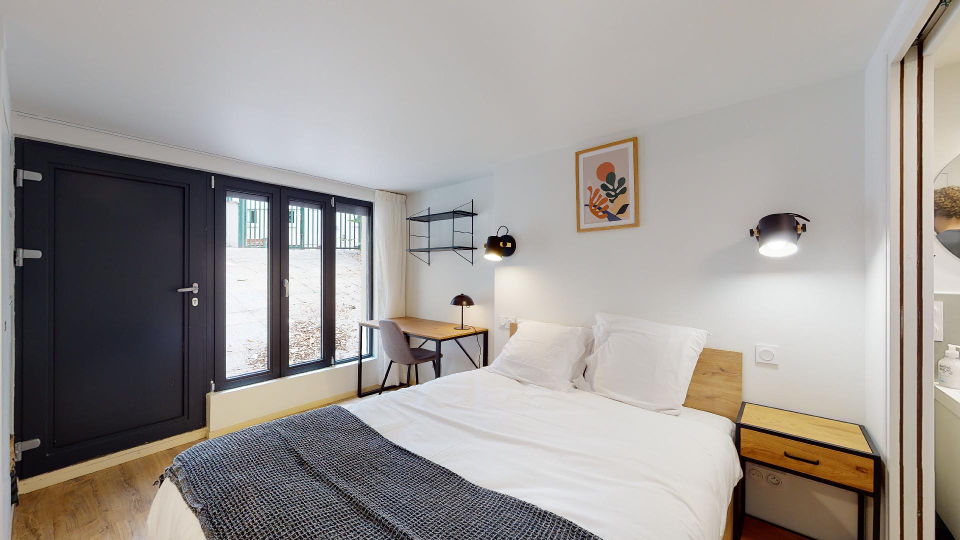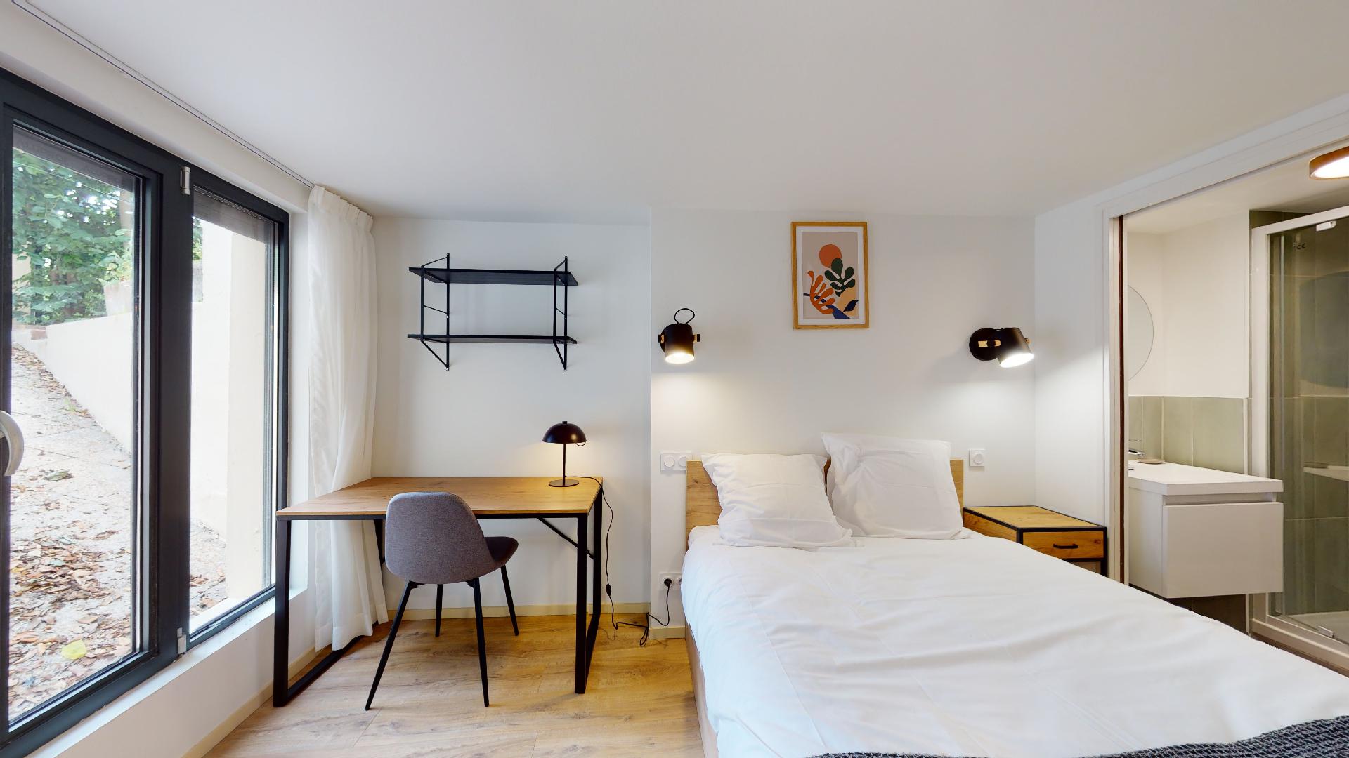 Le studio pour une personne - 4, situé au sous-sol, est un cocon privé de 18m2. Il est équipé d'un lit double confortable avec de la literie de qualité, une armoire pour vos affaires, un petit bureau avec chaise pour travailler ou étudier, et même un coin repas meublé. La salle de bain privée dispose d'une douche moderne. Vous bénéficiez également d'un radiateur pour rester au chaud, d'un micro-ondes, d'un frigo et de tout le nécessaire pour cuisiner.