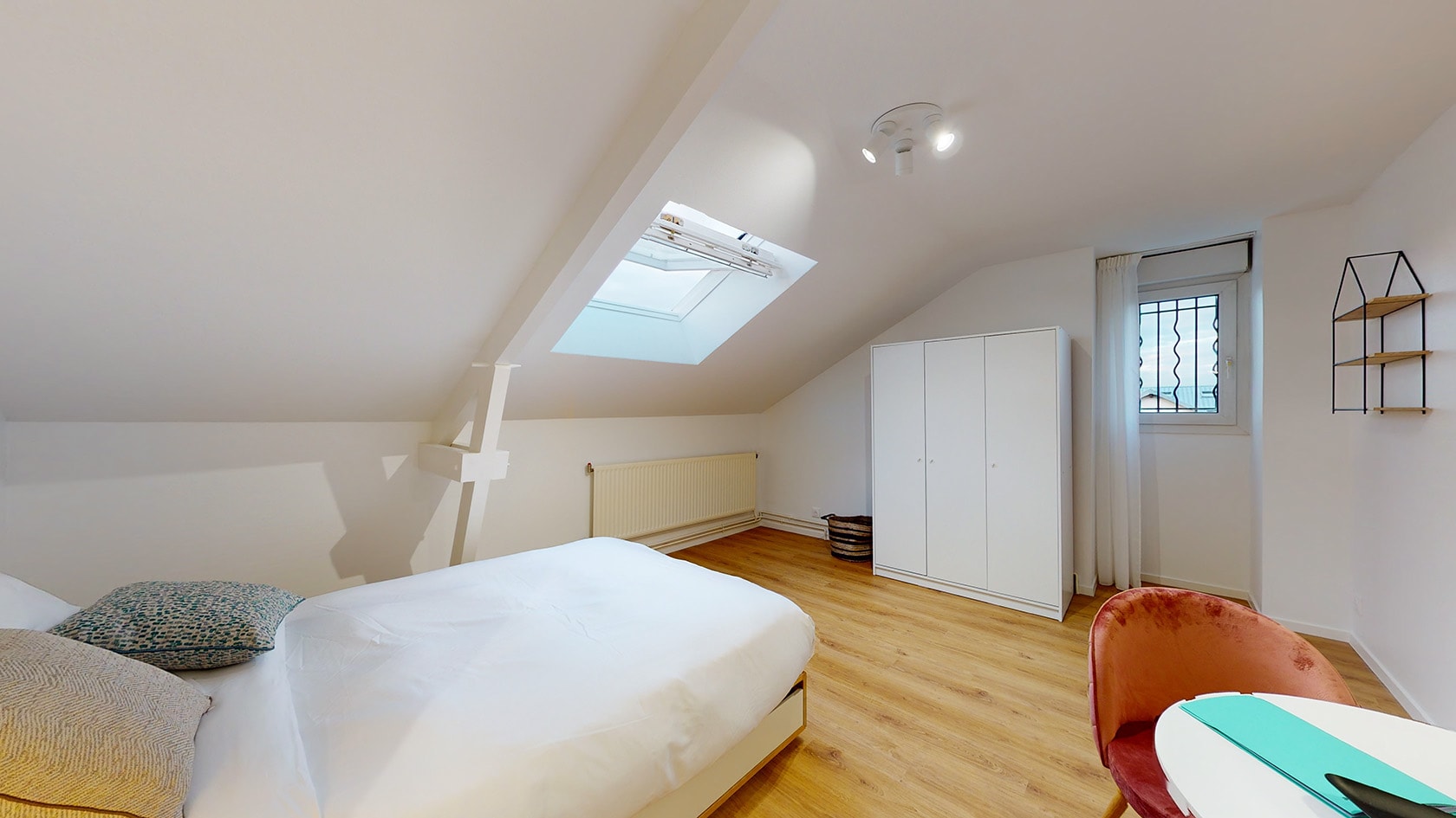 La chambre 8, située au deuxième étage, est un cocon juste pour vous. Avec ses 17m², elle est meublée d'un lit double confortable avec rangement intégré, d'une penderie pour vos vêtements, d'une table et d'une chaise pour vos moments de travail ou de lecture. La chambre bénéficie également d'un radiateur pour rester au chaud et d'une salle de bain partagée avec une autre personne, équipée d'une douche.
