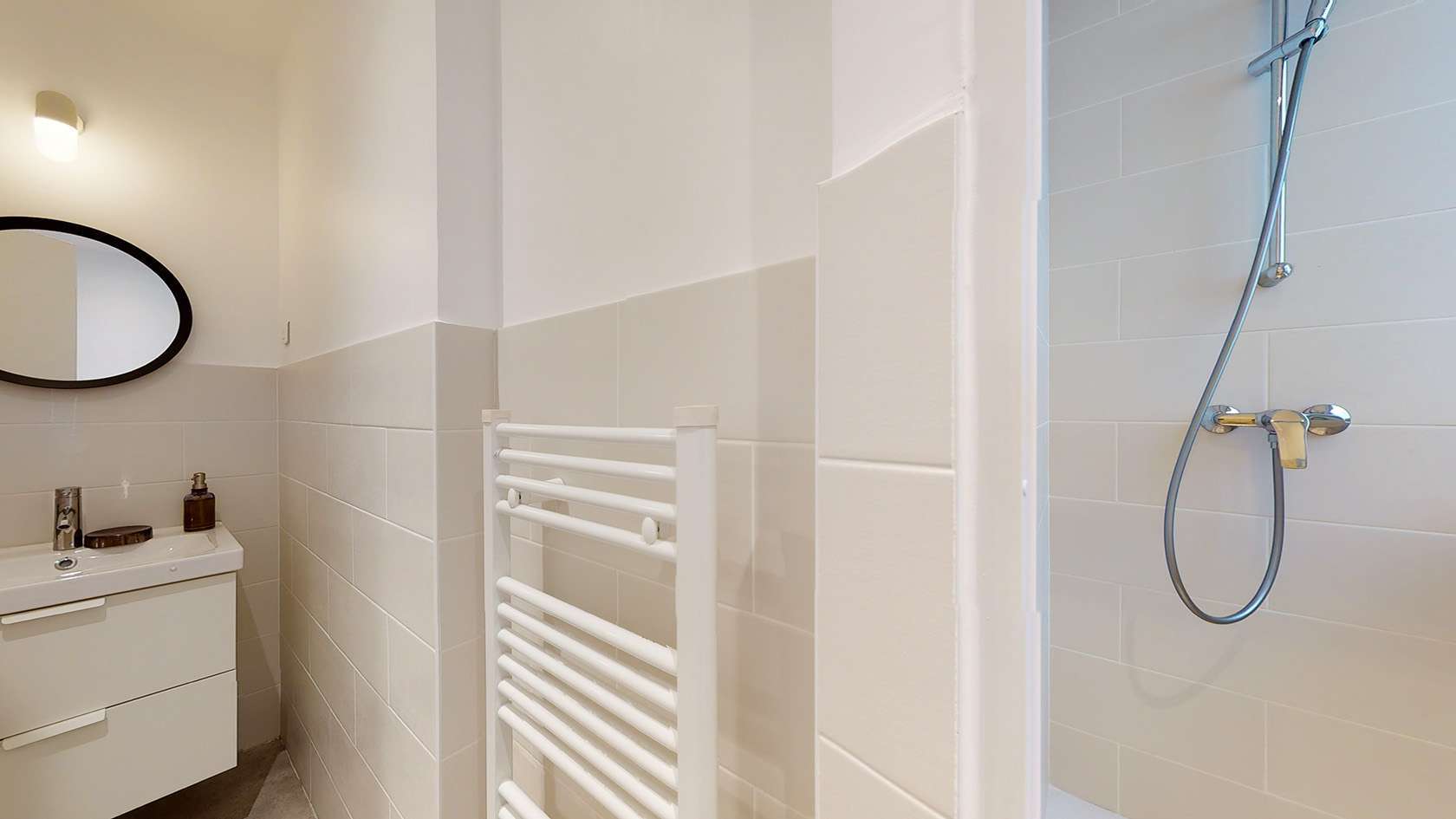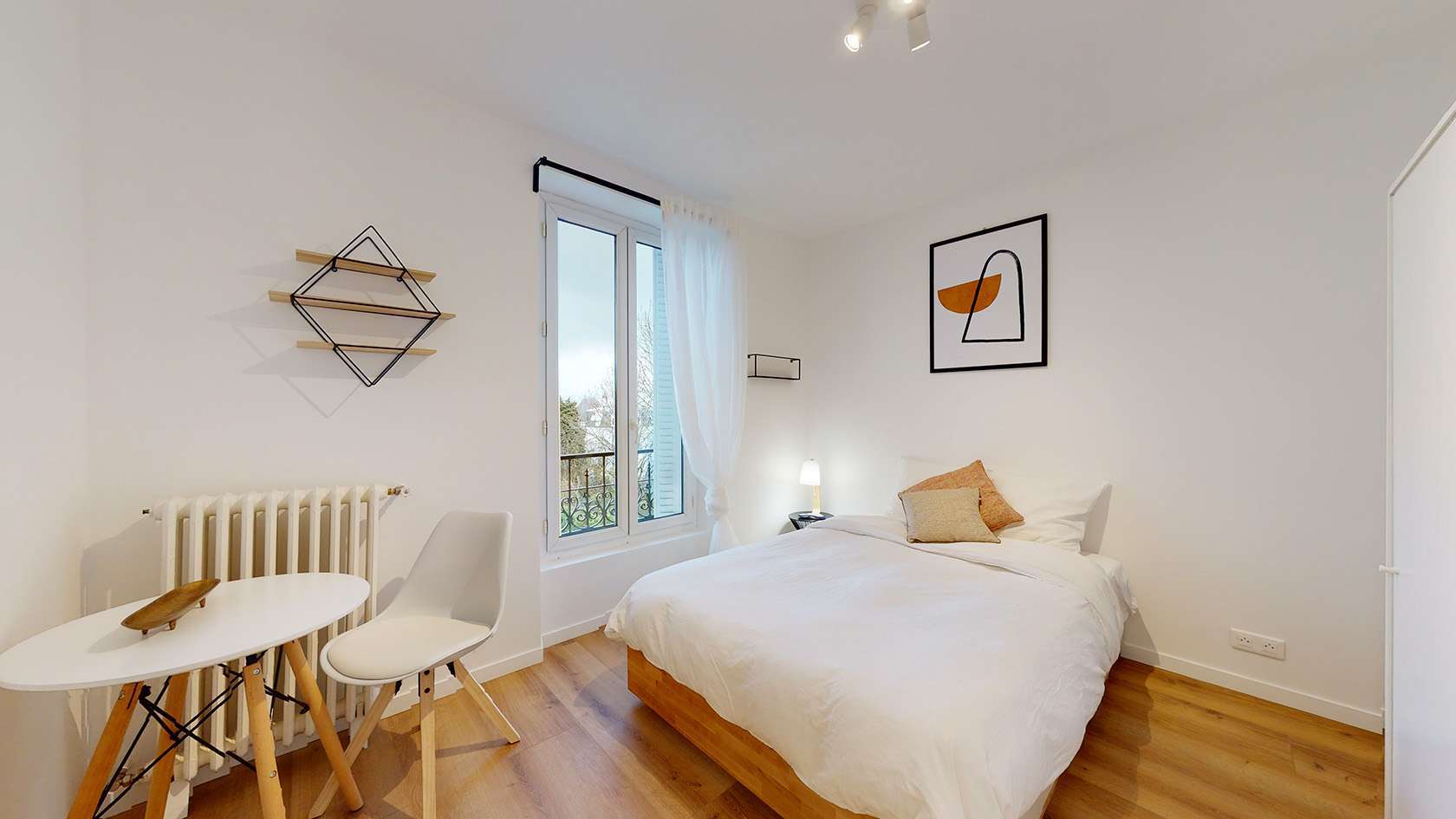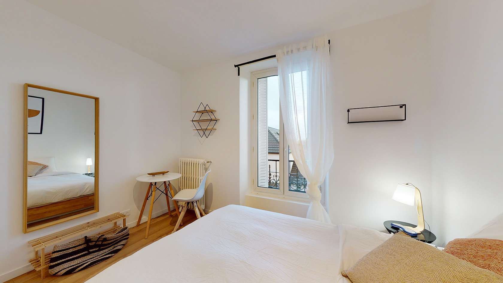 La Chambre 3, située au premier étage, est un cocon juste pour vous. Elle est meublée d'un confortable lit double avec rangement intégré, d'une armoire pour vos affaires, ainsi que d'une table et d'une chaise pour vos moments de travail ou de lecture. La chambre bénéficie d'une lumière douce grâce à une lampe de chevet et d'un radiateur pour rester au chaud durant les mois froids. Vous partagerez une salle de bain moderne avec douche et lavabo avec un autre locataire.