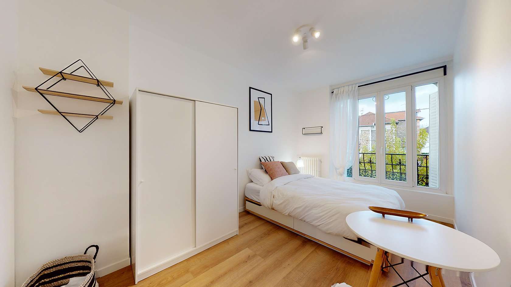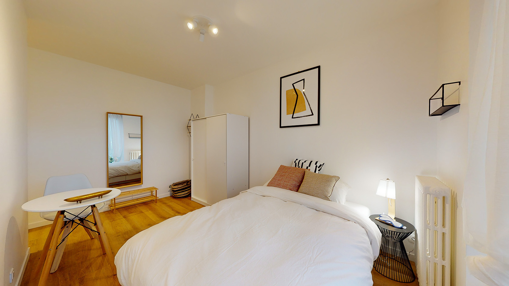 La Chambre 4, située au premier étage, est parfaite pour une personne. Elle est équipée d'un lit double confortable avec rangement intégré, d'une armoire pour vos affaires, ainsi que d'une table et d'une chaise pour travailler ou étudier. La chambre partage une salle de bain moderne avec douche avec un autre locataire, garantissant confort et intimité.