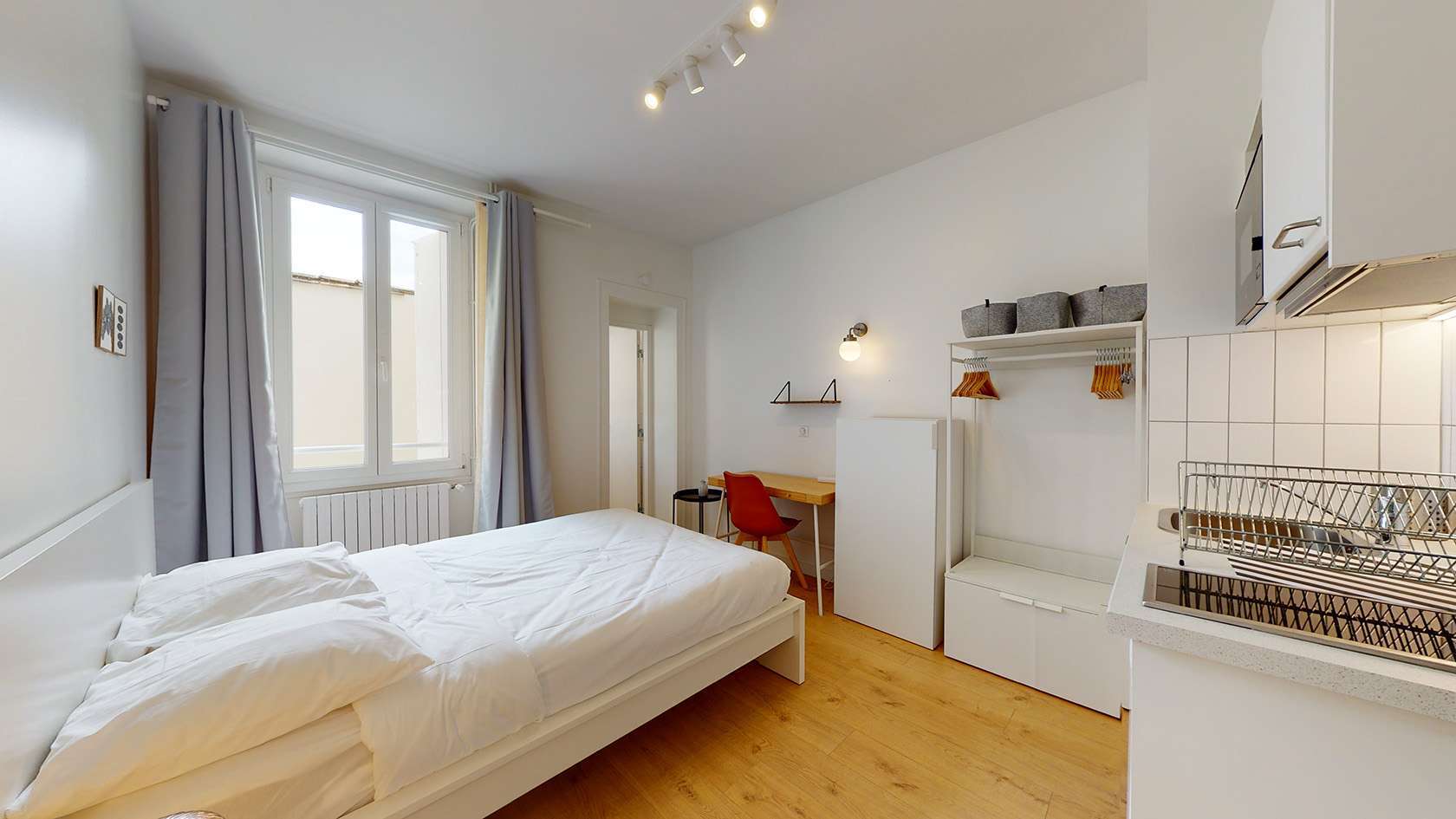 Le Studio 7, situé au premier étage, est parfait pour une personne. Il comprend un lit double confortable avec rangement intégré, une armoire spacieuse, un bureau et une chaise pour travailler ou étudier. La salle de bain privée est équipée d'une douche moderne. Vous bénéficiez également d'un coin grignotage avec frigo, plaques de cuisson, hotte et bouilloire, sans oublier la vaisselle fournie.