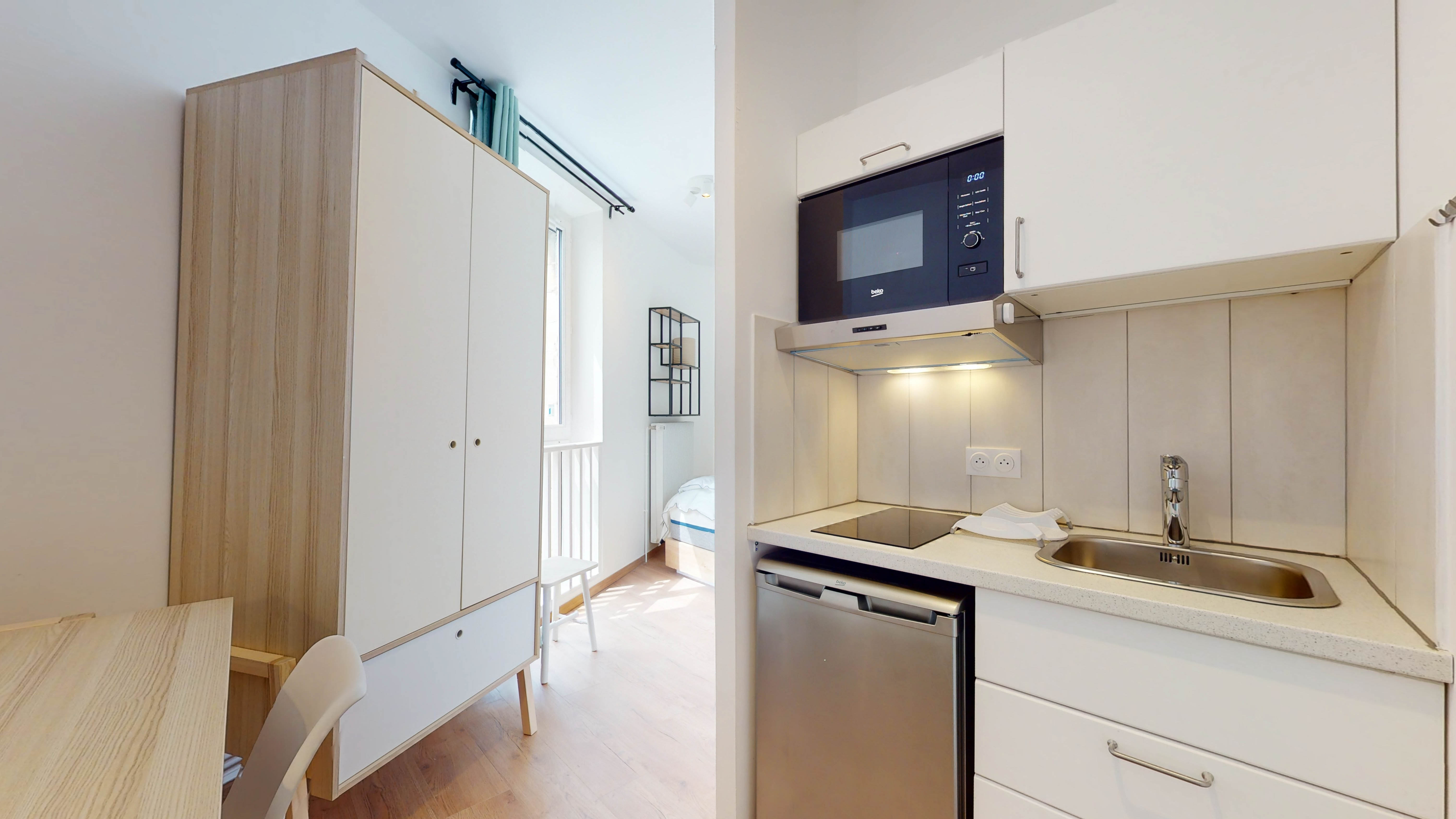 Le Studio 12, situé au premier étage, est un cocon parfait pour une personne. Avec sa salle de bains privée comprenant une douche et un lavabo, ce studio offre également un coin grignotage pour vos petites faims. Le confort n'est pas en reste grâce à un lit double, une armoire pour vos affaires, une table et un petit bureau pour travailler ou étudier. Le chauffage par radiateur assure une température agréable toute l'année.
