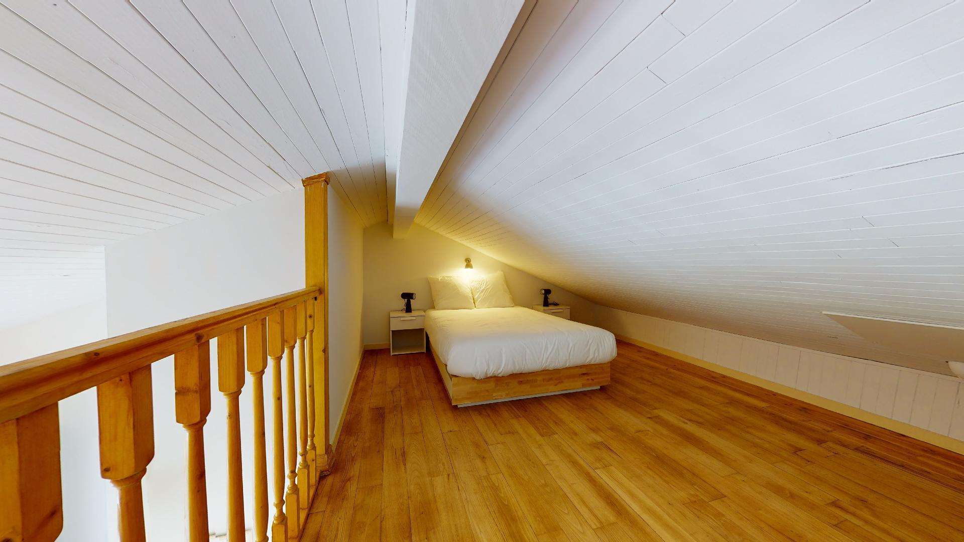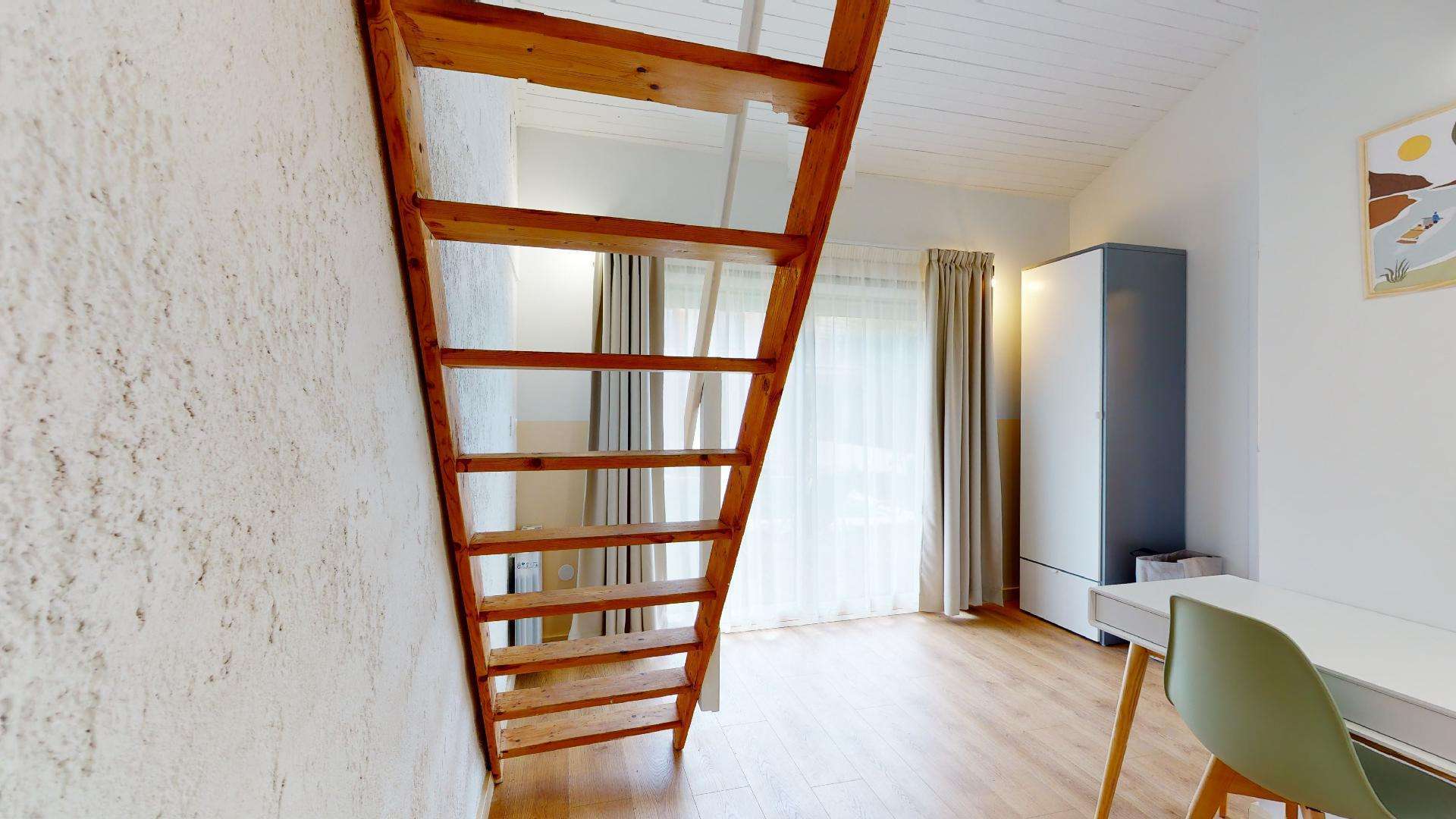 La chambre "Room for one person - 12" est un cocon personnel de 16m² situé à l'étage de la mezzanine. Elle est équipée d'un lit double en hauteur avec rangement intégré, d'une armoire spacieuse, d'une table pratique, d'une chaise et d'un fauteuil confortable pour vos moments de détente. La salle de bain privée comprend une douche moderne, un lavabo et des toilettes. La chambre bénéficie aussi d'un radiateur pour les jours plus frais et d'une lampe de chevet pour vos lectures nocturnes.
