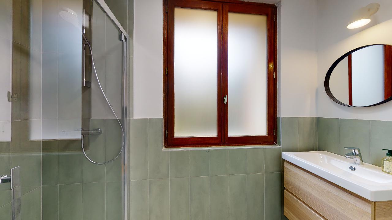 La chambre "Room for one person - 3", située au premier étage, est conçue pour offrir confort et intimité. Avec ses 13m², elle dispose d'un lit double avec rangement intégré, d'une armoire spacieuse pour vos affaires, d'une chaise et d'un bureau pour travailler ou étudier. La salle de bain privée est équipée d'une douche moderne. La chambre bénéficie aussi d'un radiateur pour les jours plus frais et de linge de lit de qualité supérieure.