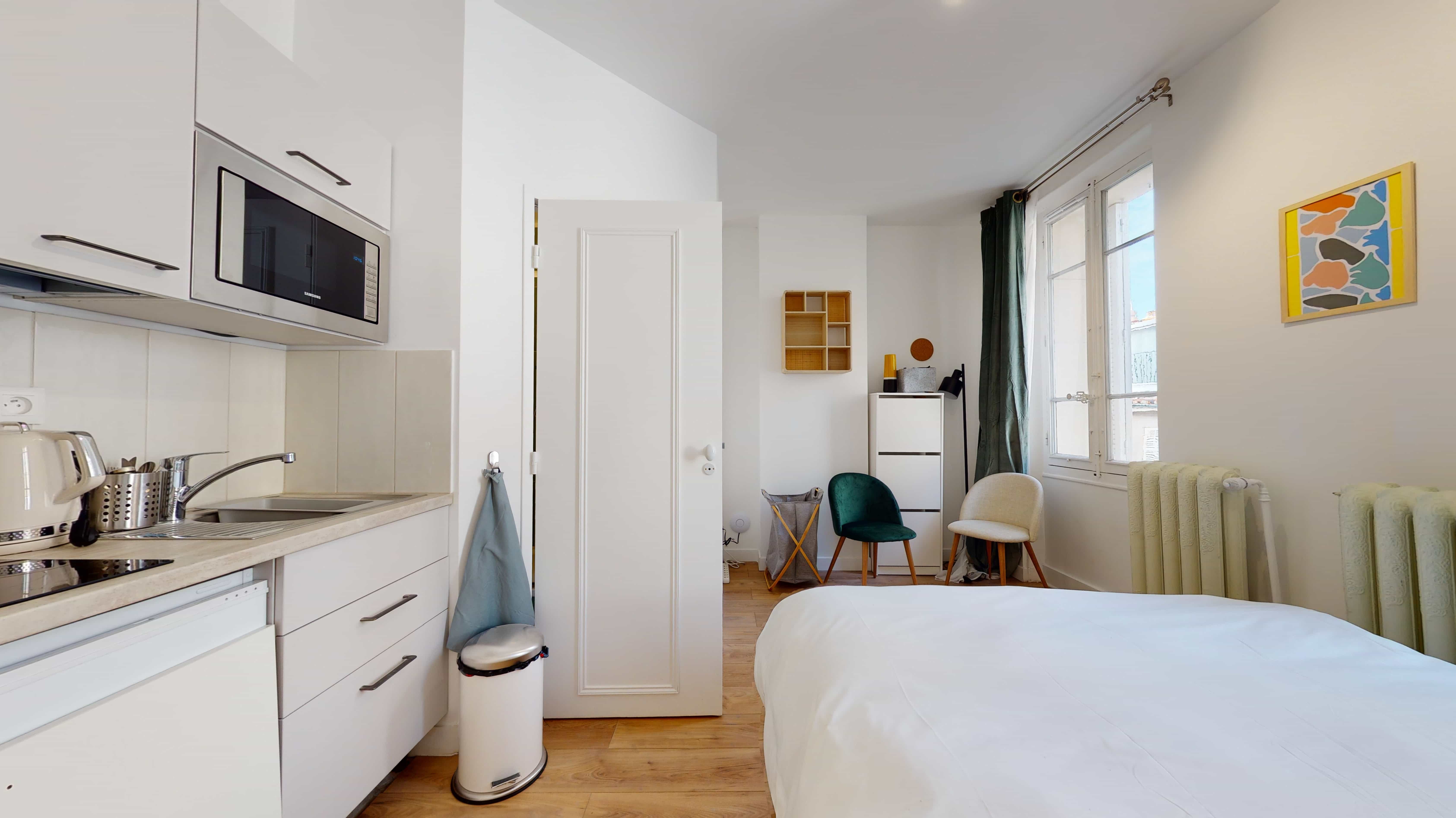 Le Studio for one person - 11, situé au deuxième étage, est un cocon parfait pour une personne. Il comprend une kitchenette privée pour préparer vos en-cas, une salle de bain rien que pour vous, et est meublé avec un lit confortable, un fauteuil douillet, un bureau pratique et une penderie pour vos affaires. La chambre est également équipée d'un micro-ondes, d'un réfrigérateur et d'une bouilloire pour vos besoins quotidiens.