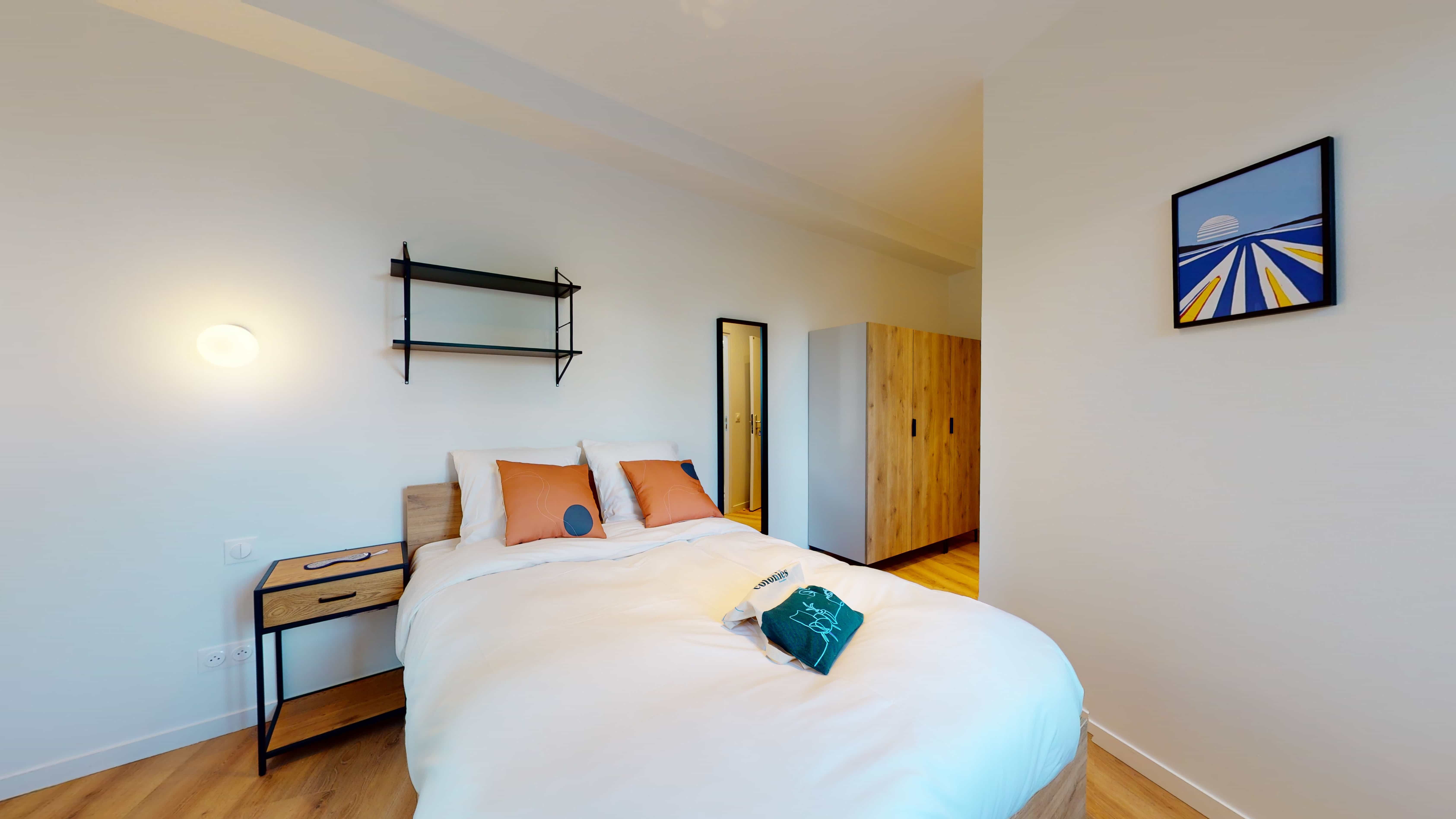 La chambre "Room for one person - 16" est un cocon douillet de 17m² situé au rez-de-chaussée. Elle est parfaitement aménagée pour une personne avec un lit confortable doté de rangements, un bureau pour travailler, une chaise, une penderie pour vos vêtements et une salle de bain privative avec douche. La qualité de la literie et le soin apporté aux détails vous garantissent un espace personnel agréable et fonctionnel.