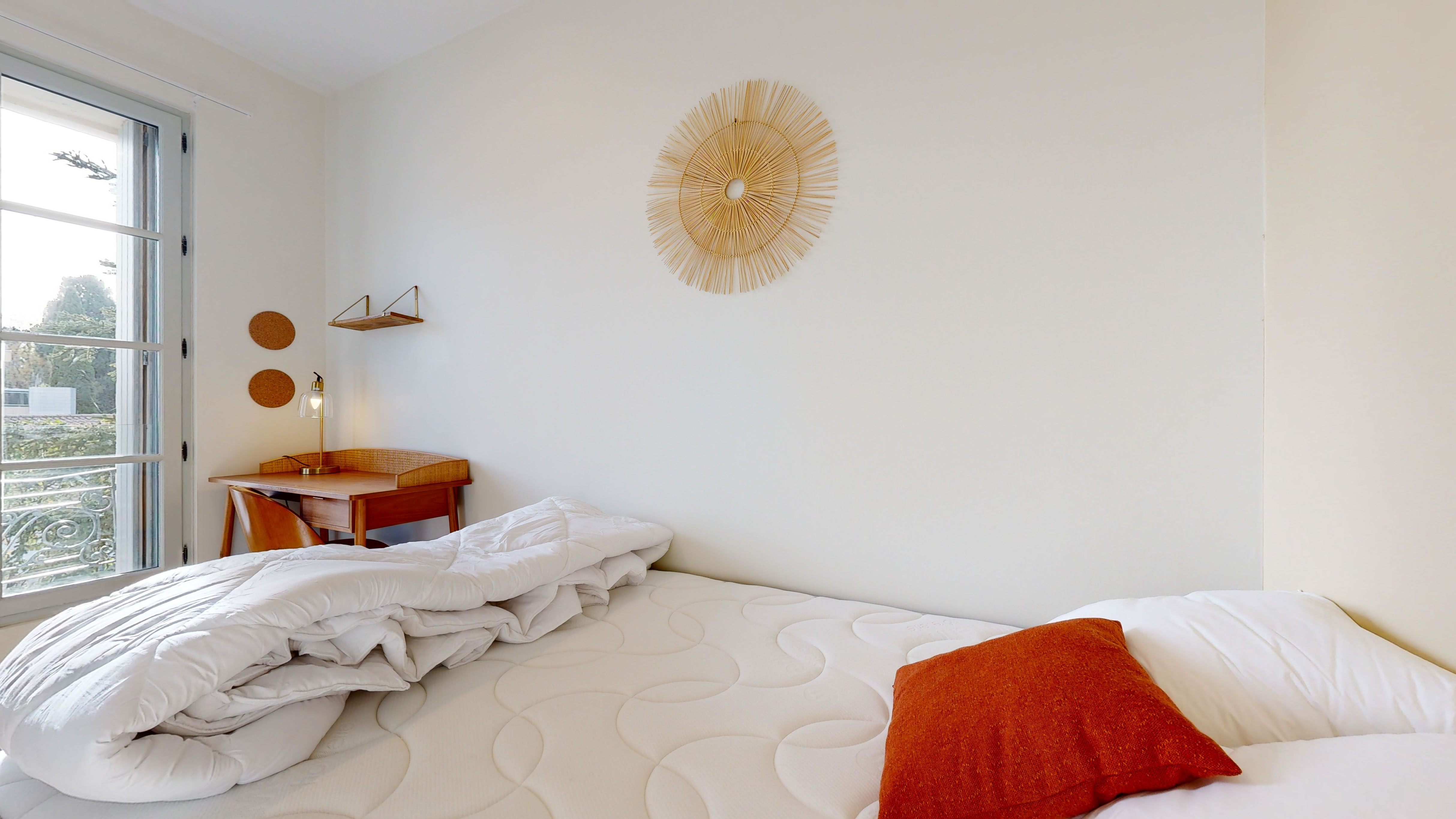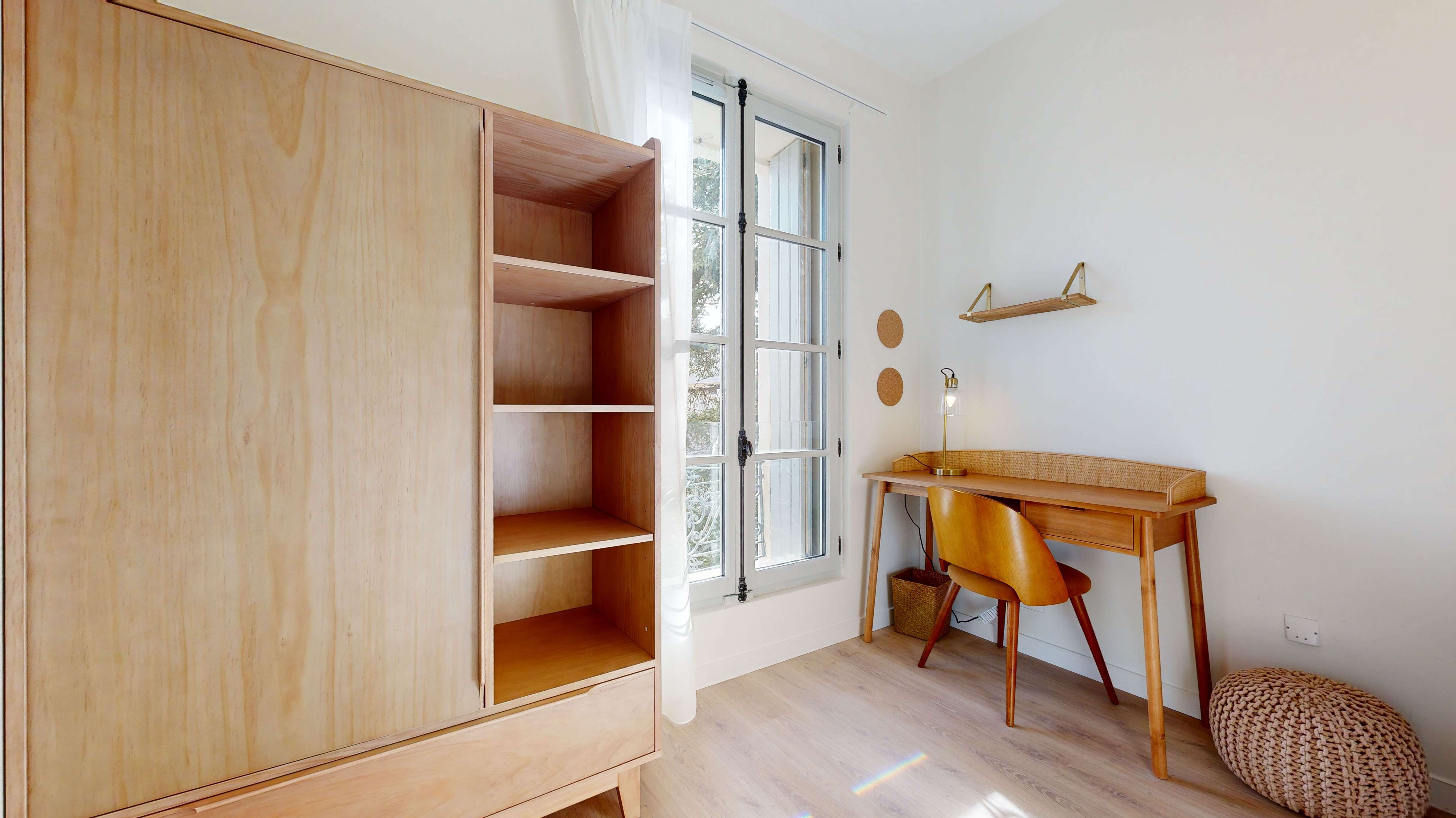 Votre future chambre, la "Room for one person - 13", est un cocon douillet situé au deuxième étage. Elle est parfaitement aménagée pour une personne avec un lit double confortable, une armoire pour vos affaires, un bureau et une chaise pour travailler ou étudier. La chambre partage une salle de bain moderne avec douche avec un autre locataire.