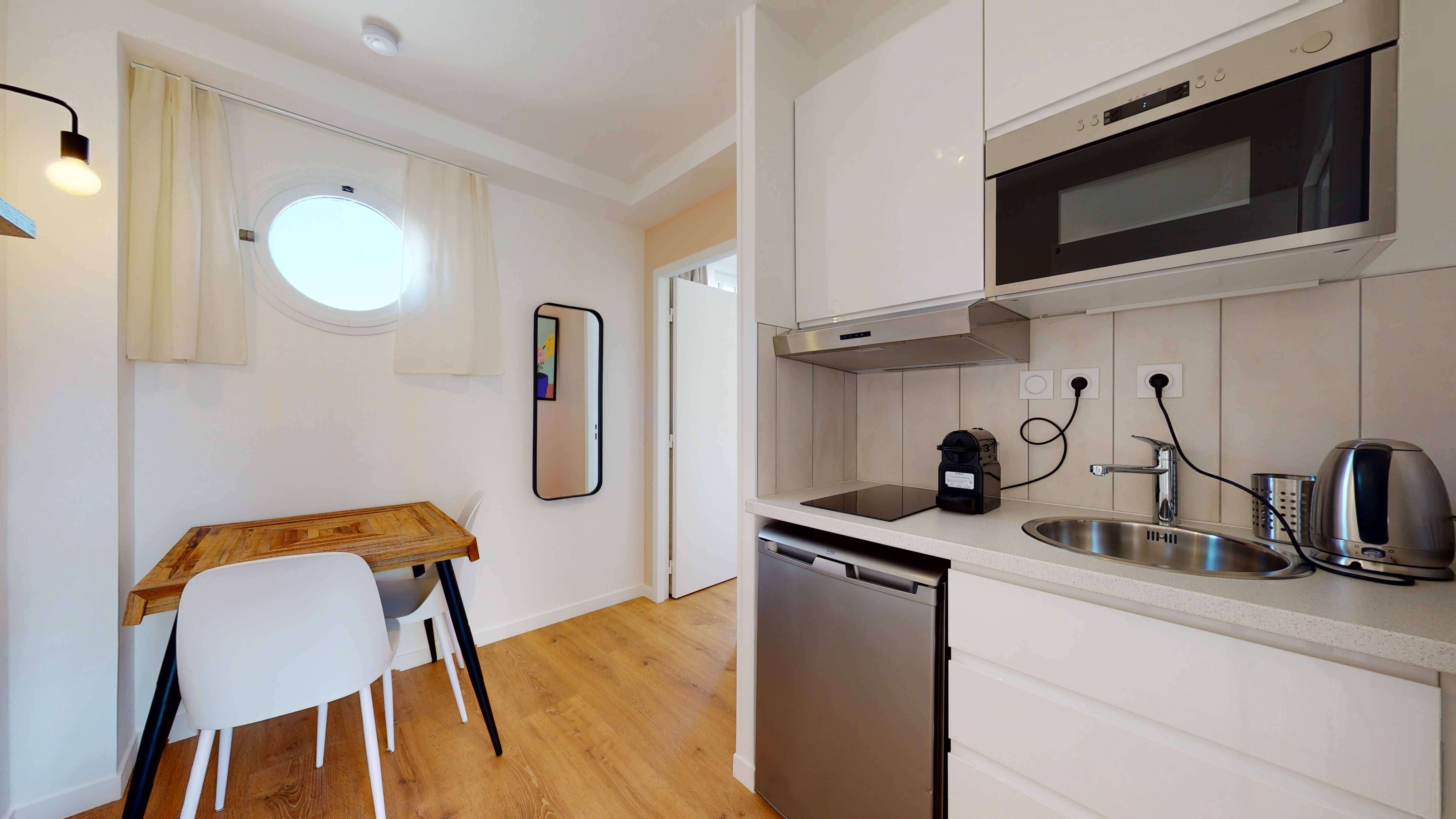Le T2 Apartment for two people - 6, situé au premier étage, est parfait pour deux personnes. Il offre un espace de couchage confortable avec un lit double et une armoire pour ranger vos affaires. La salle de bain privée est équipée d'une douche moderne et d'un lavabo. L'appartement dispose aussi d'un coin repas pratique et est entièrement équipé avec tout ce dont vous avez besoin : plaques de cuisson, micro-ondes, réfrigérateur, vaisselle, et même du linge de maison.