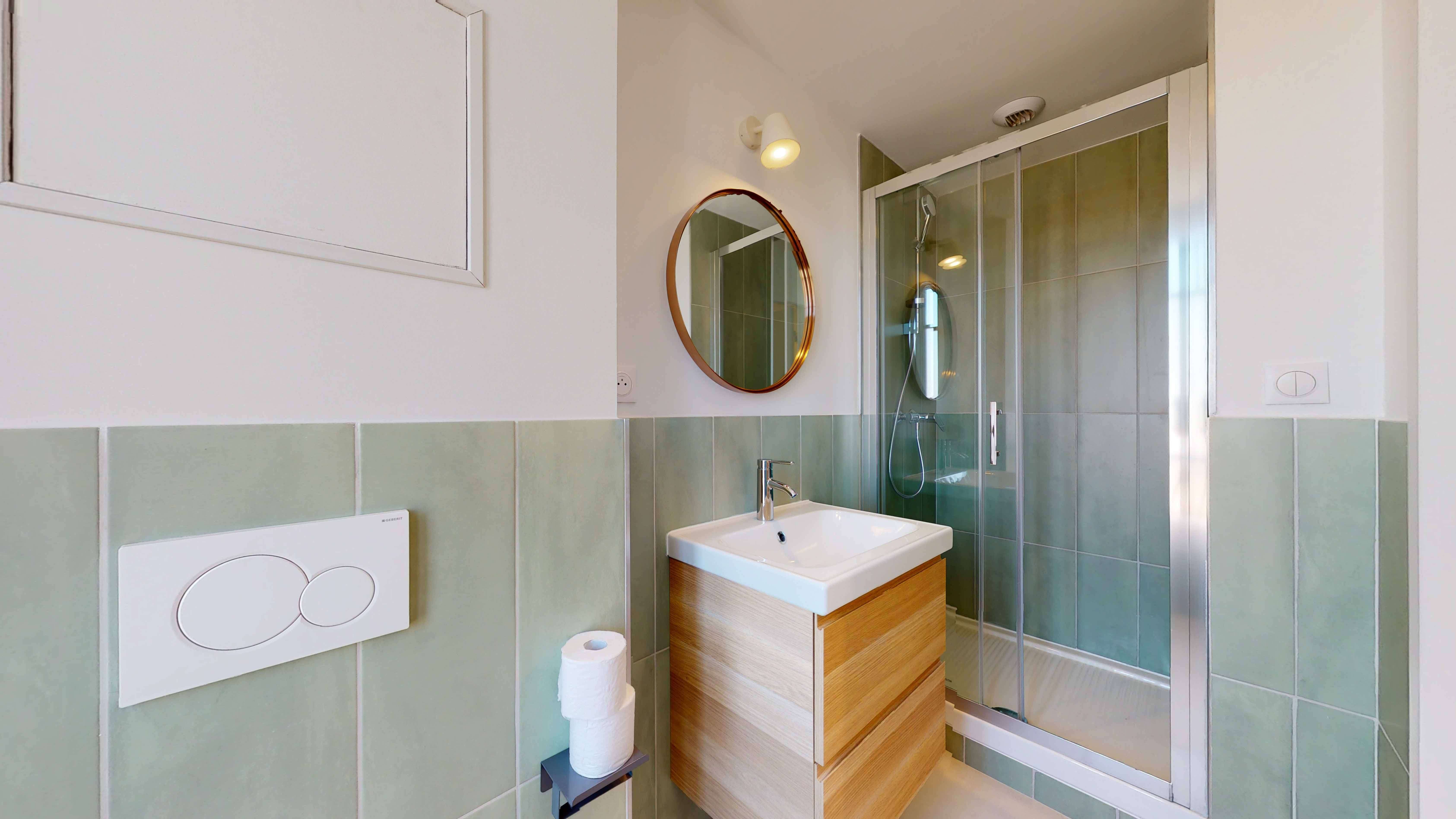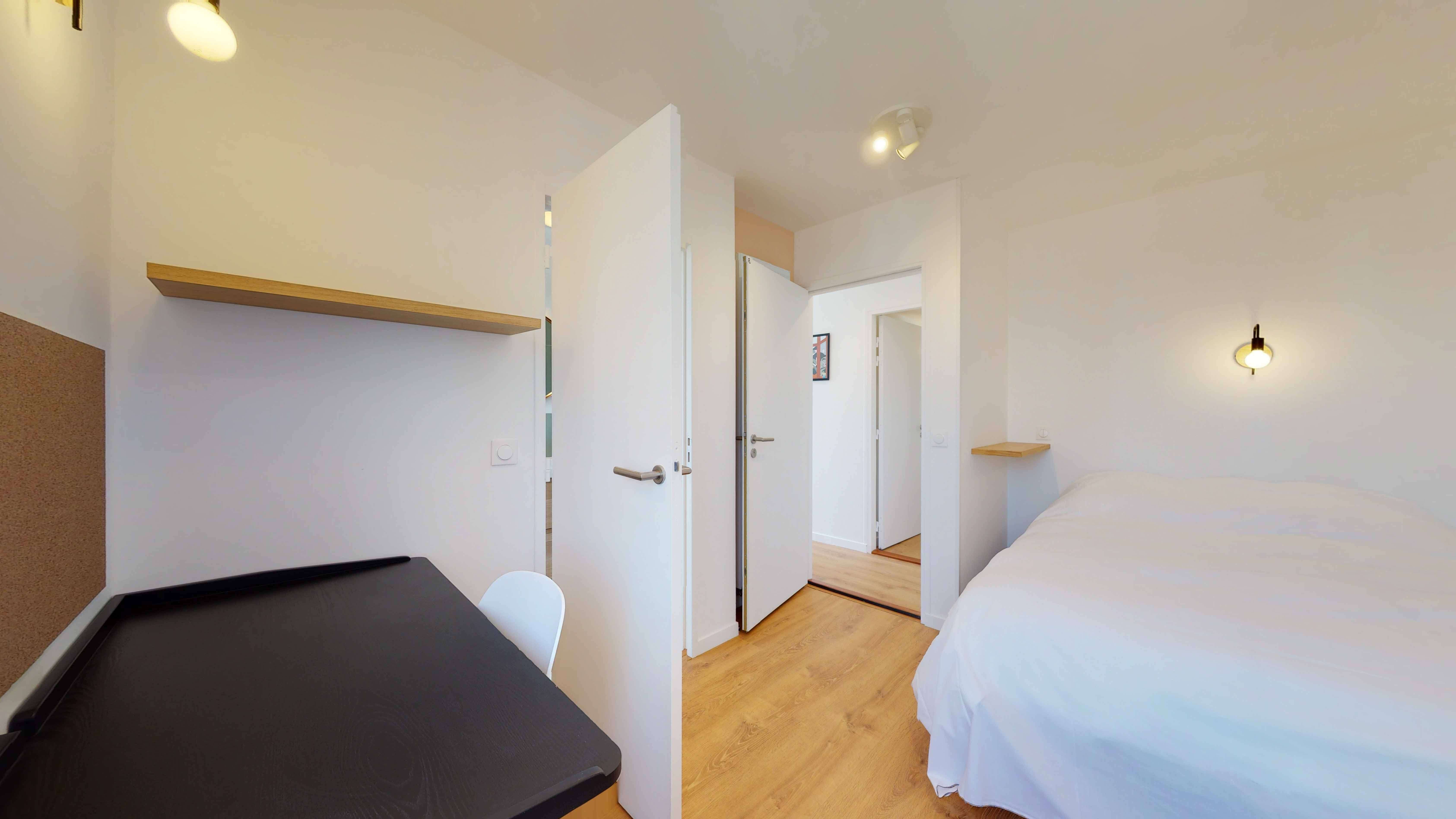 La chambre "Room for one person - 8", située au deuxième étage, est conçue pour offrir confort et intimité. D'une superficie de 13m², elle dispose d'un lit double avec rangement intégré et de literie de qualité pour assurer un sommeil réparateur. La chambre est également équipée d'une armoire pour vos vêtements, d'un bureau et d'une chaise pour travailler ou étudier, ainsi que d'un radiateur pour rester au chaud. La salle de bain privée comprend une douche moderne, un lavabo et des toilettes.