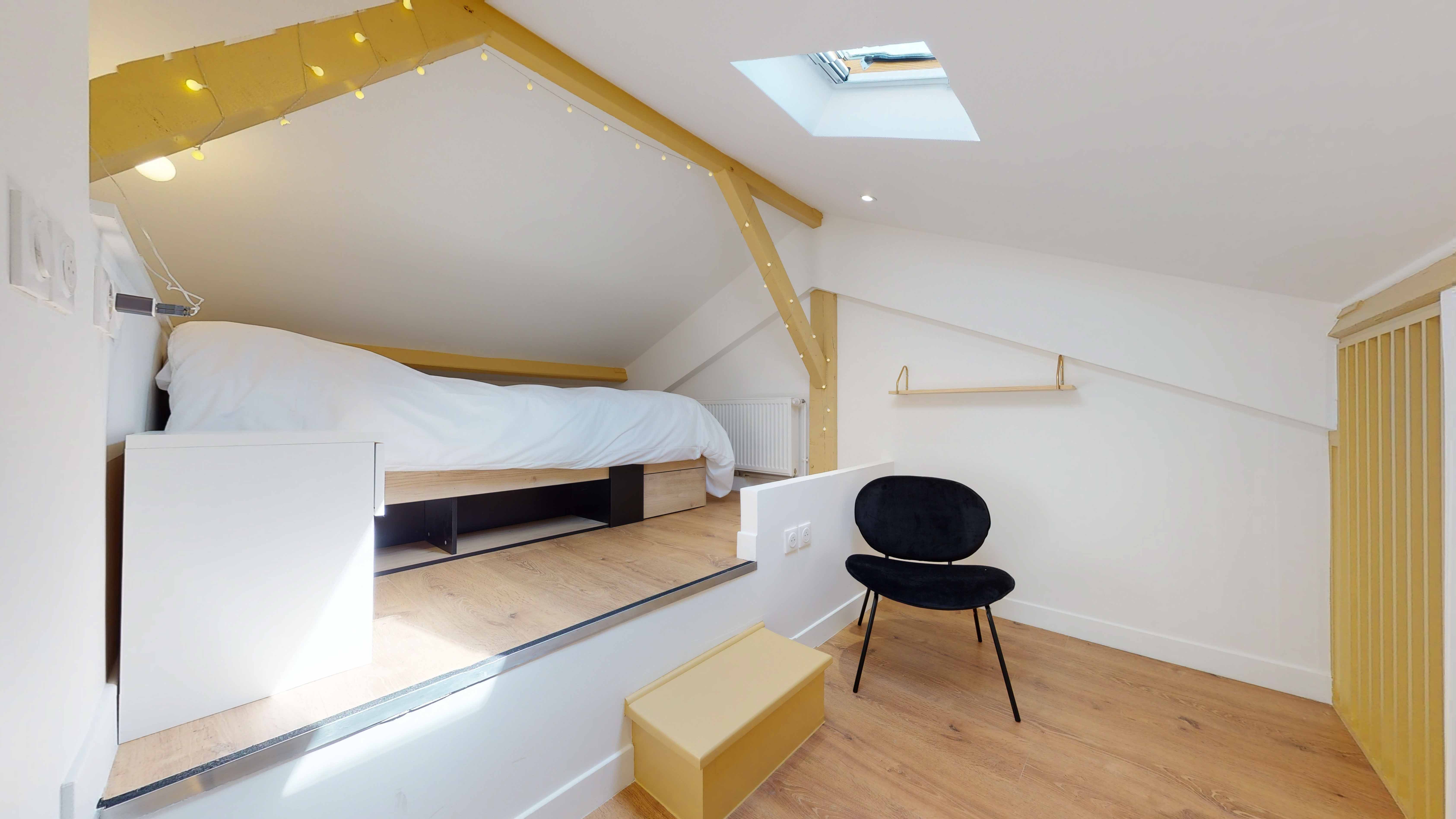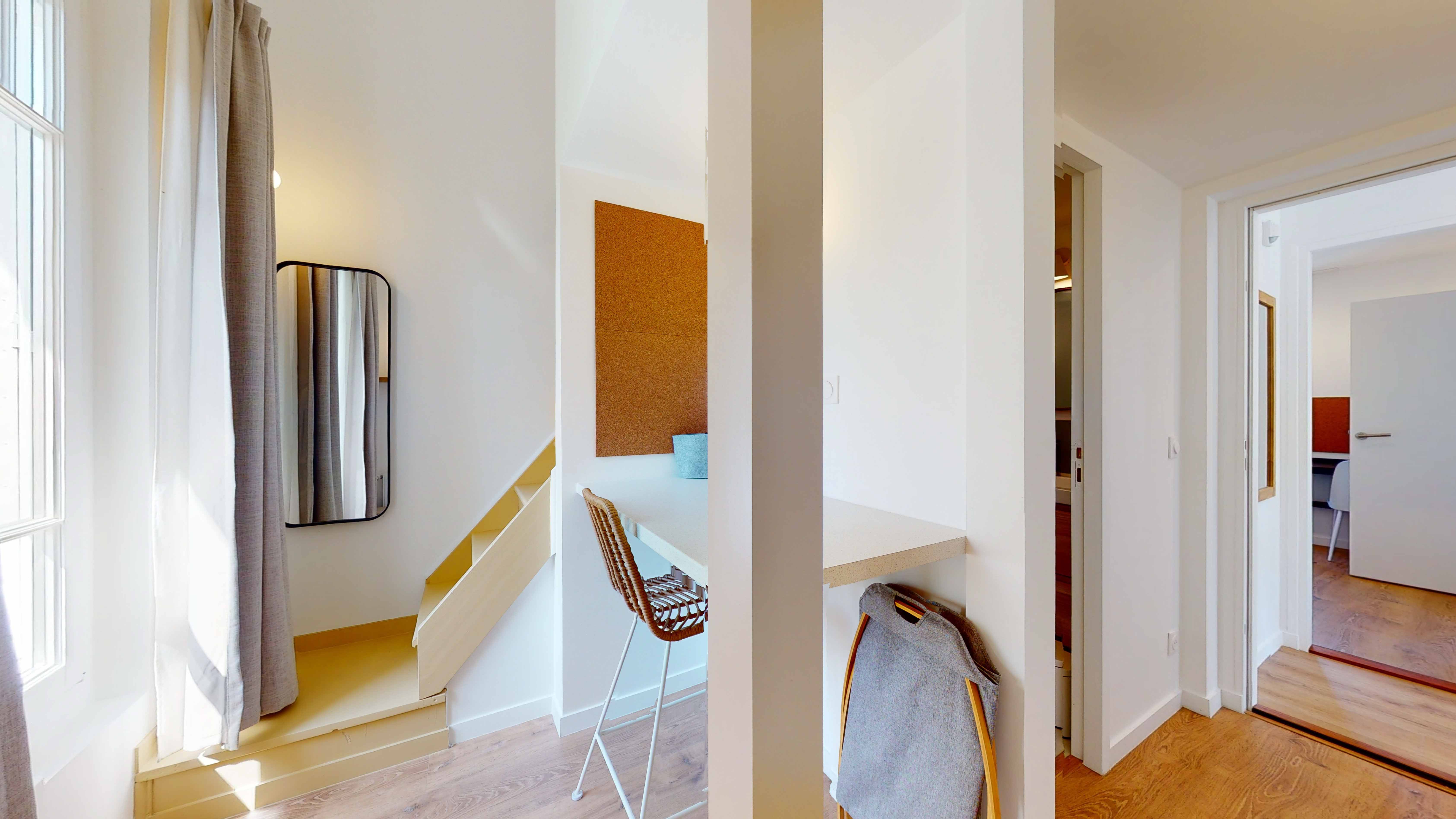 La chambre "Room for one person - 9" est un cocon douillet de 9m2 situé au deuxième étage. Elle est parfaite pour une personne avec tout ce qu'il faut : un lit double avec rangement intégré, une armoire pour vos vêtements, un bureau et une chaise pour travailler ou étudier, ainsi qu'une lampe de chevet. La chambre bénéficie aussi d'une salle de bain privée avec douche et d'une mezzanine pour maximiser l'espace. Le chauffage est assuré par un radiateur, et la literie de qualité vous promet de douces nuits.