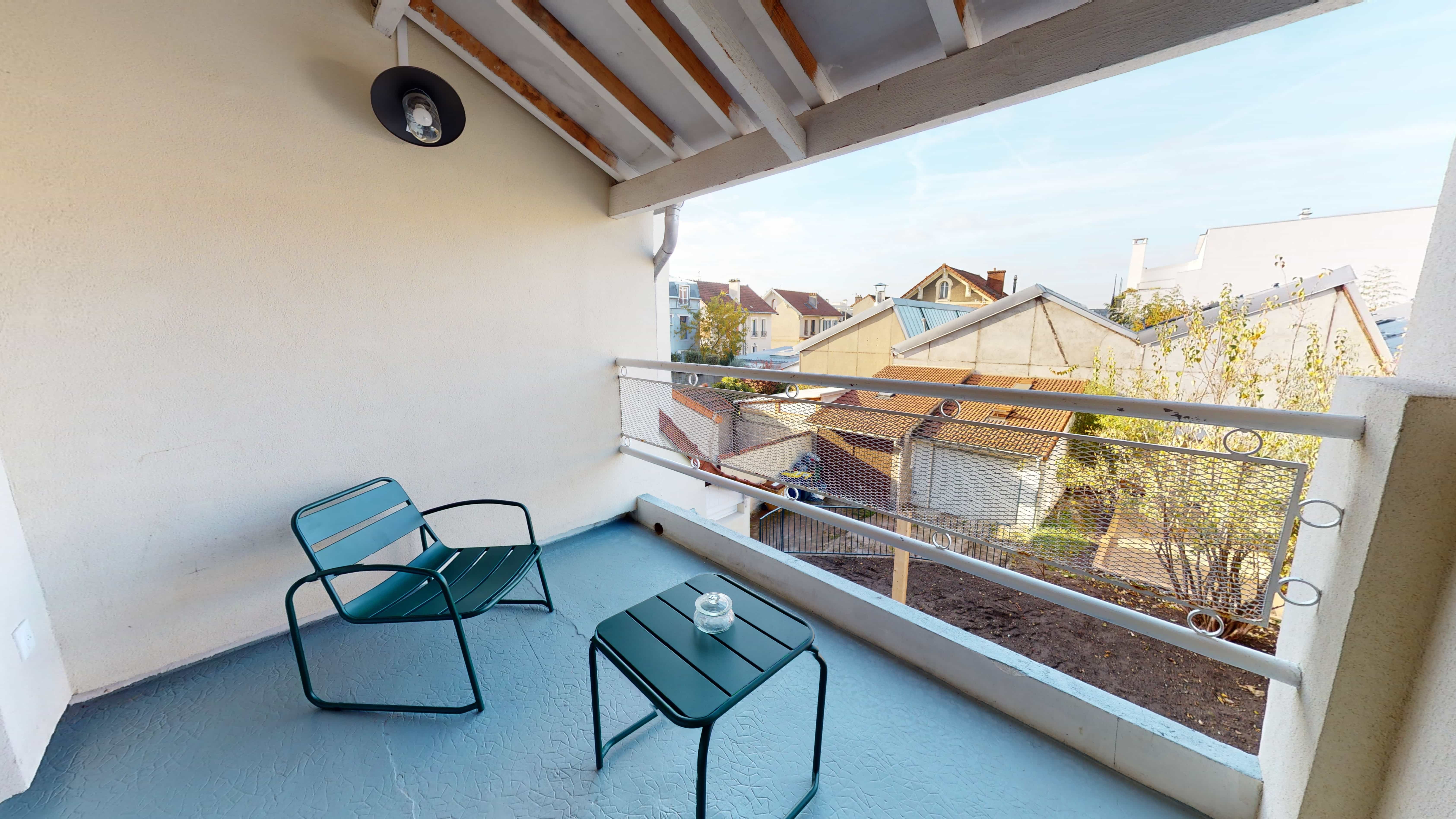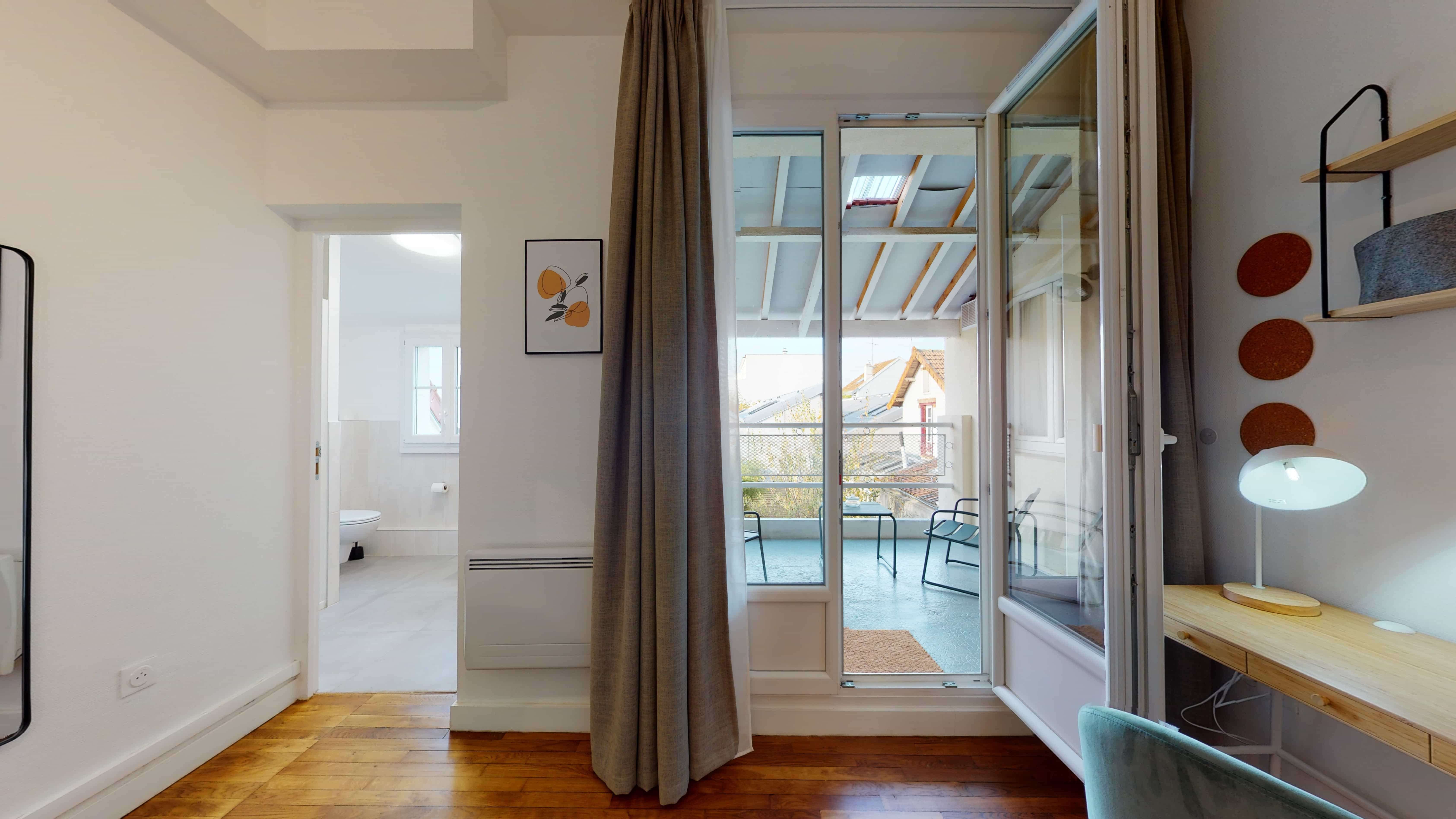 La chambre "Room for one person - 6", située au premier étage, est un cocon personnel de 17m² avec tout ce qu'il faut pour un confort optimal. Elle dispose d'un lit avec rangement intégré, d'une penderie spacieuse pour vos affaires, d'un bureau accompagné d'une chaise et de lampes pour vos soirées lecture ou travail. La salle de bain privée est équipée d'une douche, d'un lavabo et d'un radiateur pour rester au chaud. De plus, cette unité vous donne un accès direct à une terrasse partagée avec un autre locataire, idéale pour prendre l'air sans sortir de chez vous.