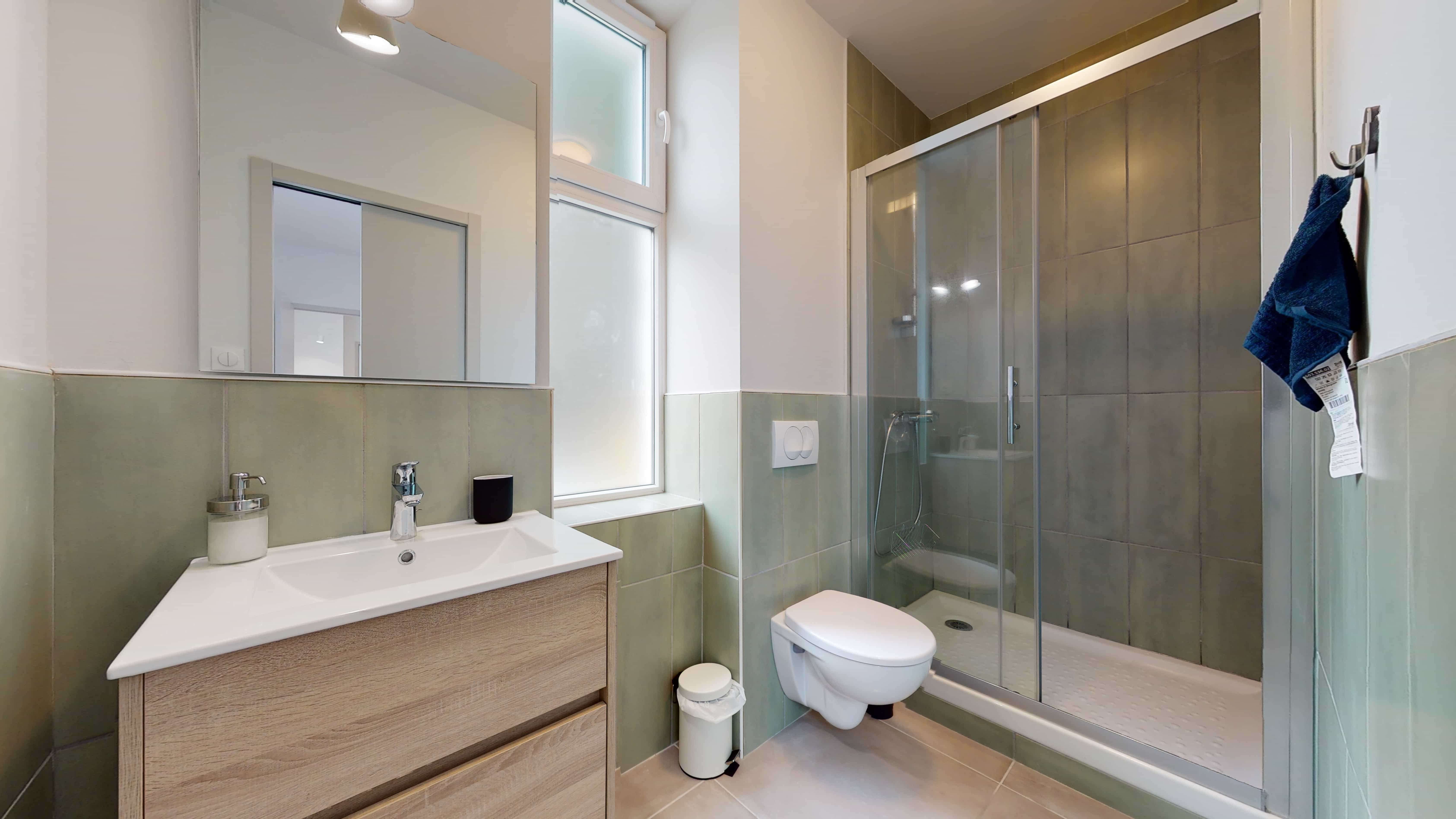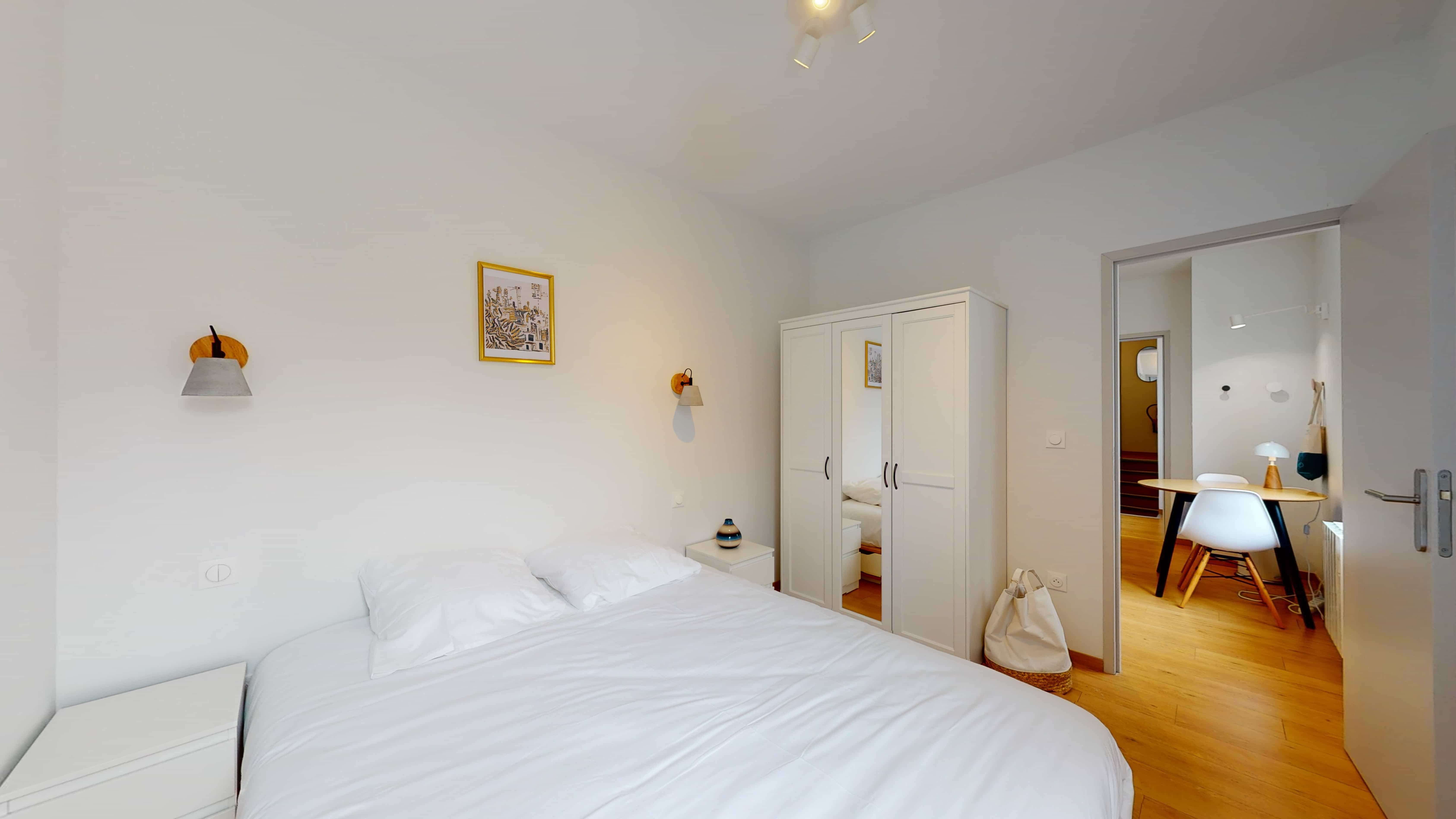 La chambre T2 for two people - 5, située au 1er étage, est parfaite pour deux personnes. Elle comprend une salle de bain privée avec douche et lavabo pour votre confort. La chambre est meublée d'un lit double avec rangement intégré, d'une penderie pour vos vêtements, d'une table et d'une chaise pour travailler ou étudier. Vous y trouverez aussi un frigo, un micro-ondes et une machine à café pour vos petites faims et pauses café. Le chauffage par radiateur vous garantit une température agréable toute l'année.