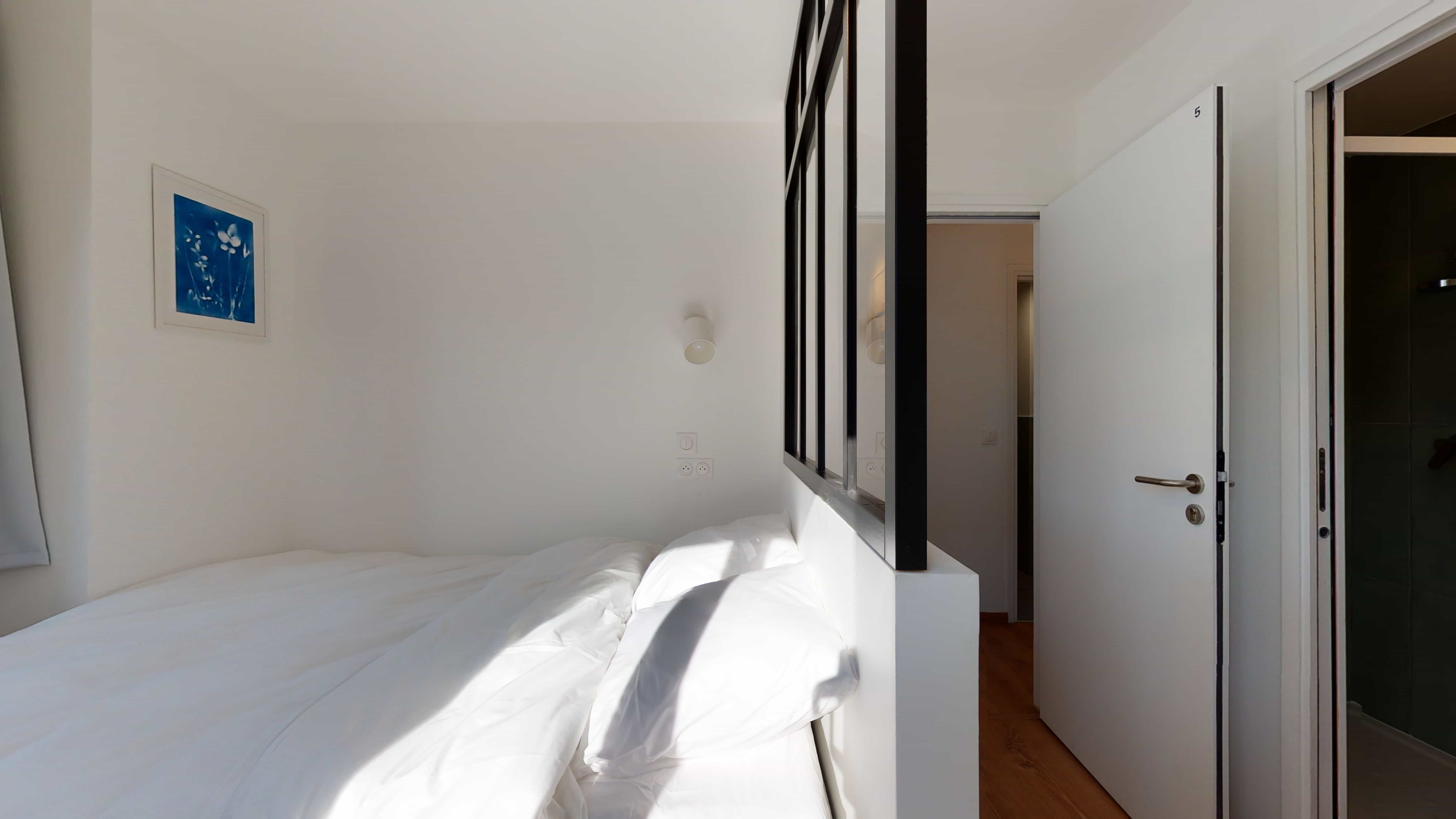 La chambre "Room for one person - 5" se trouve au premier étage et est conçue pour offrir confort et fonctionnalité. Elle est équipée d'un lit double avec rangement intégré, d'une armoire spacieuse pour vos affaires, d'une chaise confortable, d'un bureau pour travailler ou étudier, et d'une lampe de chevet pour vos lectures nocturnes. La salle de bain privée comprend une douche moderne, un lavabo et des toilettes. Un radiateur assure une température agréable tout au long de l'année.