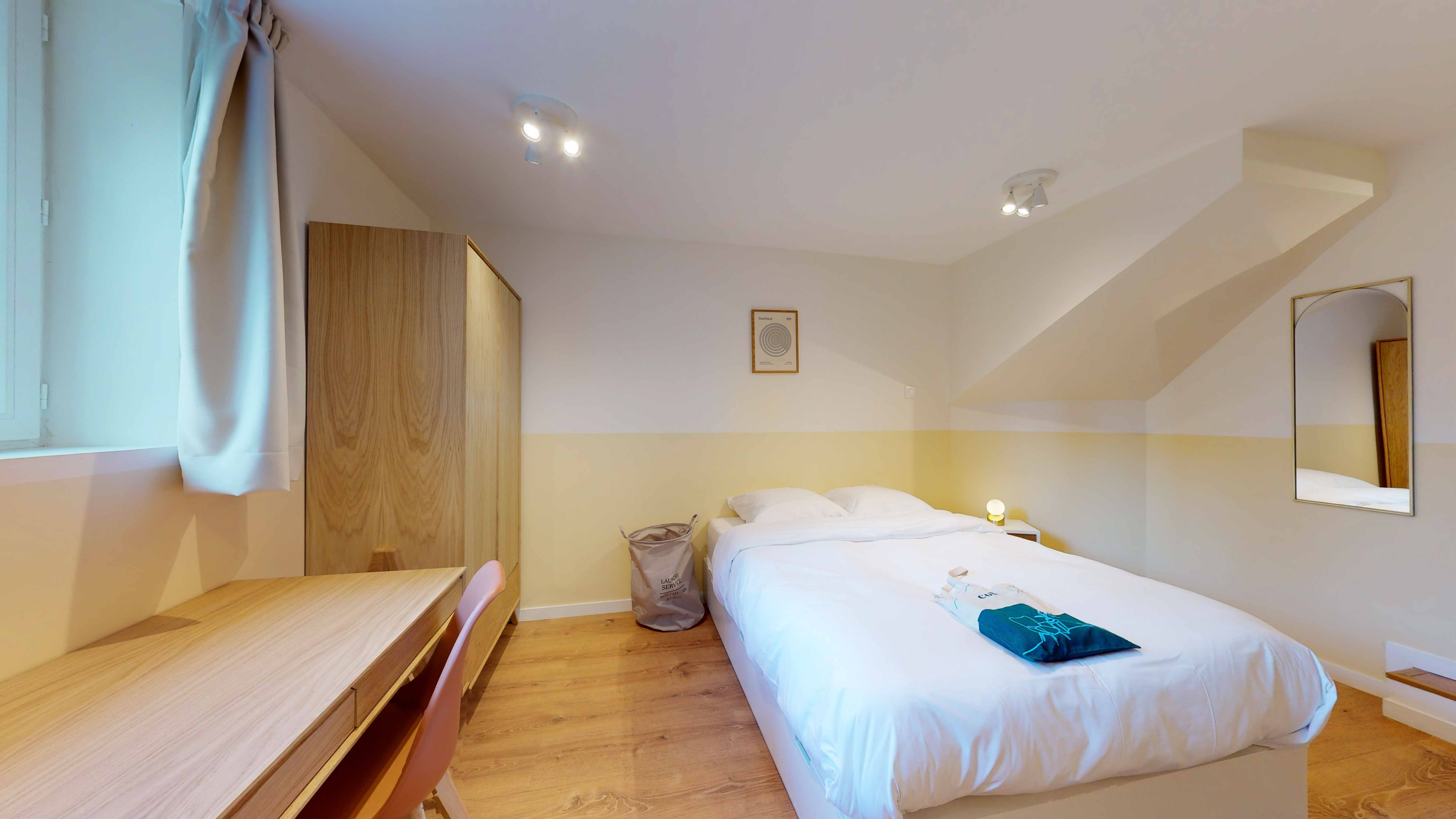 La chambre "Room for one person - 3" est un cocon parfait pour une personne. D'une superficie de 15m², elle est située au rez-de-jardin et dispose d'une salle de bain privée avec douche. La chambre est meublée d'un lit double avec rangement intégré, d'une armoire spacieuse pour vos vêtements, d'un bureau accompagné d'une chaise confortable pour travailler ou étudier, et d'une lampe de bureau pour vos lectures nocturnes. La literie de qualité supérieure et le radiateur assurent votre confort tout au long de l'année.