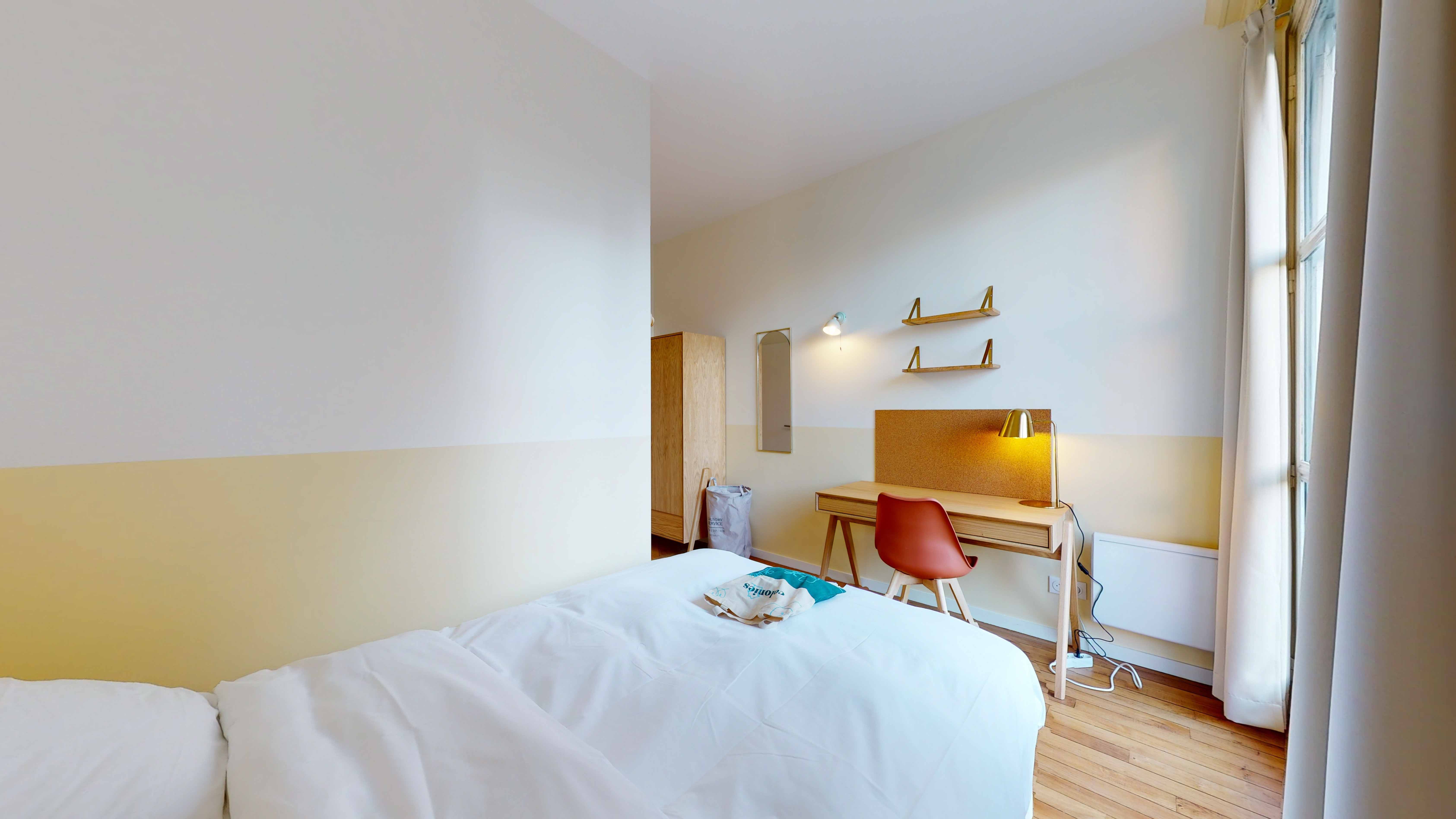Votre chambre, la "Room for one person - 4", est un cocon de 11m2 situé au rez-de-chaussée. Elle est meublée d'un lit double avec literie de qualité, d'une armoire pour vos affaires, d'un bureau et d'une chaise pour travailler ou étudier confortablement. Vous bénéficiez également d'un accès direct à la terrasse. La salle de bain est partagée avec un autre locataire et comprend une douche moderne.