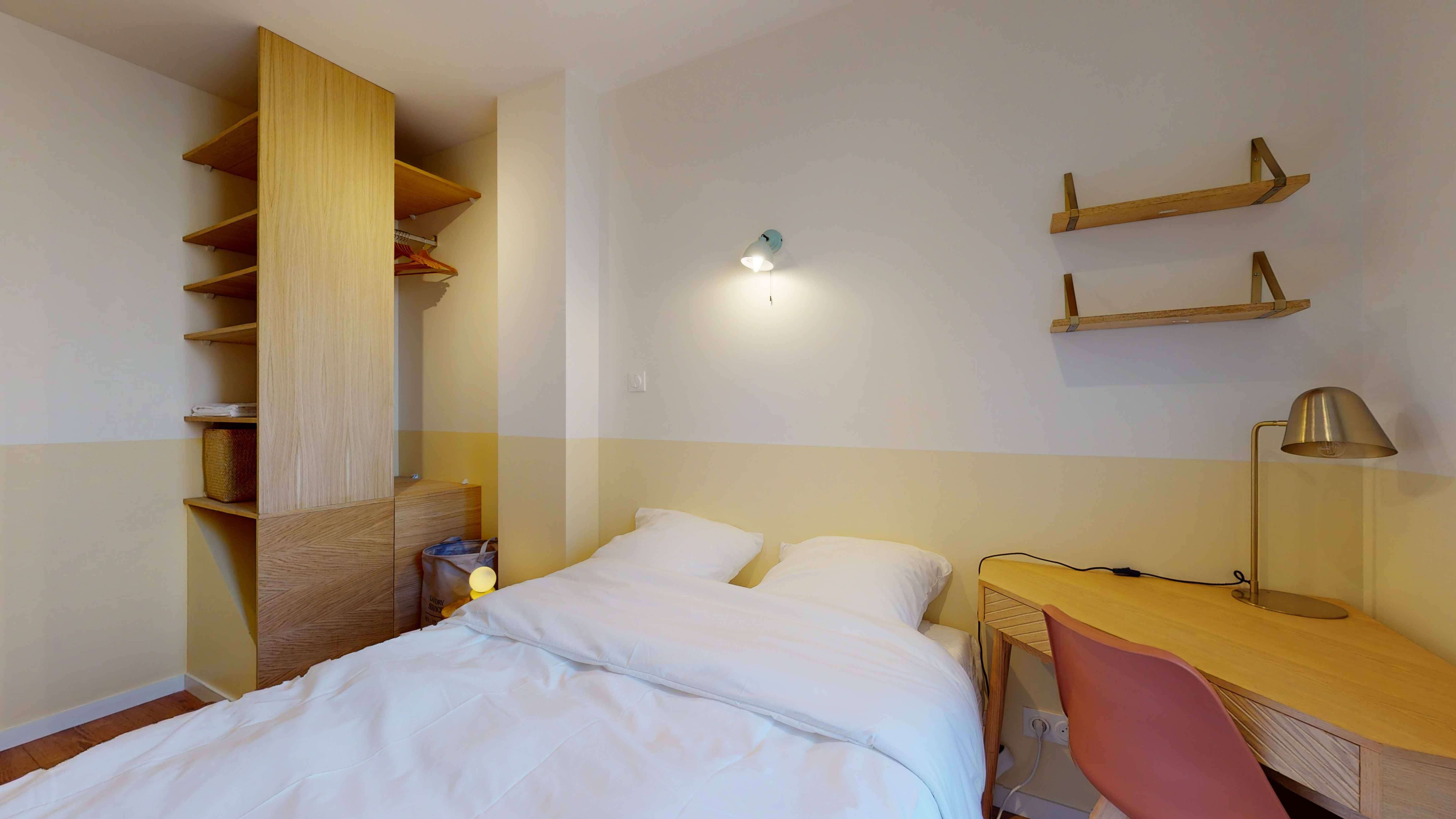 La chambre "Room for one person - 6" est un cocon douillet de 9m² situé au rez-de-chaussée. Elle est idéale pour une personne et comprend un lit double avec rangement intégré, une armoire pour vos affaires, une chaise confortable et un bureau éclairé par une lampe pour travailler ou étudier. La chambre partage une salle de bain moderne avec douche avec un autre locataire. De plus, vous bénéficierez d'un radiateur pour rester au chaud, de linge de lit de qualité et d'une lampe de chevet pour vos lectures nocturnes.