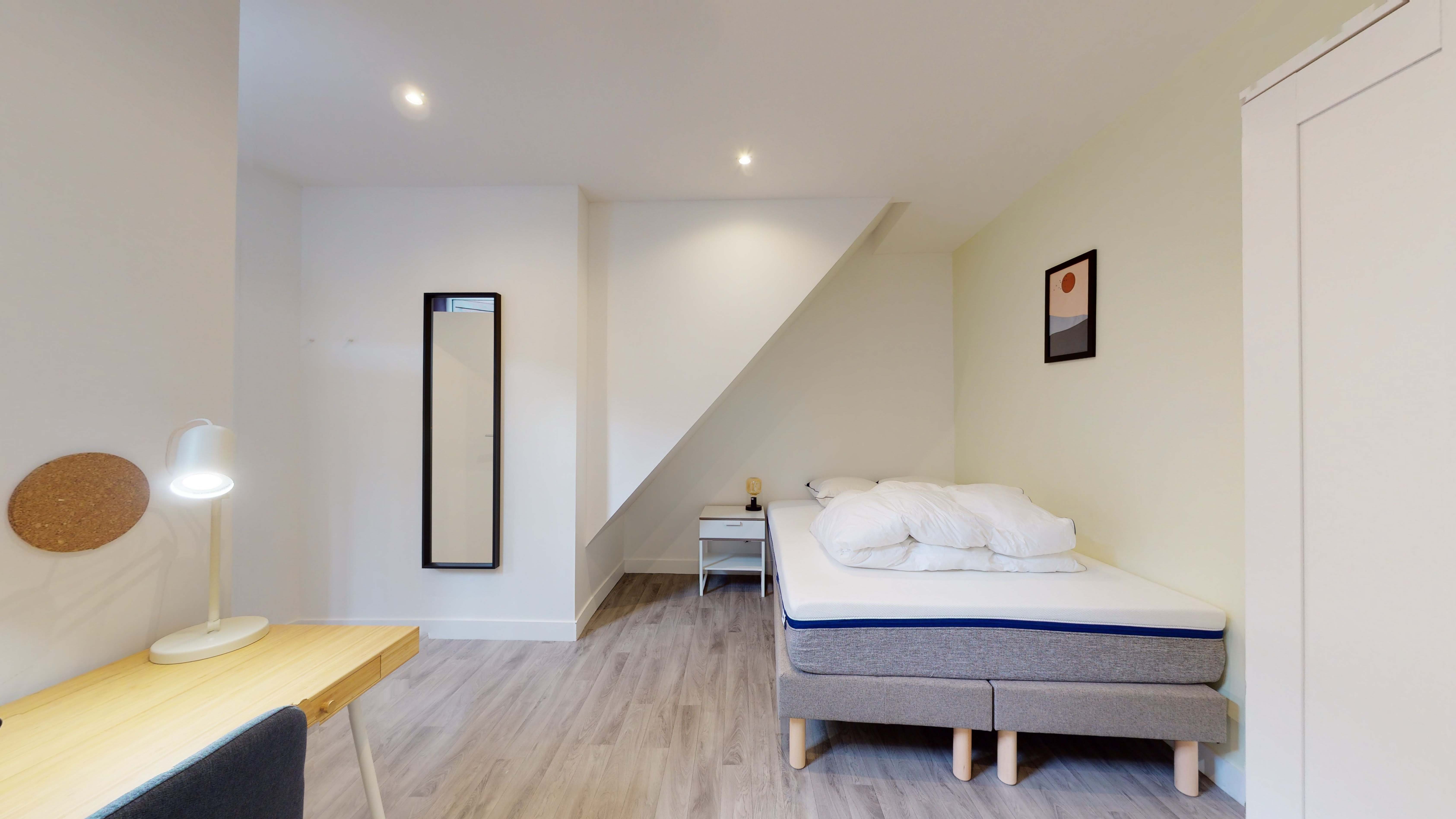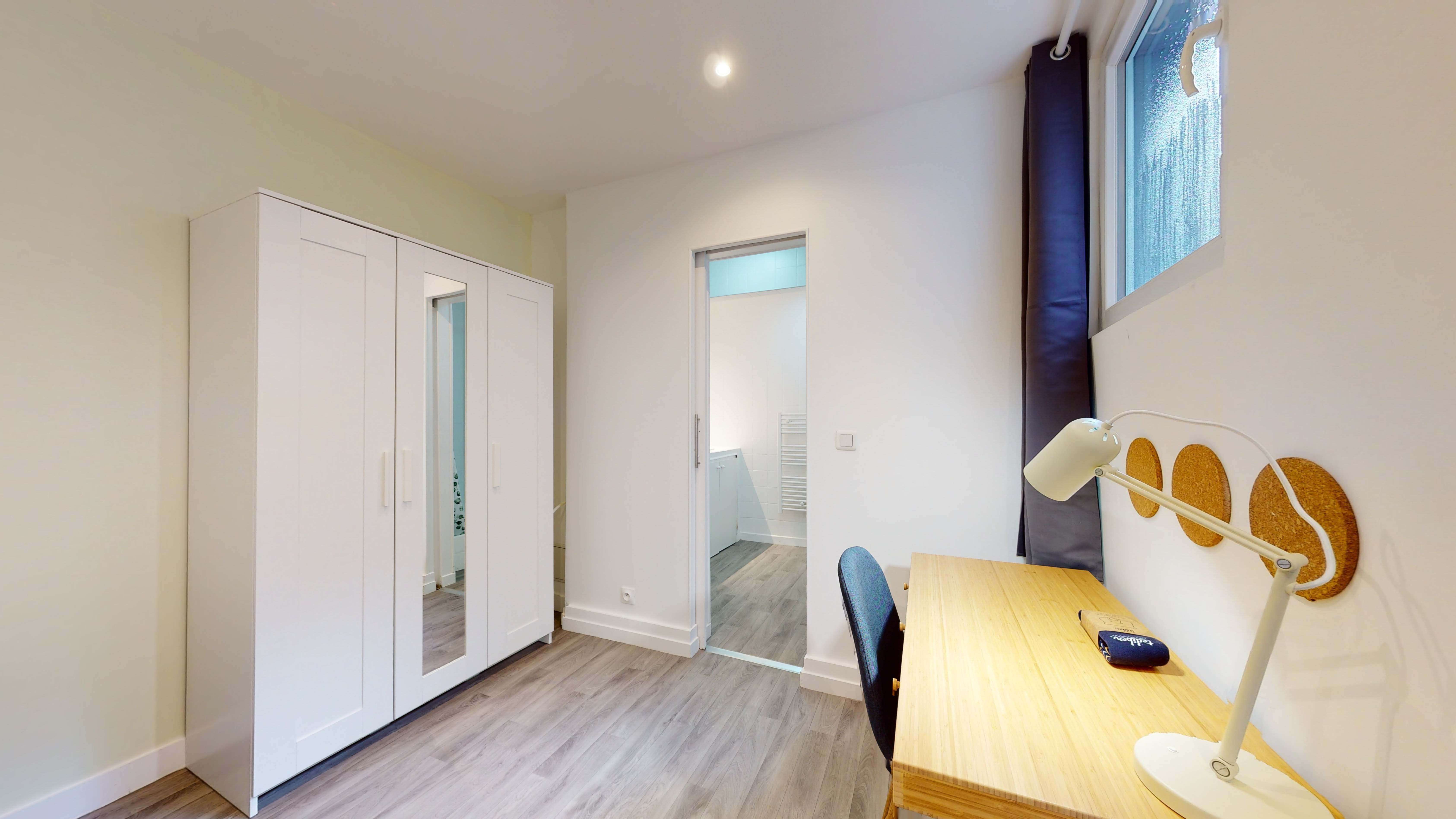 La Room 6 est spécialement conçue pour une personne. Elle comprend un lit double confortable avec de la literie de qualité, une armoire pour ranger vos affaires, ainsi qu'un bureau et une chaise pour travailler ou étudier tranquillement. De plus, vous profiterez d'une salle de bain privée avec douche, lavabo et toilettes, assurant votre intimité.
