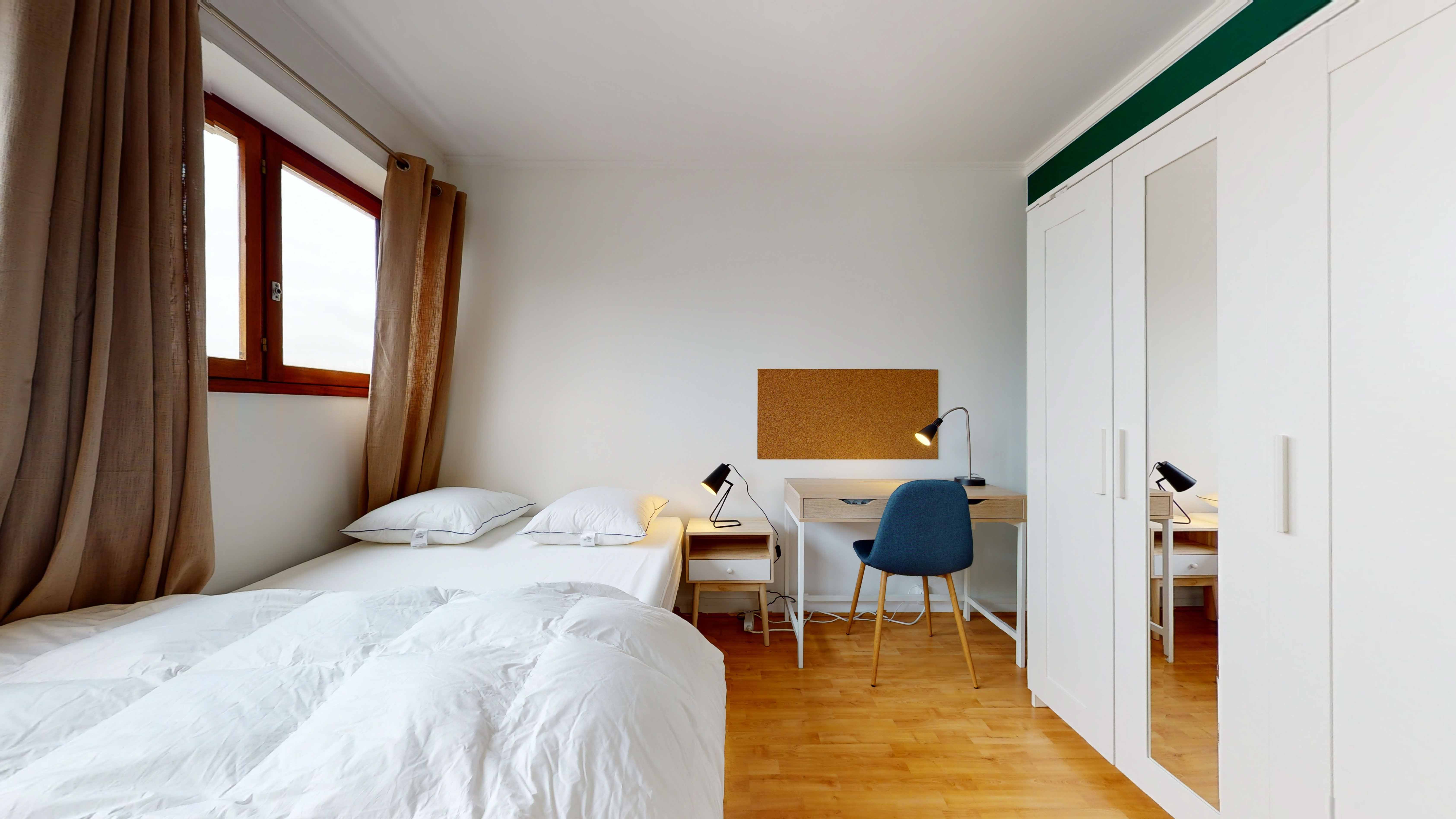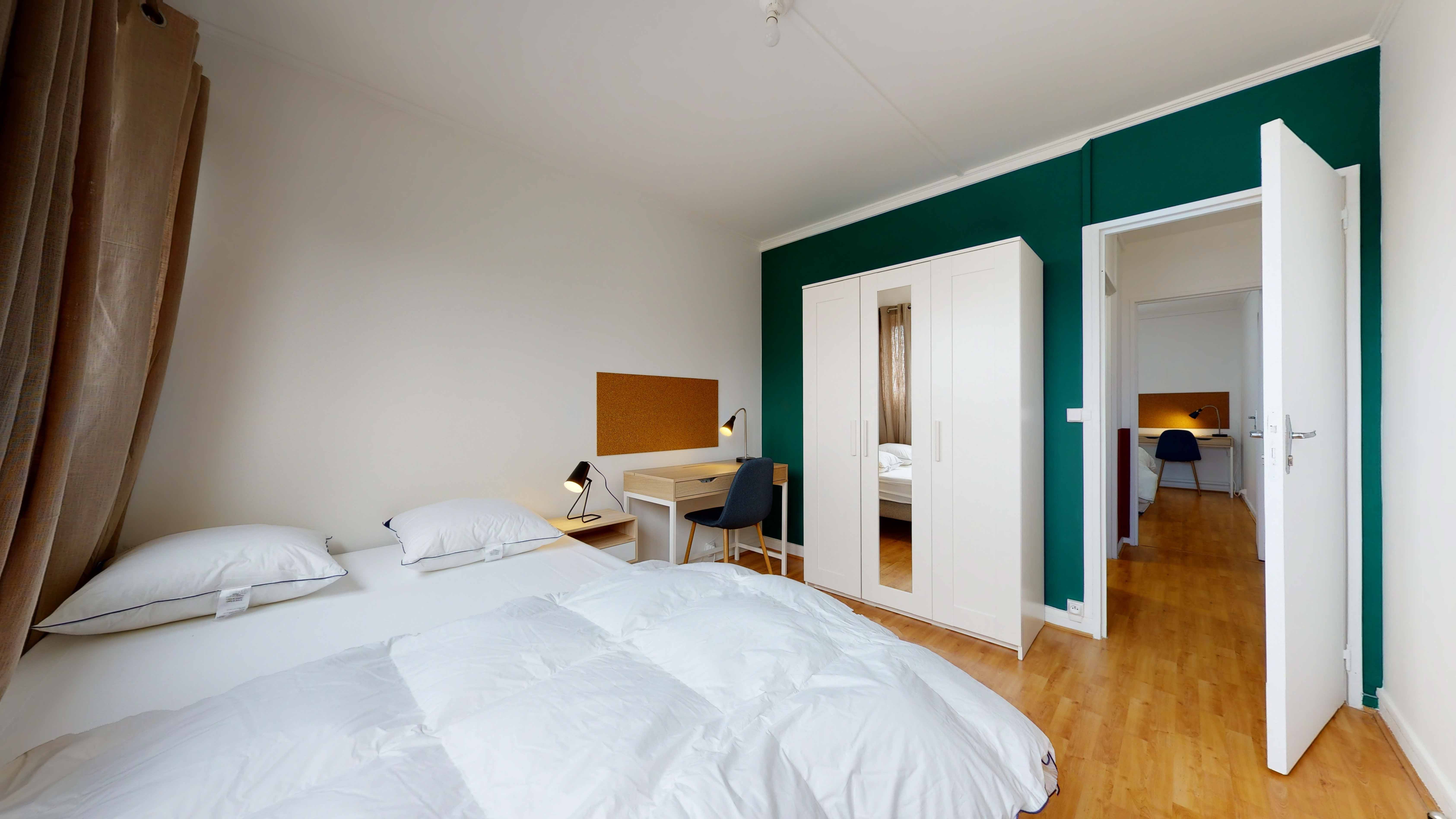 Room 4 est spécialement conçue pour une personne. Elle est meublée avec un lit double confortable, une armoire spacieuse pour ranger vos affaires, un bureau et une chaise pour étudier ou travailler, et une lampe de chevet pour vos lectures nocturnes. La chambre mesure 10 m² et partage une salle de bain moderne avec douche et WC avec les autres résidents.
