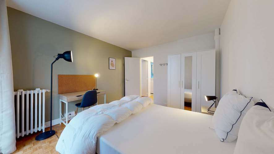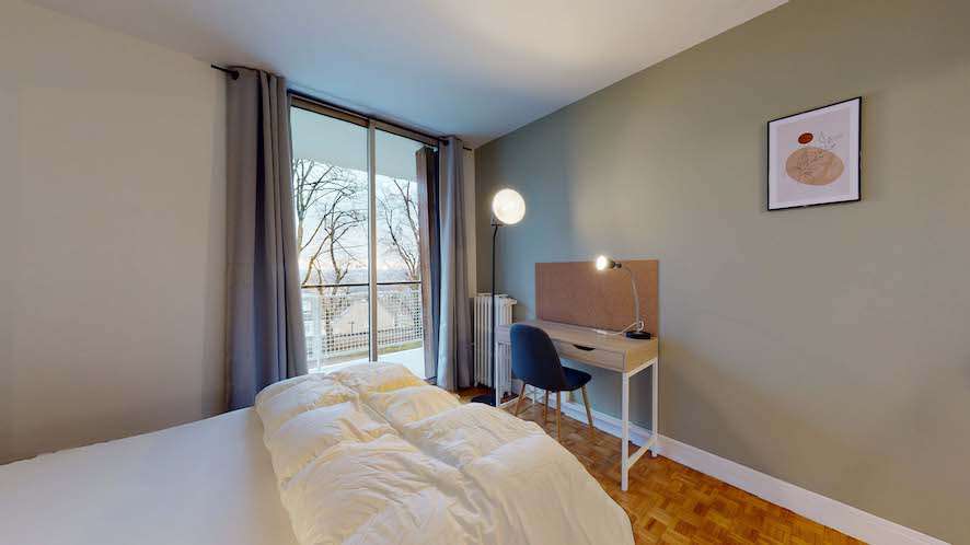 Room 1 est conçue pour vous offrir un espace privé rien qu'à vous. Avec ses 12 m², la chambre est meublée d'un lit double confortable, d'une armoire pour vos affaires, d'un bureau et d'une chaise pour étudier ou travailler. La salle de bain, partagée avec les autres locataires, est équipée d'une douche. Et petit plus, depuis la chambre, vous avez un accès direct à un balcon !