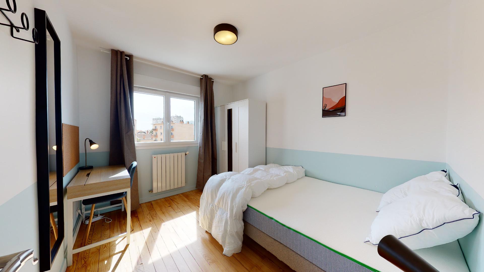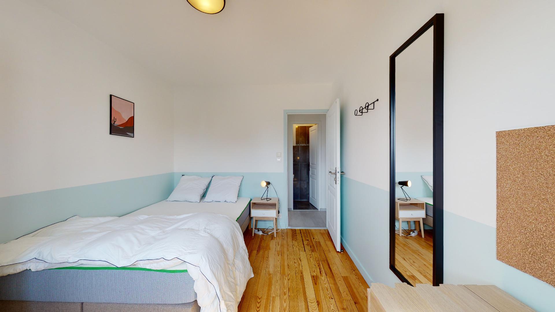 La chambre disponible, Room 3, est un espace personnel de 9 m² conçu spécialement pour votre confort et votre intimité. Elle est meublée d'un lit double avec une literie de qualité, d'une armoire pour vos vêtements, d'un bureau avec une chaise pour étudier ou travailler, et d'une lampe de chevet pour vos soirées lecture. La chambre partage une salle de bains bien équipée avec douche et toilettes.