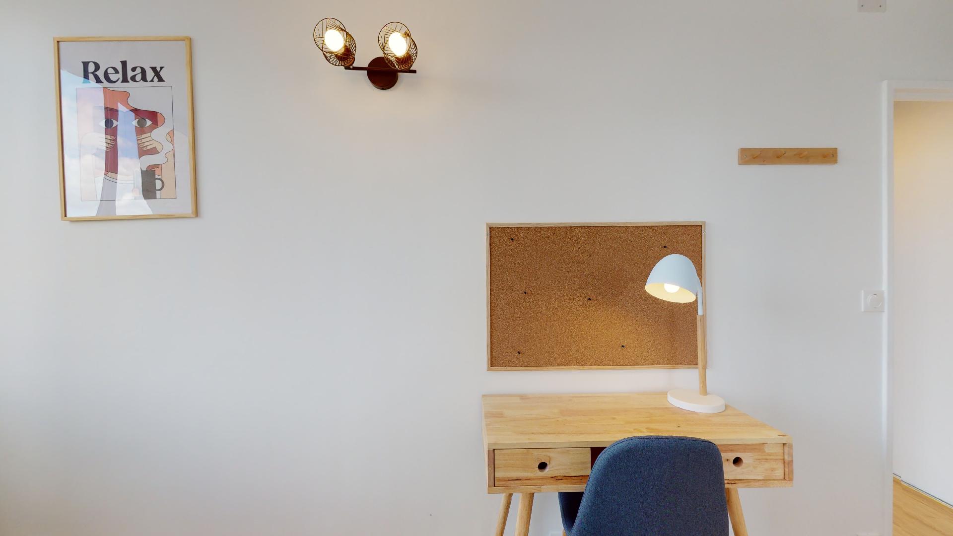 La chambre 1, pensée pour une personne, est un espace personnel de 11 m². Vous y trouverez un lit double confortable avec une literie de qualité, une armoire pour vos affaires, ainsi qu'un bureau et une chaise pour travailler ou étudier en toute tranquillité. Cette chambre partage une salle de bain bien équipée avec les autres locataires.
