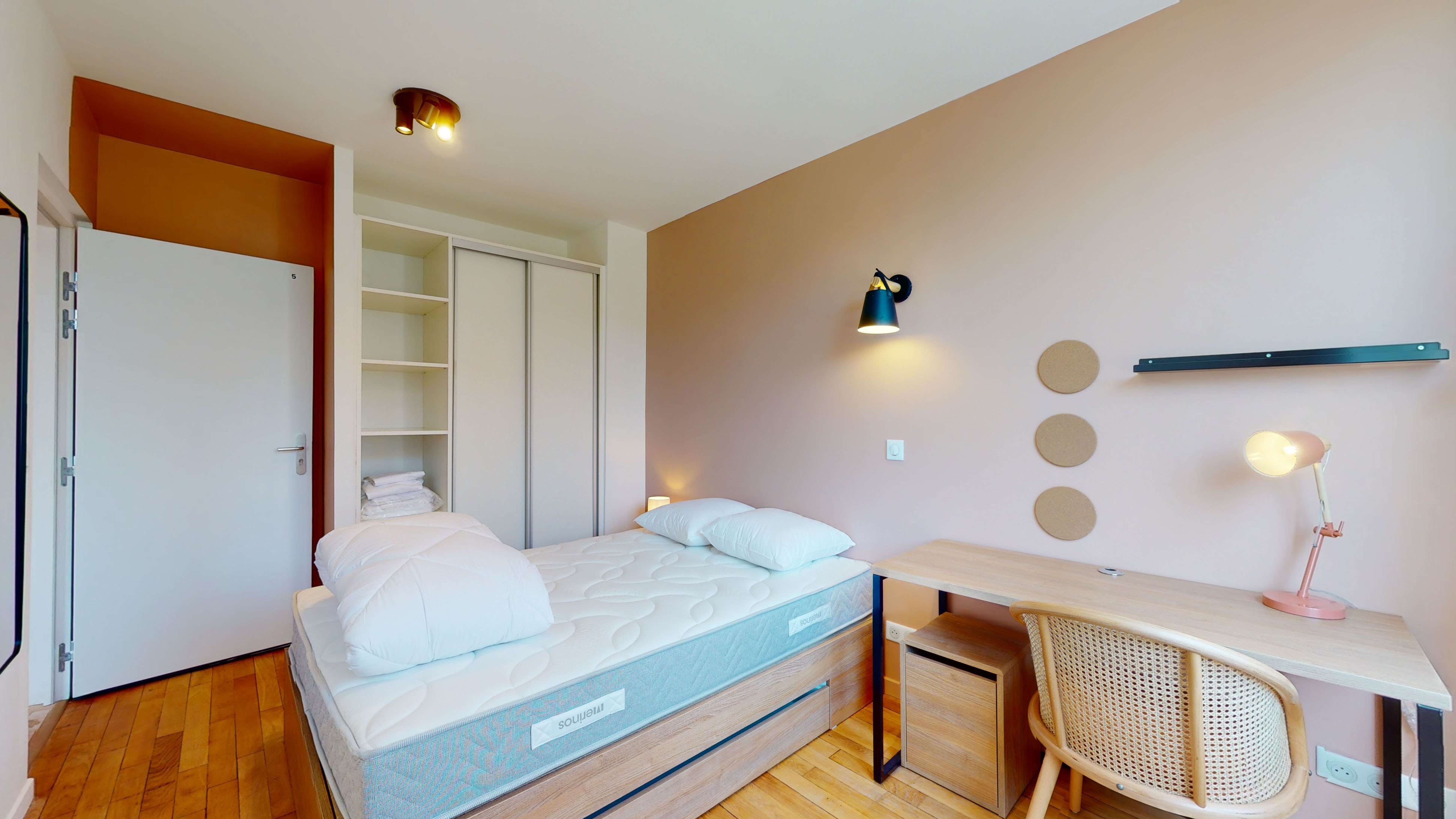 La chambre "Room for one person - 5" est un cocon douillet de 14m² situé au premier étage. Elle est idéale pour une personne et dispose d'un lit double confortable avec rangement intégré, d'une armoire spacieuse, d'un bureau pratique pour travailler et d'une chaise. La salle de bain privative est équipée d'une douche moderne. Vous bénéficierez également d'une connexion internet haut débit dans votre chambre.