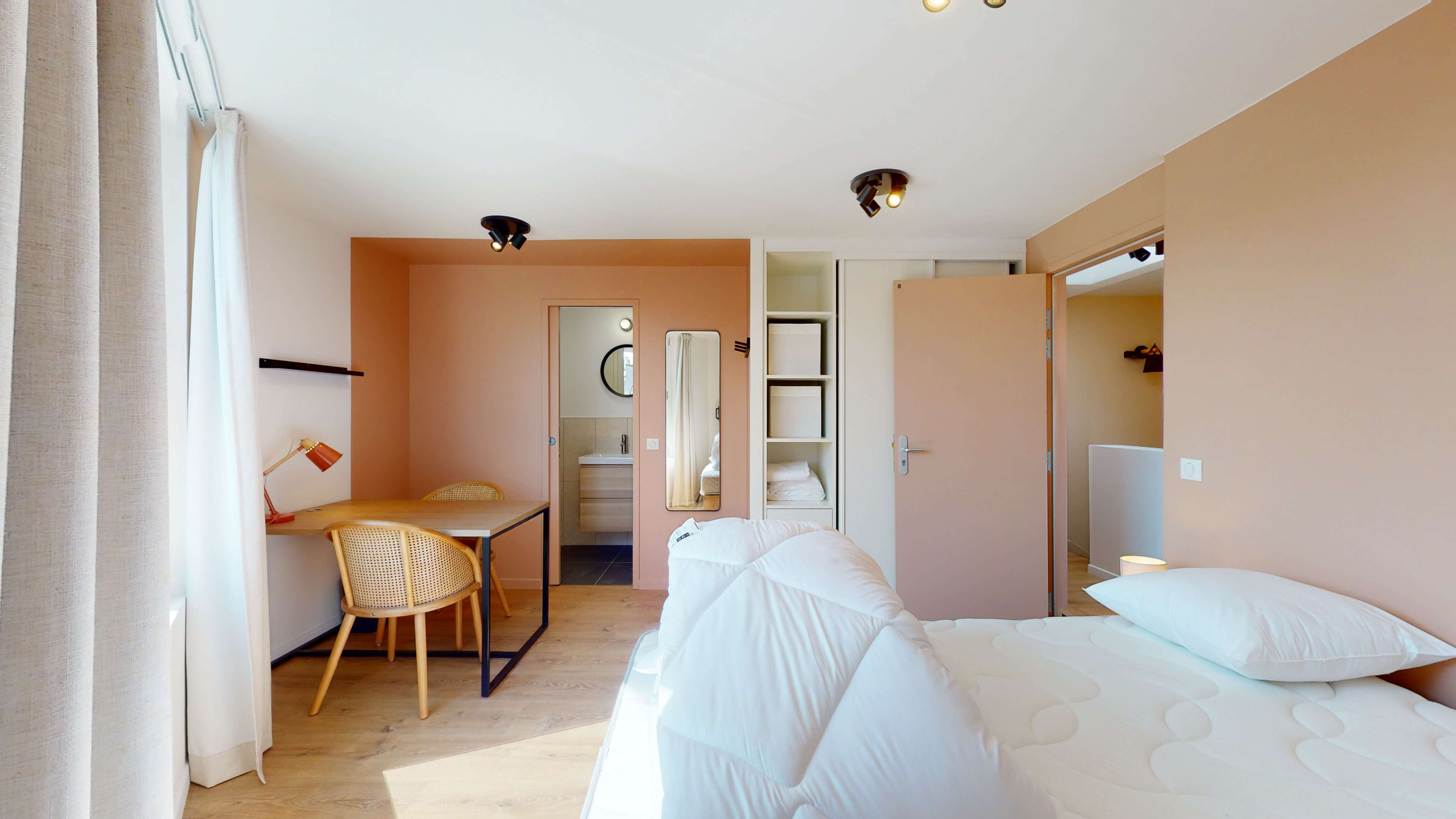 La chambre "Room for two person - 8", située au deuxième étage, est un cocon douillet de 17m2 conçu pour deux personnes. Elle est meublée d'un lit double avec rangement intégré, d'une armoire spacieuse pour vos affaires, d'un bureau et d'une chaise pour travailler ou étudier dans le confort. La salle de bain privative est équipée d'une douche moderne, d'un lavabo et de toilettes. La chambre bénéficie aussi d'une connexion internet haut débit et de tout le nécessaire pour votre quotidien.