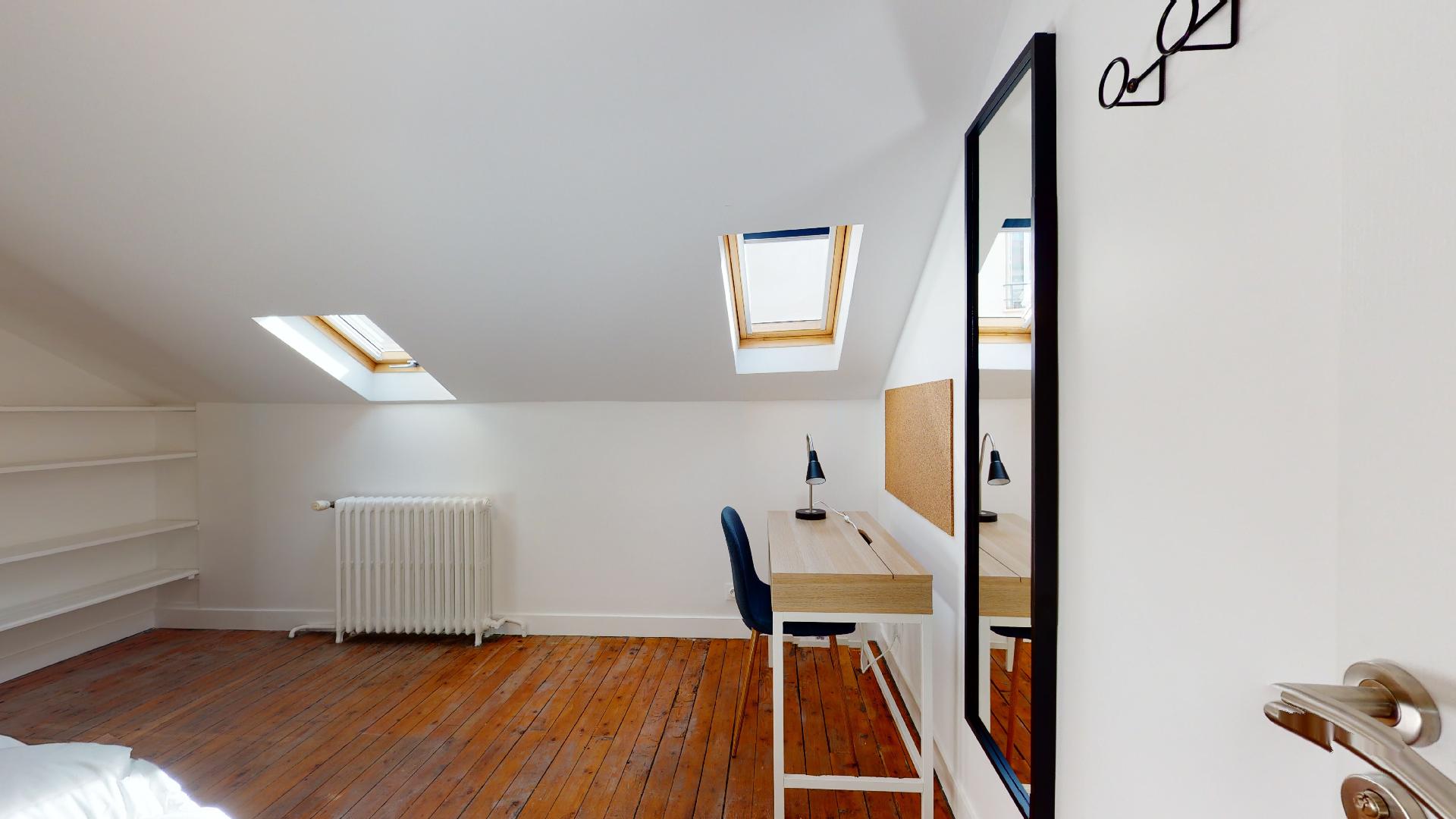 La chambre 6, d'une superficie de 11 m², est un véritable cocon personnel. Elle dispose d'un lit double confortable avec une literie de qualité, une armoire spacieuse pour ranger vos affaires, un bureau accompagné d'une chaise pour étudier ou travailler et une lampe de chevet pour vos soirées lecture. La salle de bains partagée est équipée d'une douche, d'un lavabo et de toilettes.