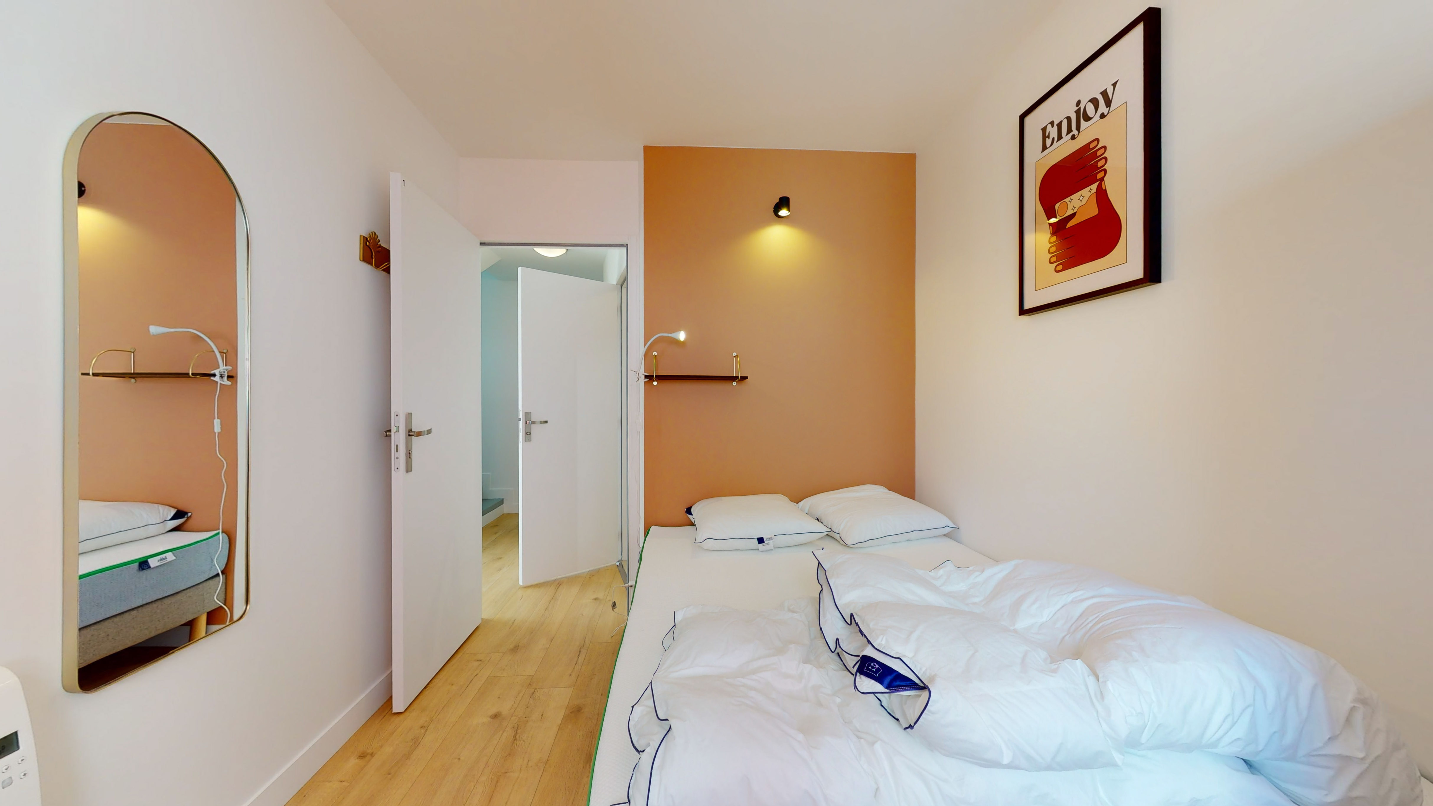 La "Room 1" est parfaite pour une personne. Elle est équipée d'un lit double confortable, d'une armoire pour ranger vos affaires, d'une chaise et d'un bureau pour travailler ou étudier. Cette chambre, de 9 m², dispose également d'un accès à une salle de bain partagée avec douche et toilettes.