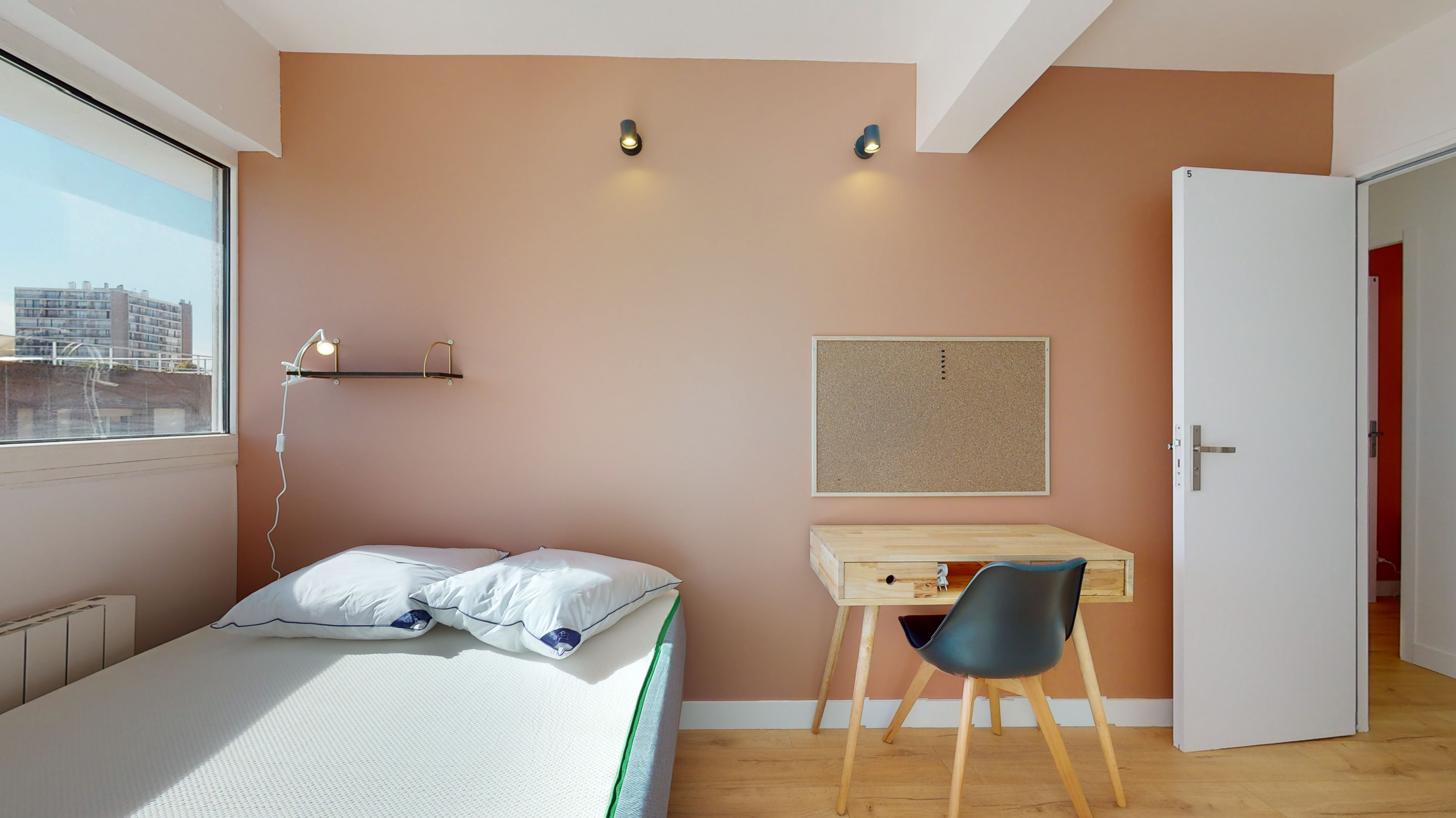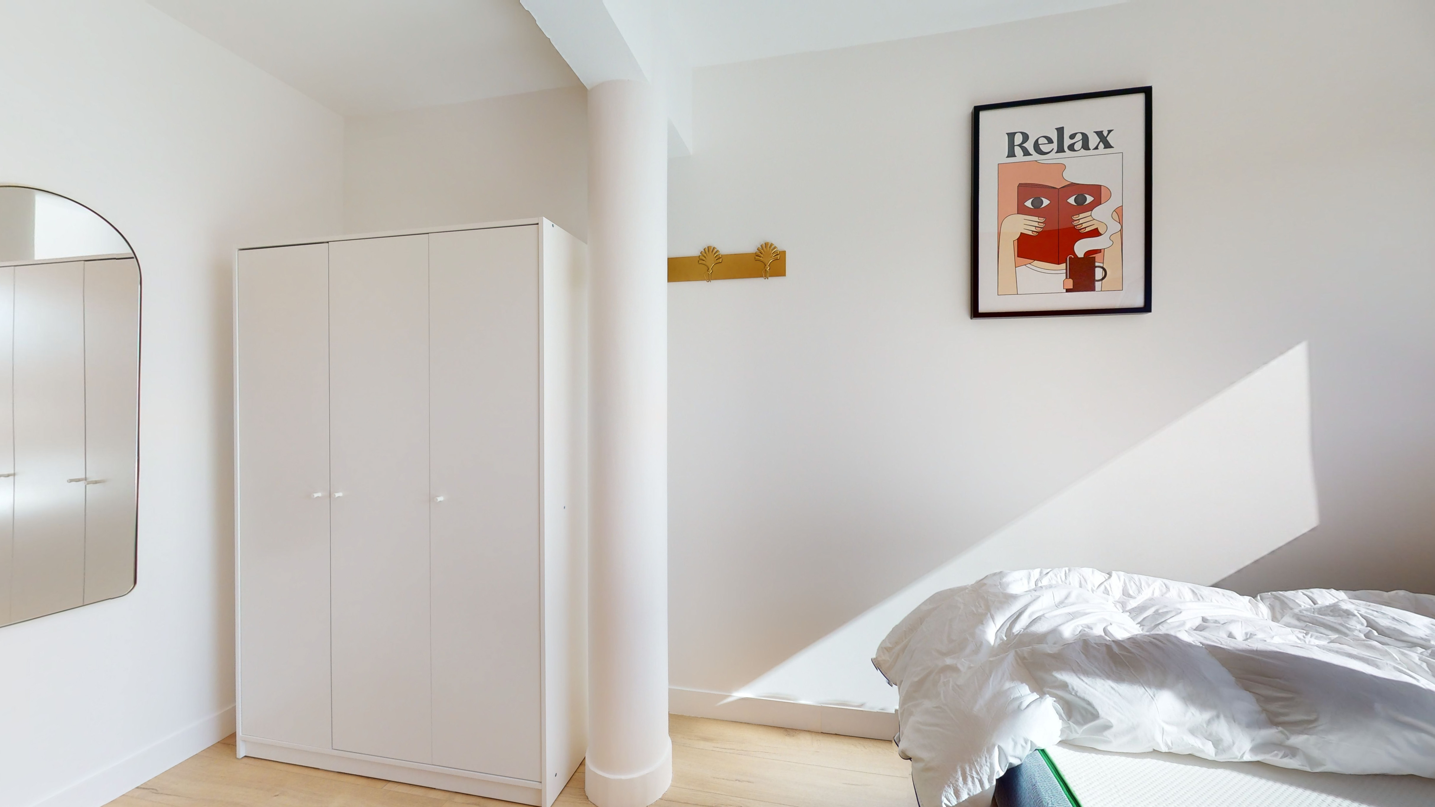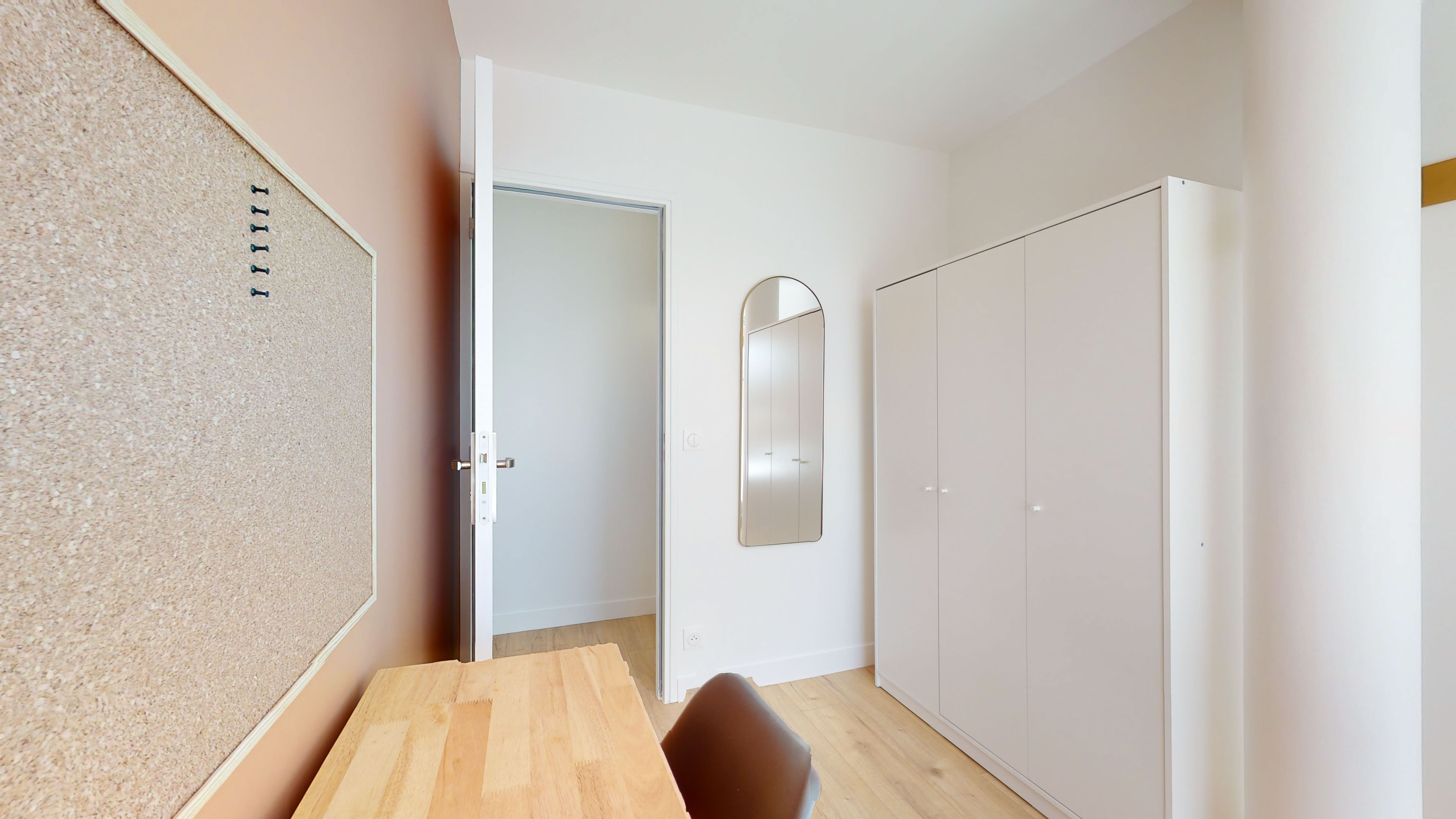 La chambre 5, conçue spécialement pour une personne, est un espace personnel de 9 m² où il fait bon se reposer. Elle est meublée d'un confortable lit double, d'une grande armoire pour vos affaires, ainsi que d'un bureau et d'une chaise, parfaits pour étudier ou travailler. La salle de bain est partagée avec d'autres locataires et comprend tout le nécessaire: douche, lavabo et toilettes.