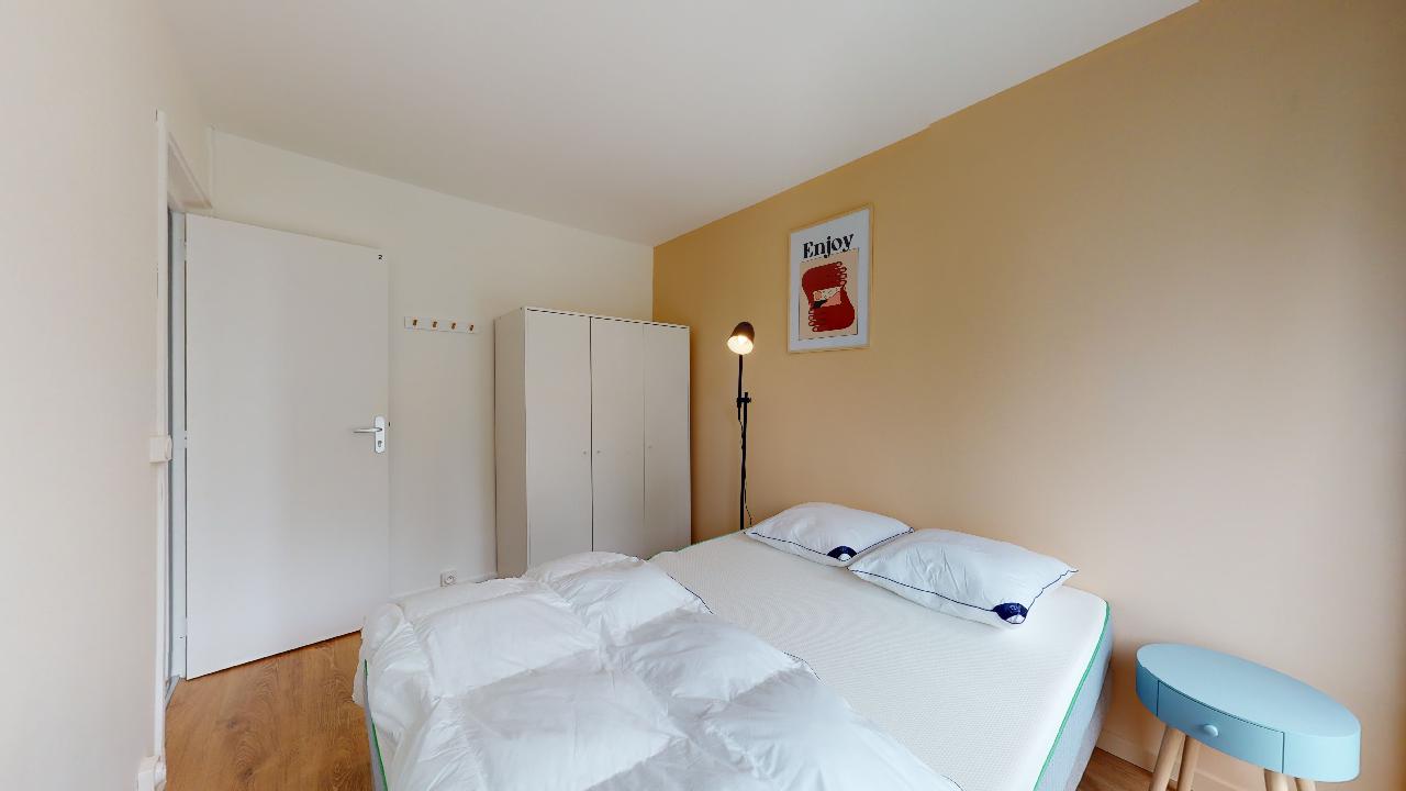 La chambre Room 2, conçue pour une seule personne, offre un confort douillet avec son lit double et sa literie de qualité. Vous y trouverez une armoire pour vos vêtements, un bureau et une chaise pour travailler, ainsi qu'un accès au balcon pour profiter de moments de détente. Cette pièce de 9 m² partage une salle de bain bien équipée avec les autres locataires.