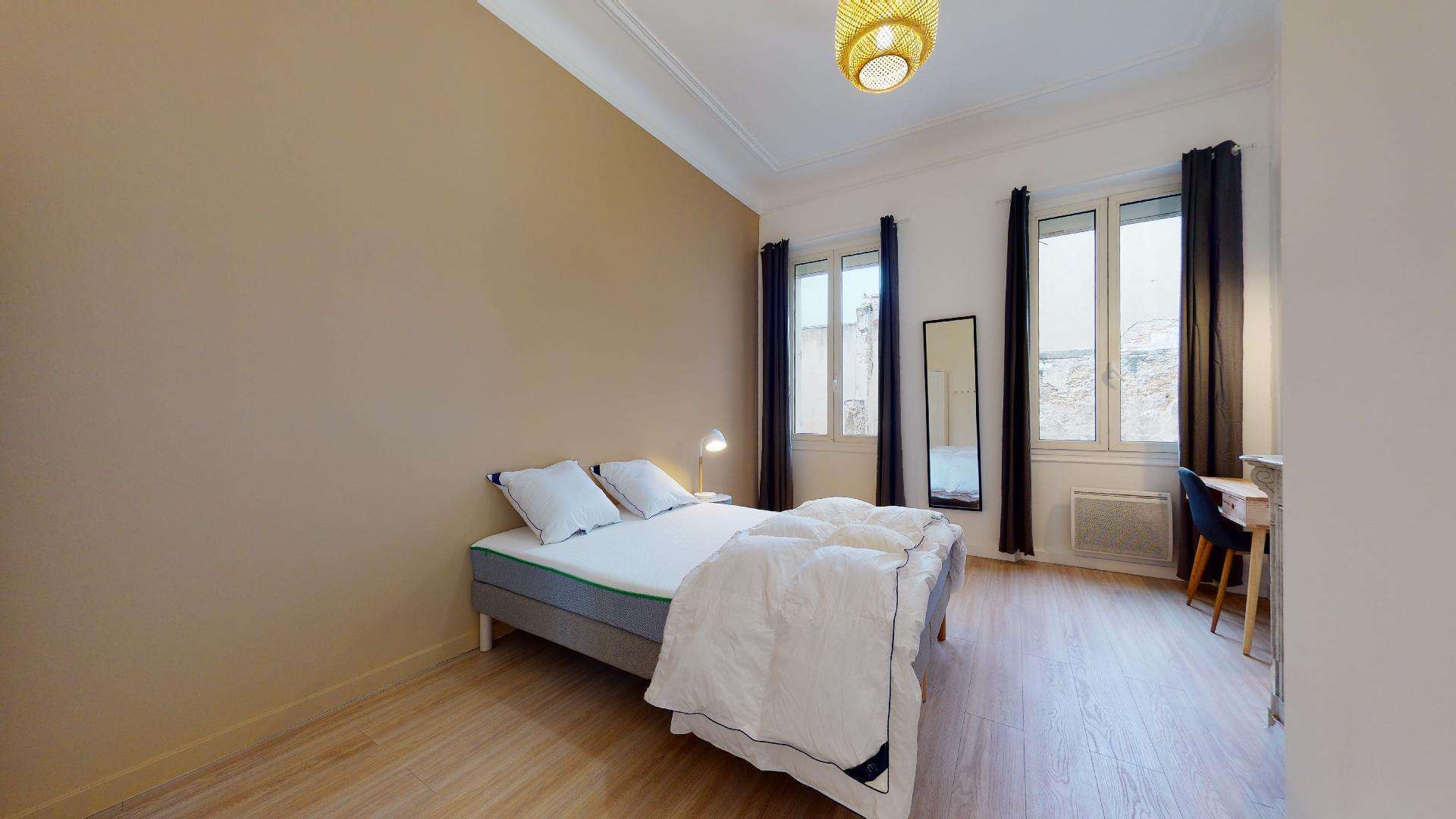 La chambre 3, pensée pour une personne, offre un espace confortable de 16 m². Elle est meublée avec un lit double doté d'une literie de qualité, une armoire pour ranger vos affaires, une chaise, une lampe de bureau pour vos soirées d'étude, un petit bureau pratique pour travailler et un radiateur pour rester au chaud. La chambre partage une salle de bain bien équipée avec d'autres locataires.