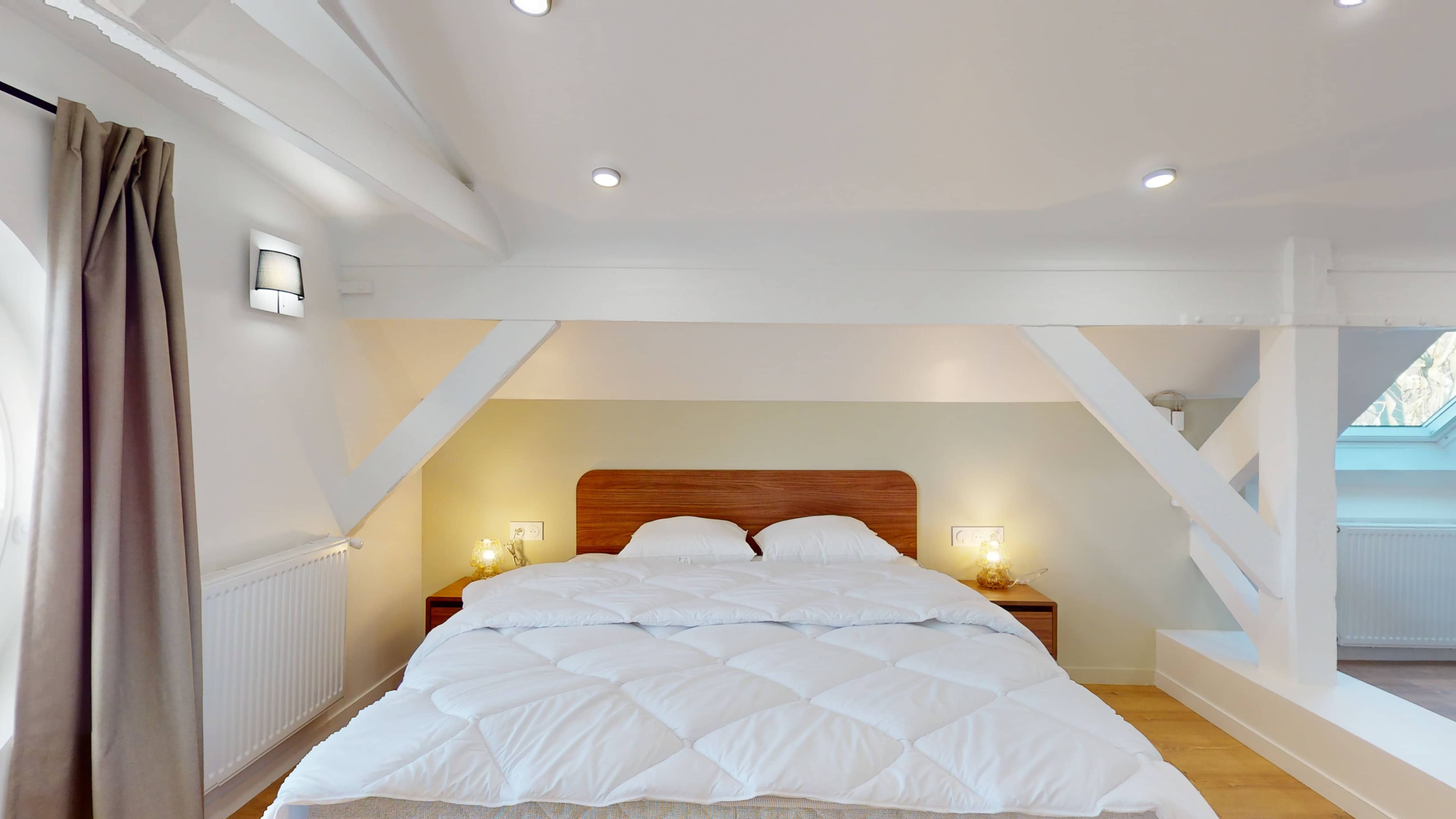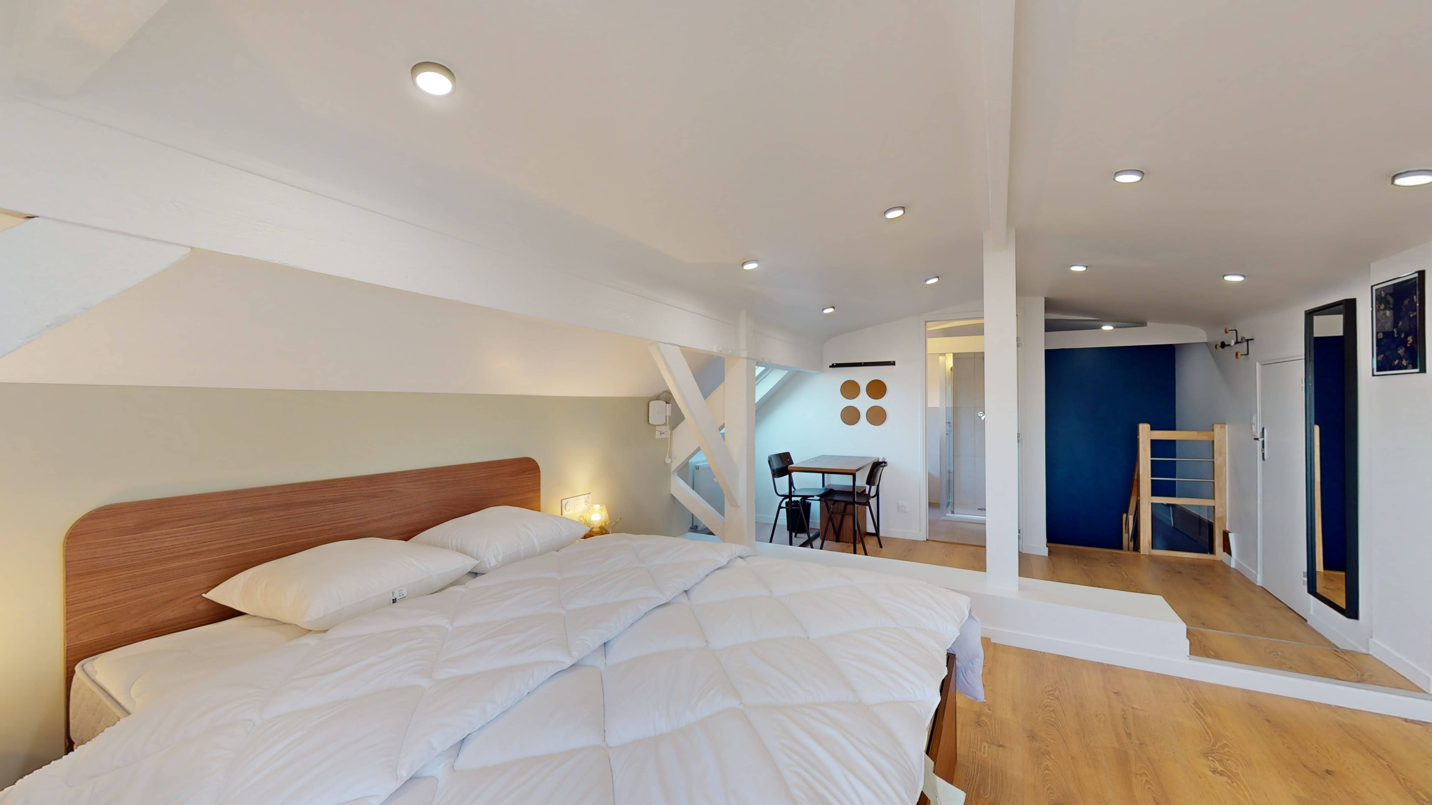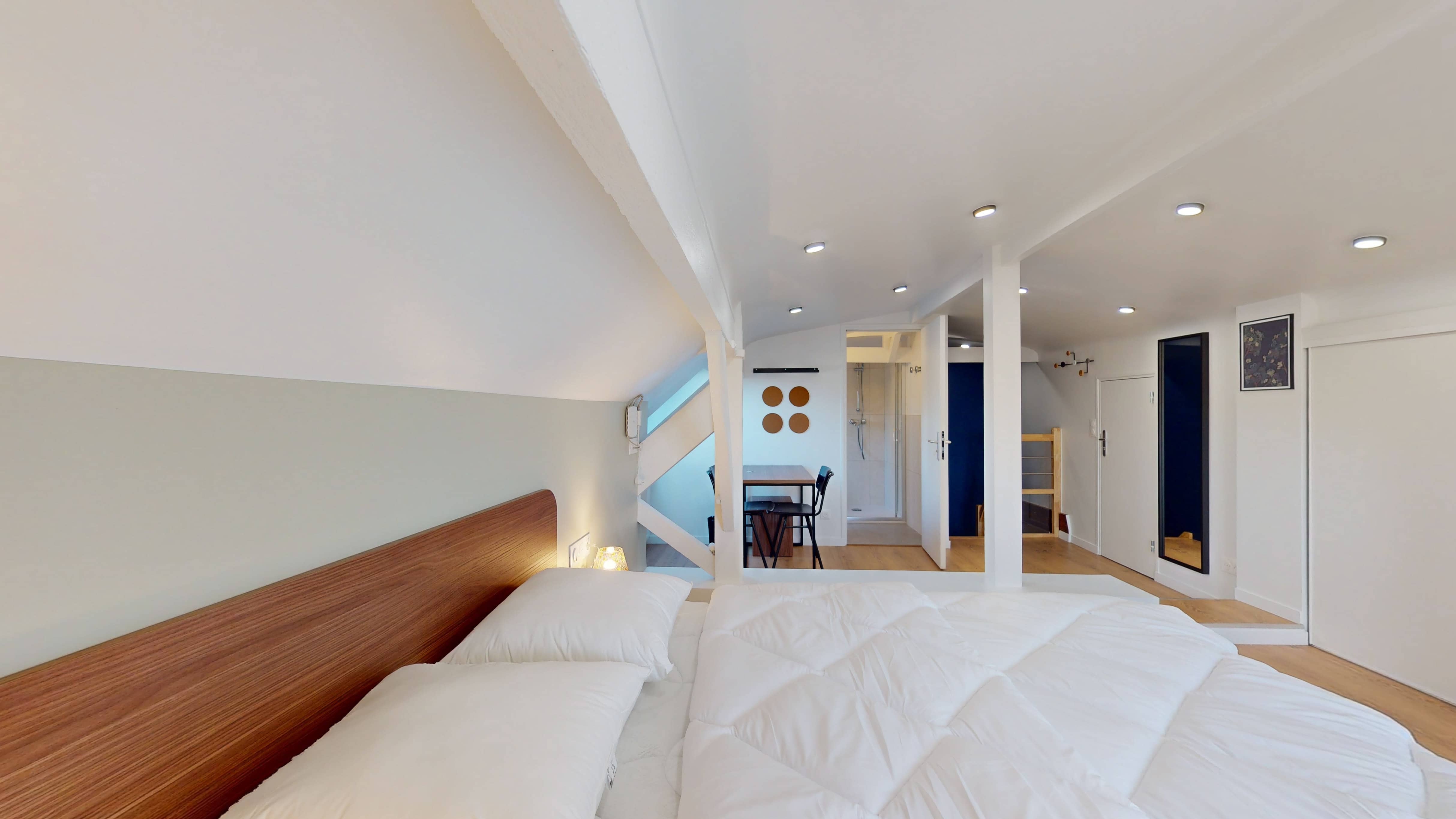 Votre studio privé, situé au quatrième étage, est un véritable cocon personnel. Il comprend un lit double confortable avec literie de qualité, une armoire pour vos affaires, un bureau et une chaise pour travailler ou étudier, et une salle de bain privative avec douche. La pièce est également équipée d'internet haut débit et d'un chauffage pour votre confort.