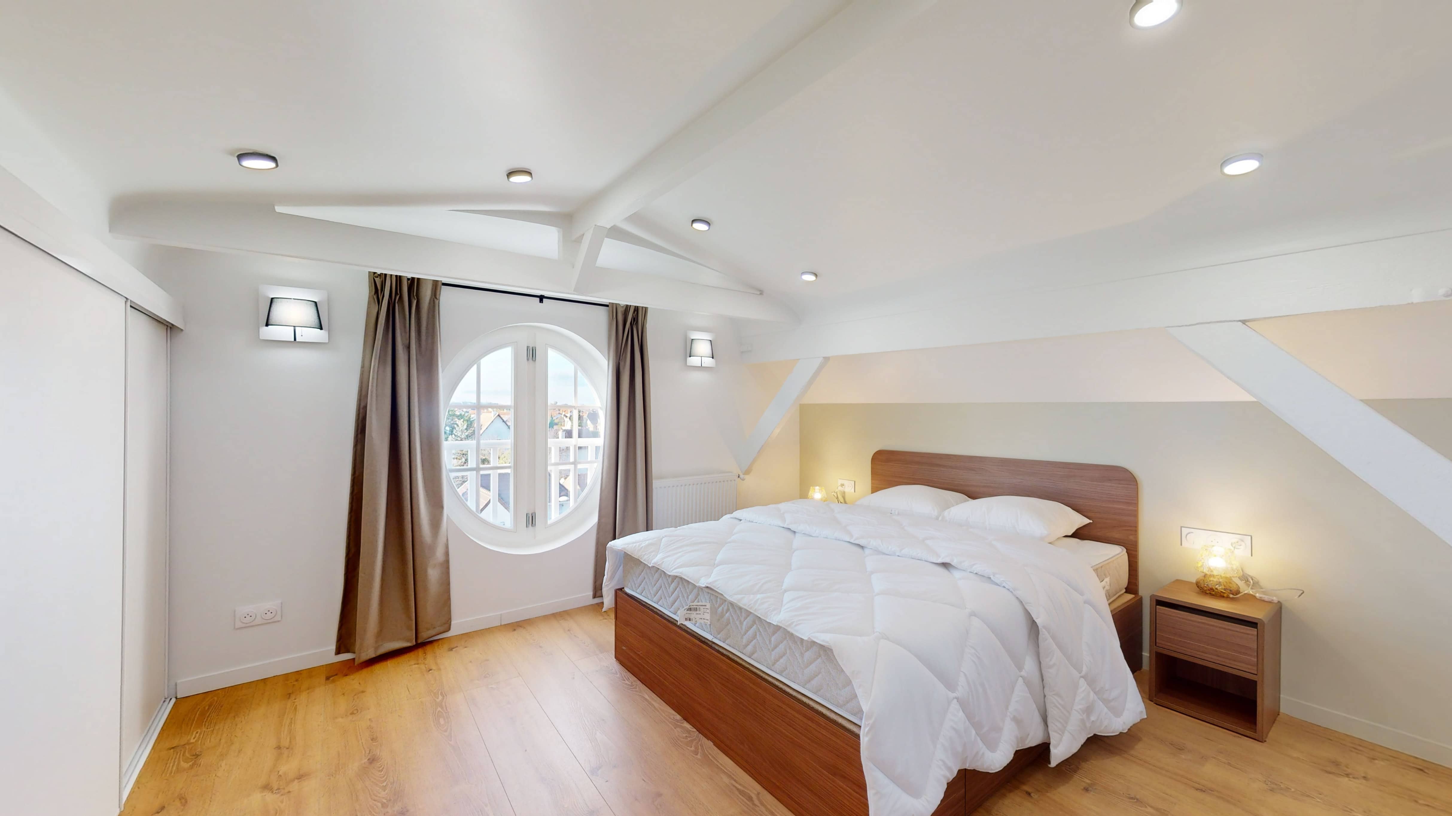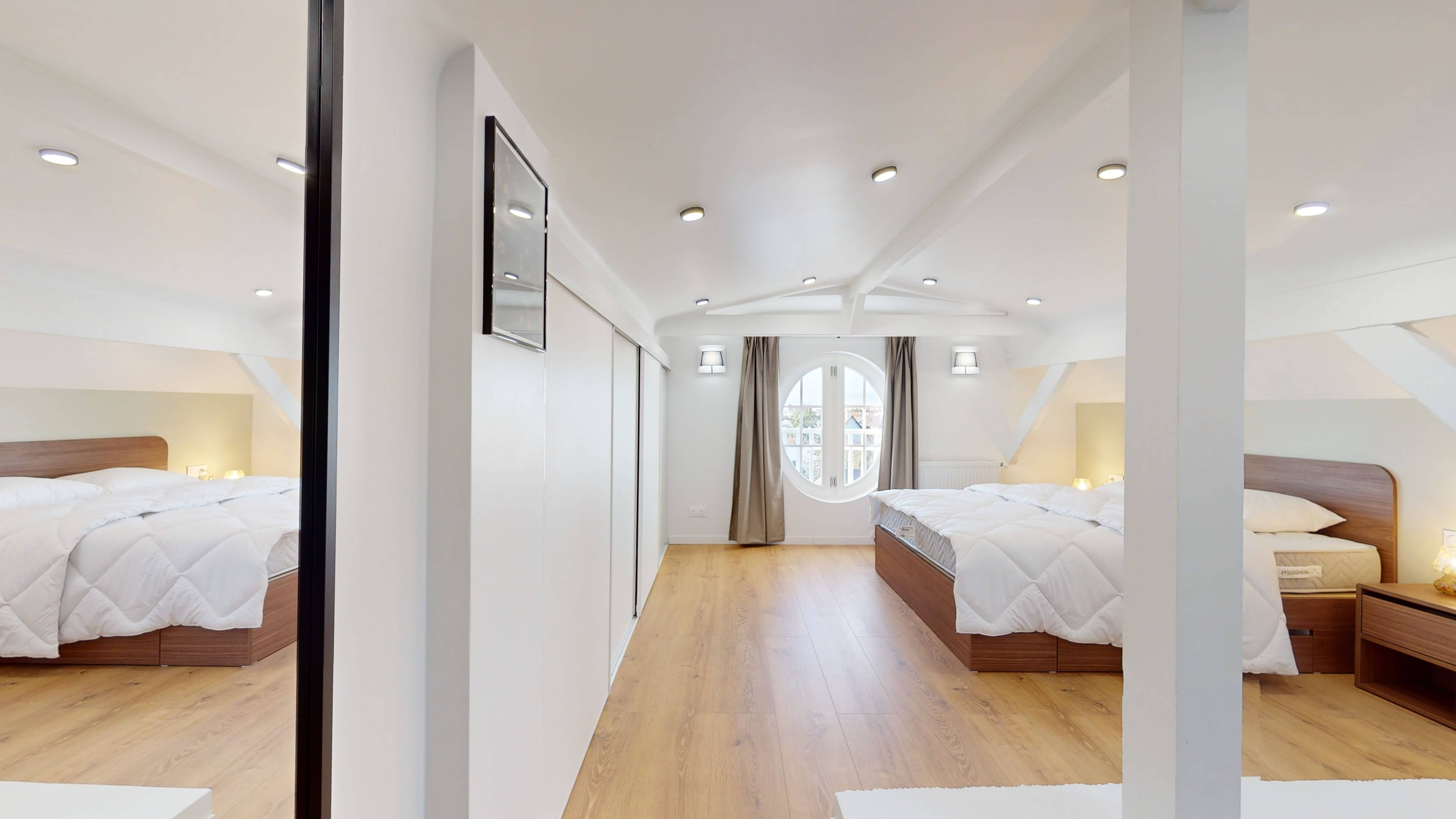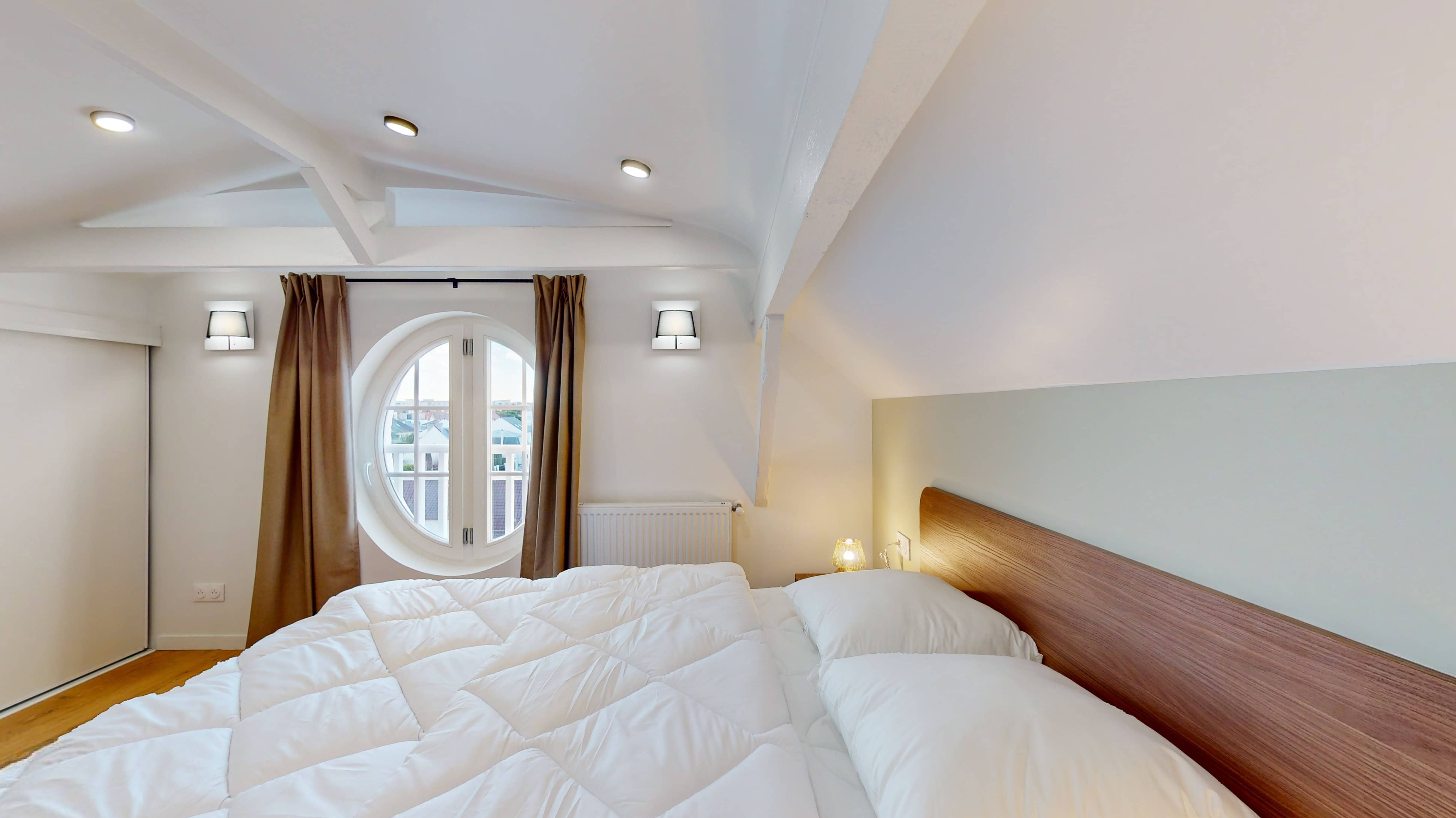 Votre studio privé, situé au quatrième étage, est un véritable cocon personnel. Il comprend un lit double confortable avec literie de qualité, une armoire pour vos affaires, un bureau et une chaise pour travailler ou étudier, et une salle de bain privative avec douche. La pièce est également équipée d'internet haut débit et d'un chauffage pour votre confort.