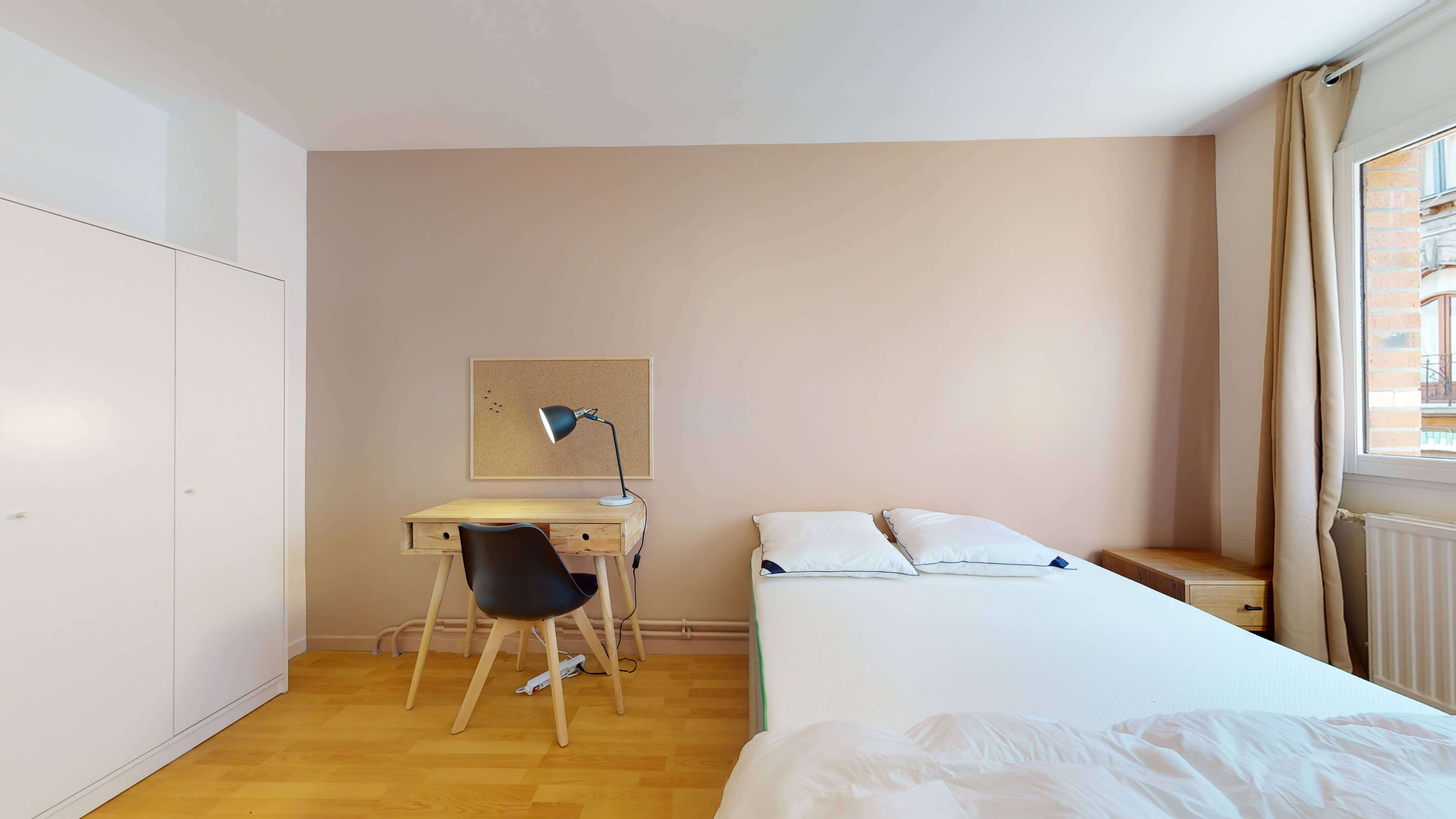 Room 1 est votre espace personnel de 12 m², spécialement aménagé pour une personne. Elle dispose d'un confortable lit double, d'une armoire pour vos vêtements, d'un bureau pour travailler et d'une chaise. La chambre partage une salle de bain bien équipée avec d'autres locataires.