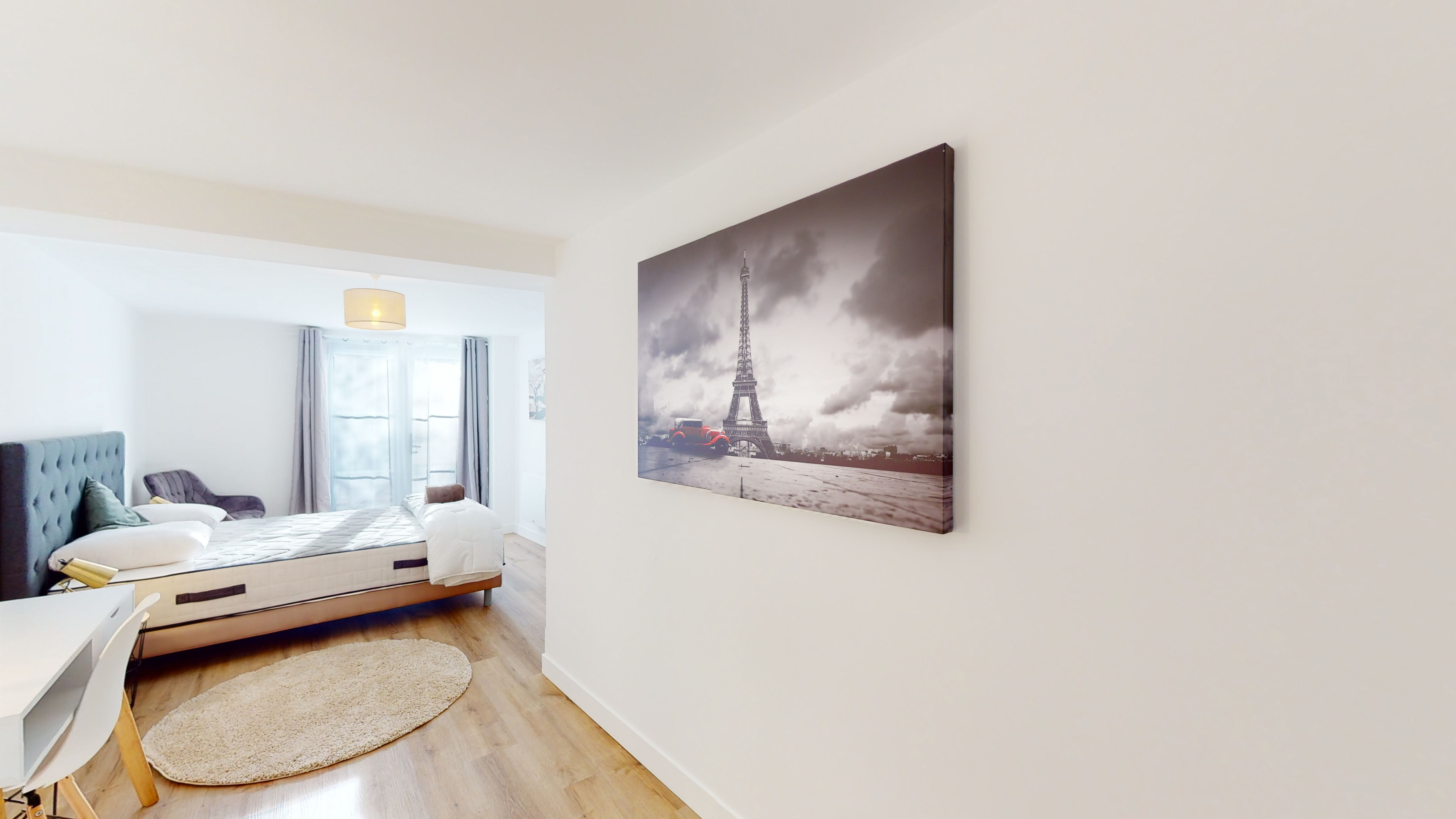 La chambre "Room for one person - 1" est un cocon de confort de 21m² situé au rez-de-jardin. Elle est parfaitement équipée pour une personne avec un lit double doté de literie de qualité, une armoire spacieuse pour vos affaires, ainsi qu'un bureau et une chaise pour travailler ou étudier dans les meilleures conditions. La salle de bain privée comprend une douche moderne, un lavabo et des sanitaires.