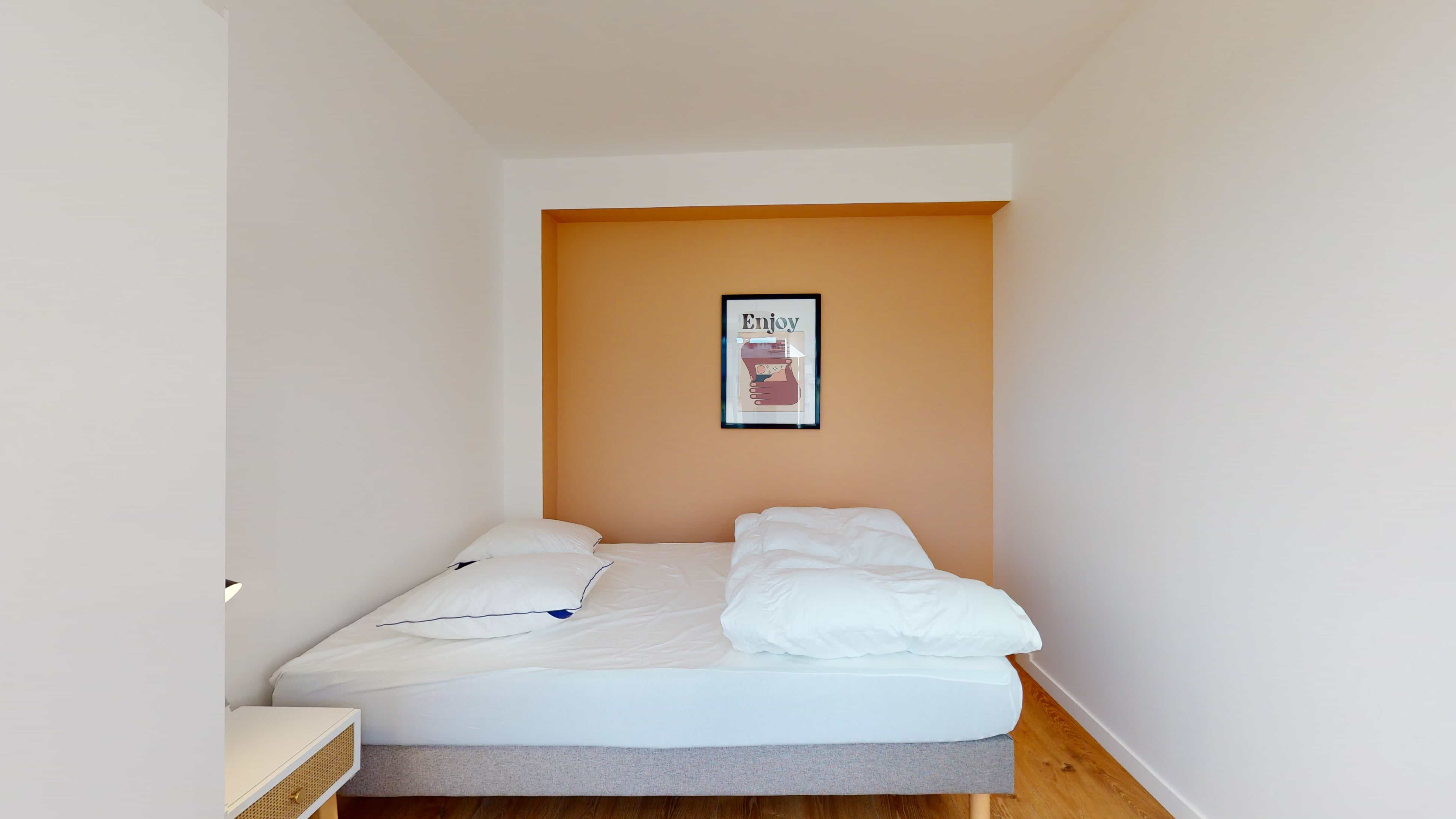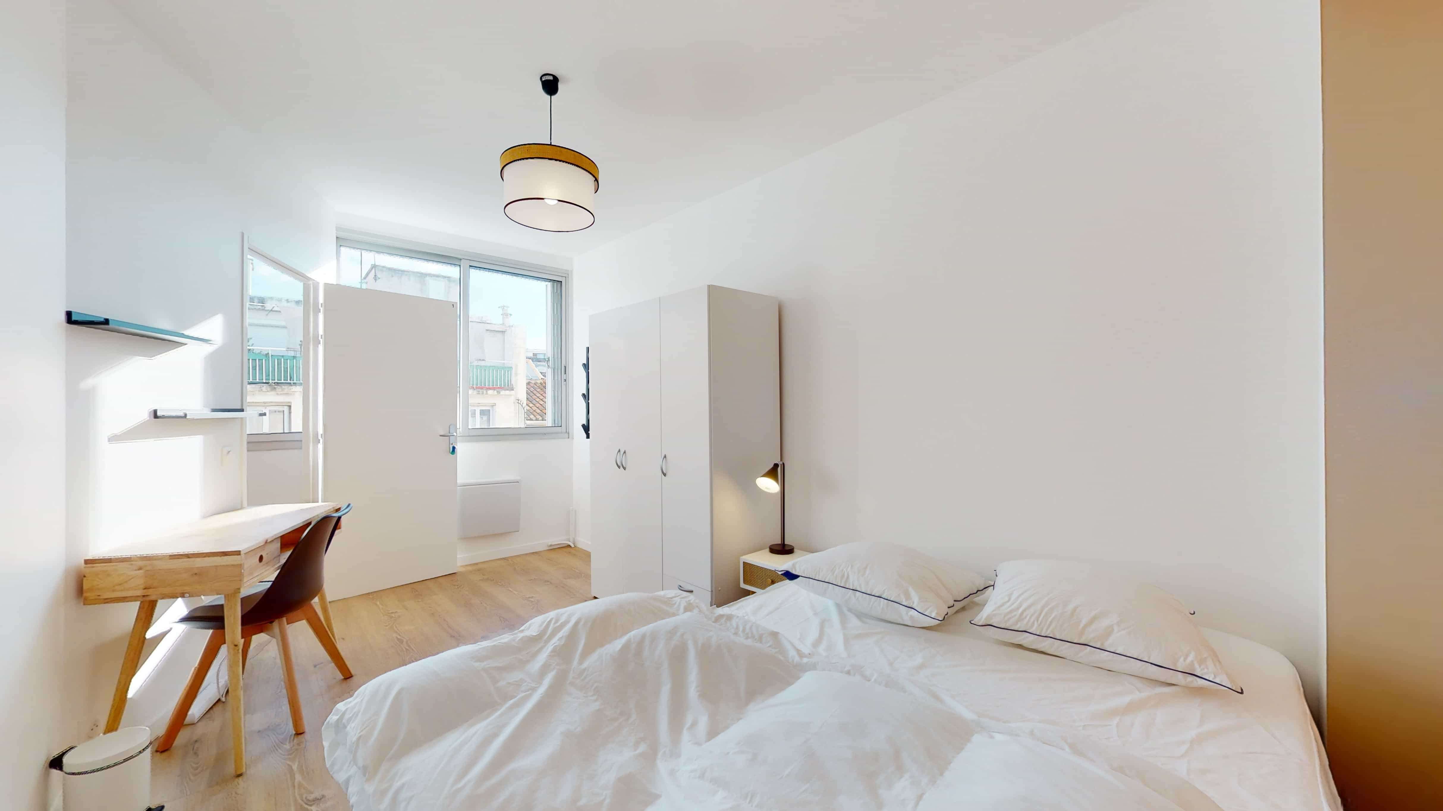 Room 1 est idéale pour une personne cherchant confort et fonctionnalité. La chambre de 11 m² est meublée d'un lit double confortable, une armoire pour tous vos effets personnels, un bureau et une chaise pour étudier ou travailler. Elle bénéficie également d'un accès à une salle de bain partagée, équipée d'une douche moderne et des toilettes.