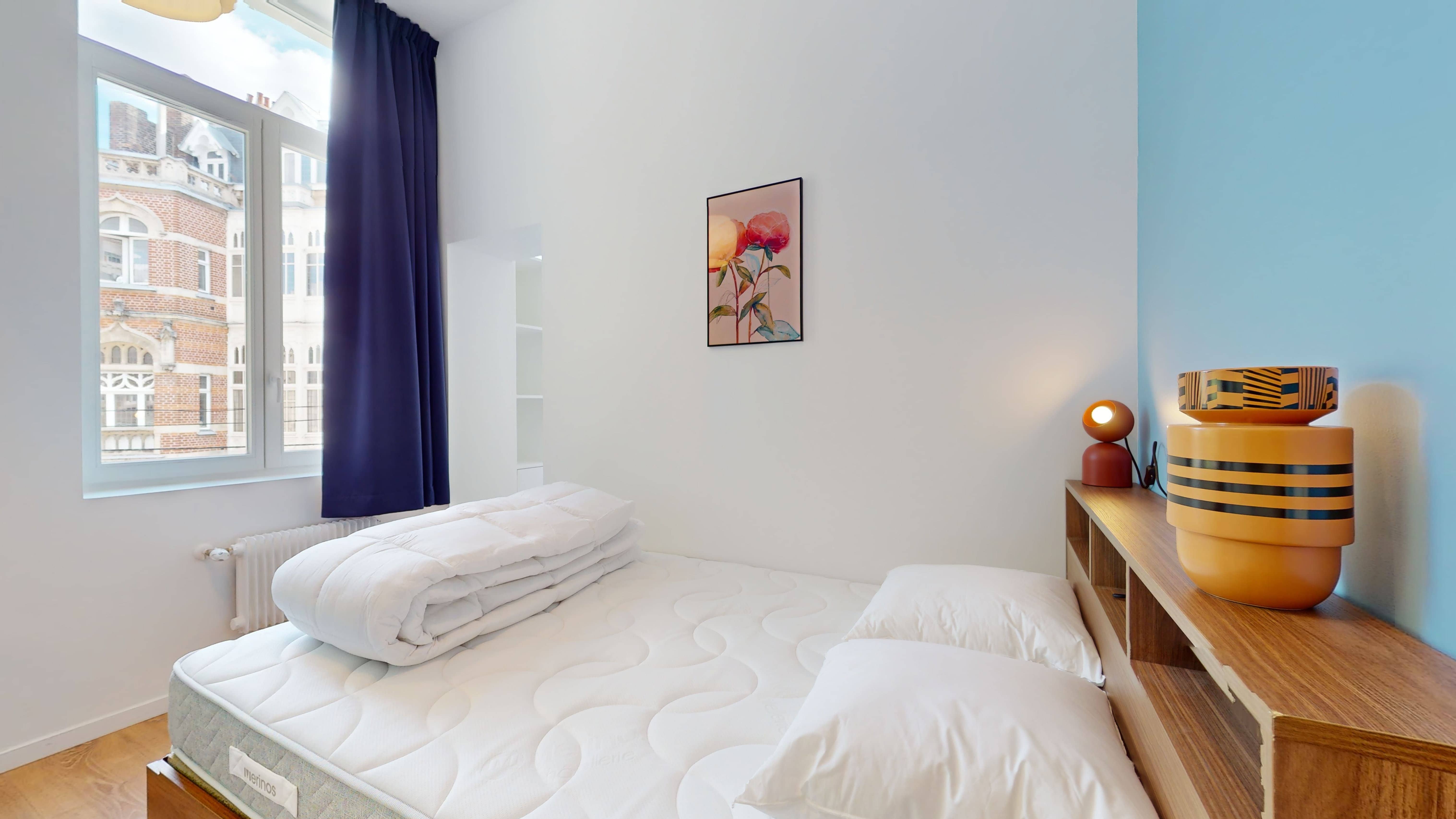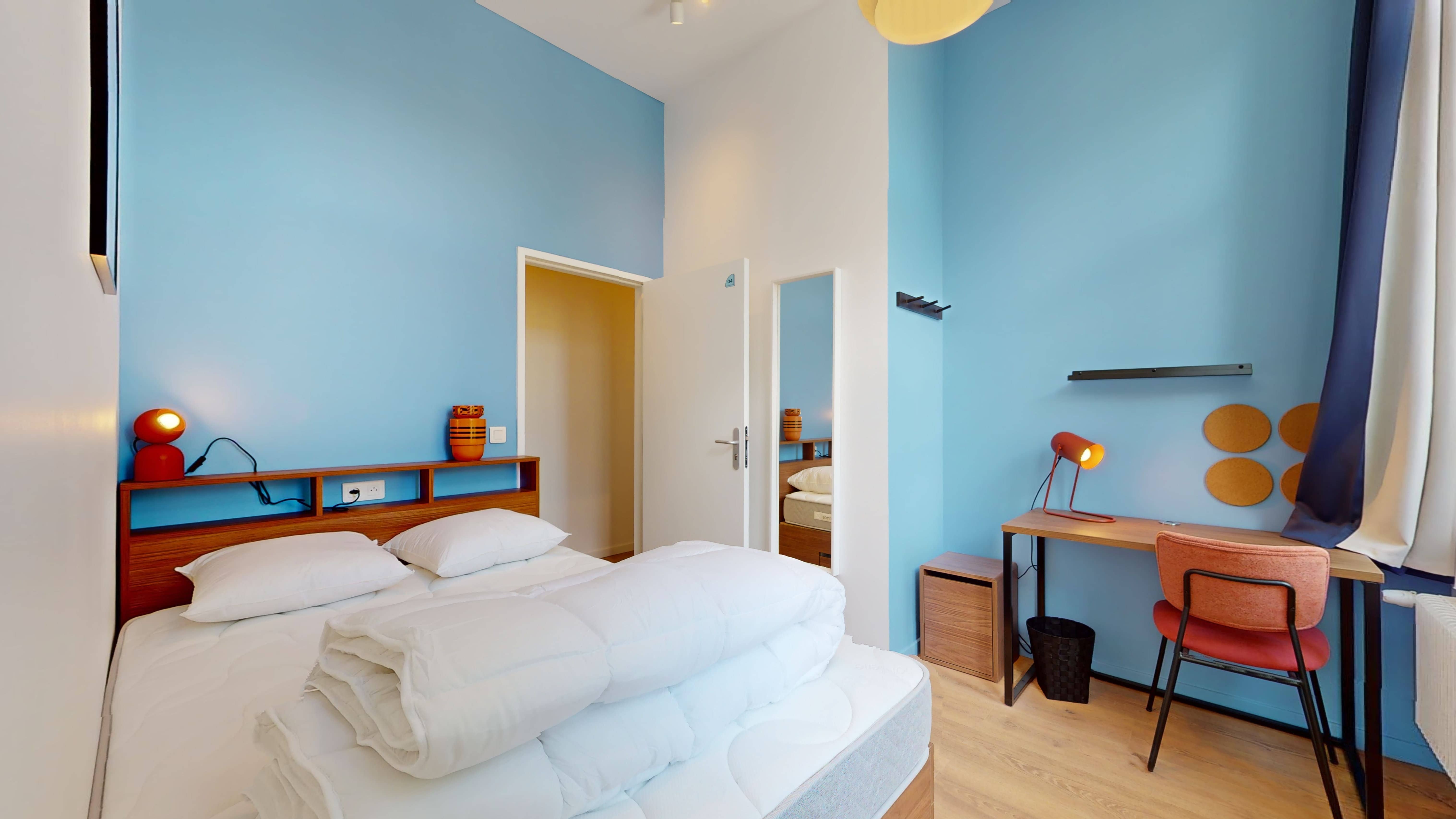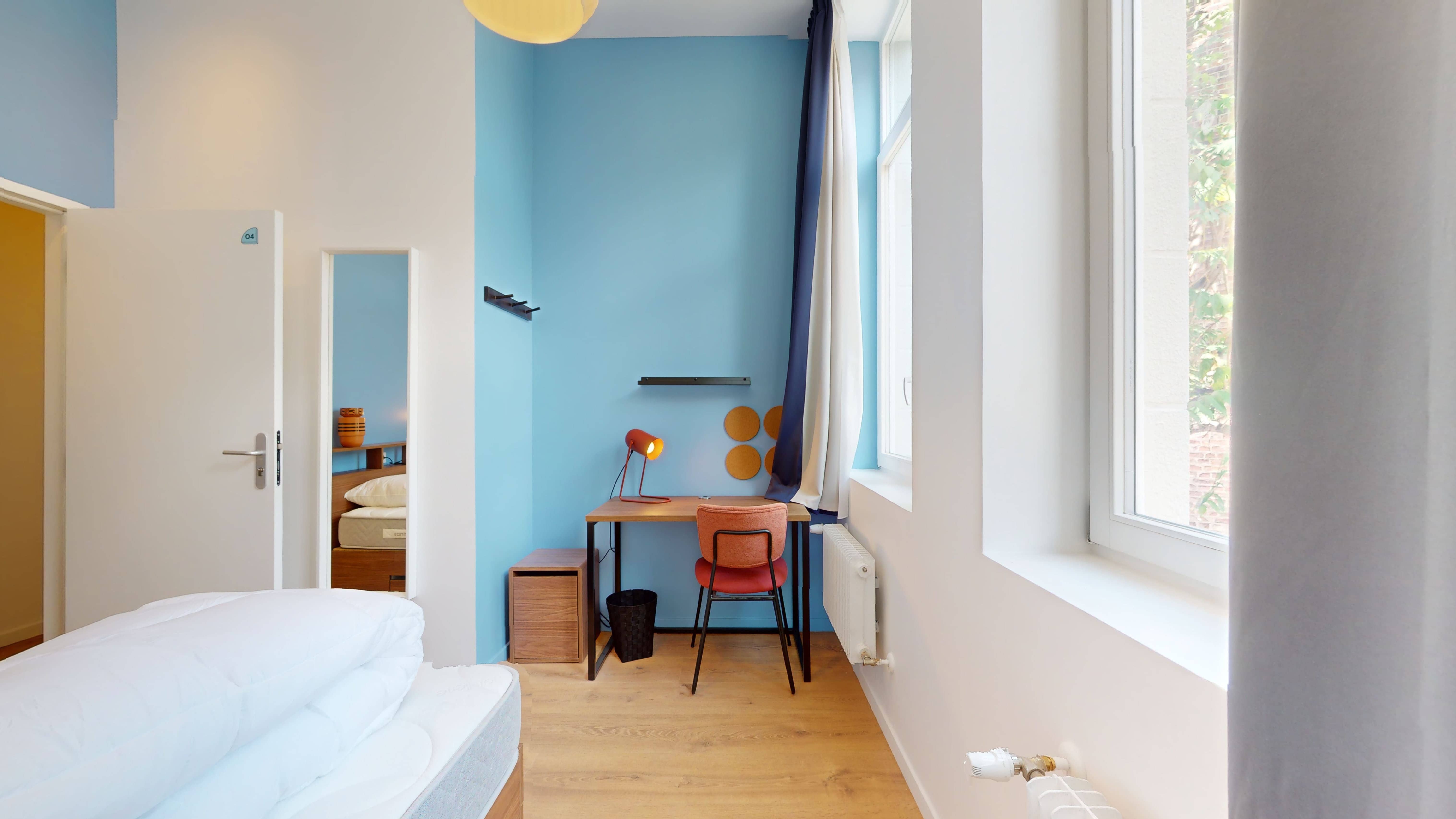 La chambre "Room for one person - 4" se trouve au premier étage. Elle est faite pour une personne et comprend un lit double confortable avec des rangements supplémentaires en dessous, une armoire pour vos vêtements, un bureau et une chaise pour travailler ou étudier, ainsi qu'une connexion internet haut débit. La salle de bain est partagée avec un autre locataire et comprend une douche moderne.