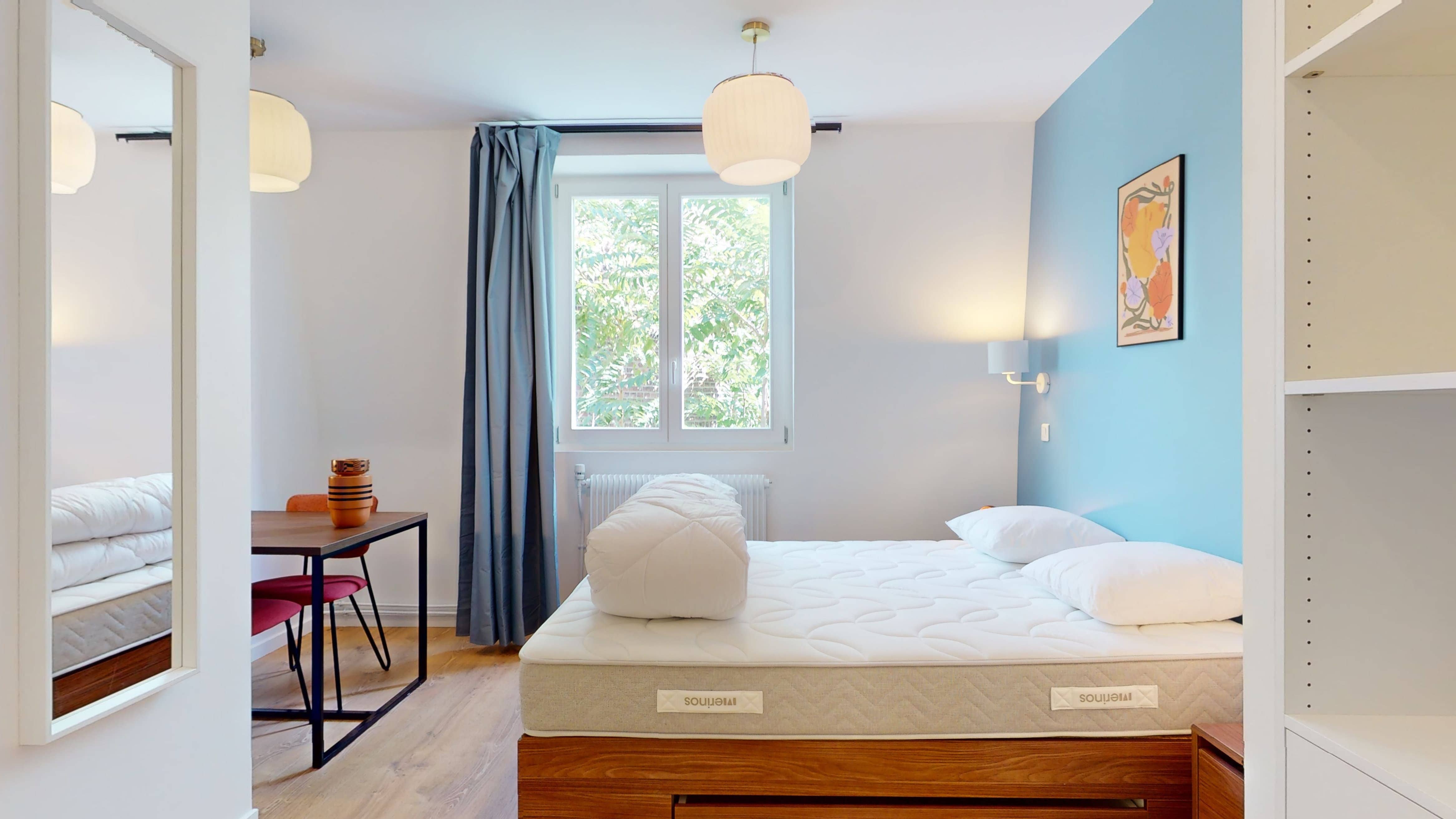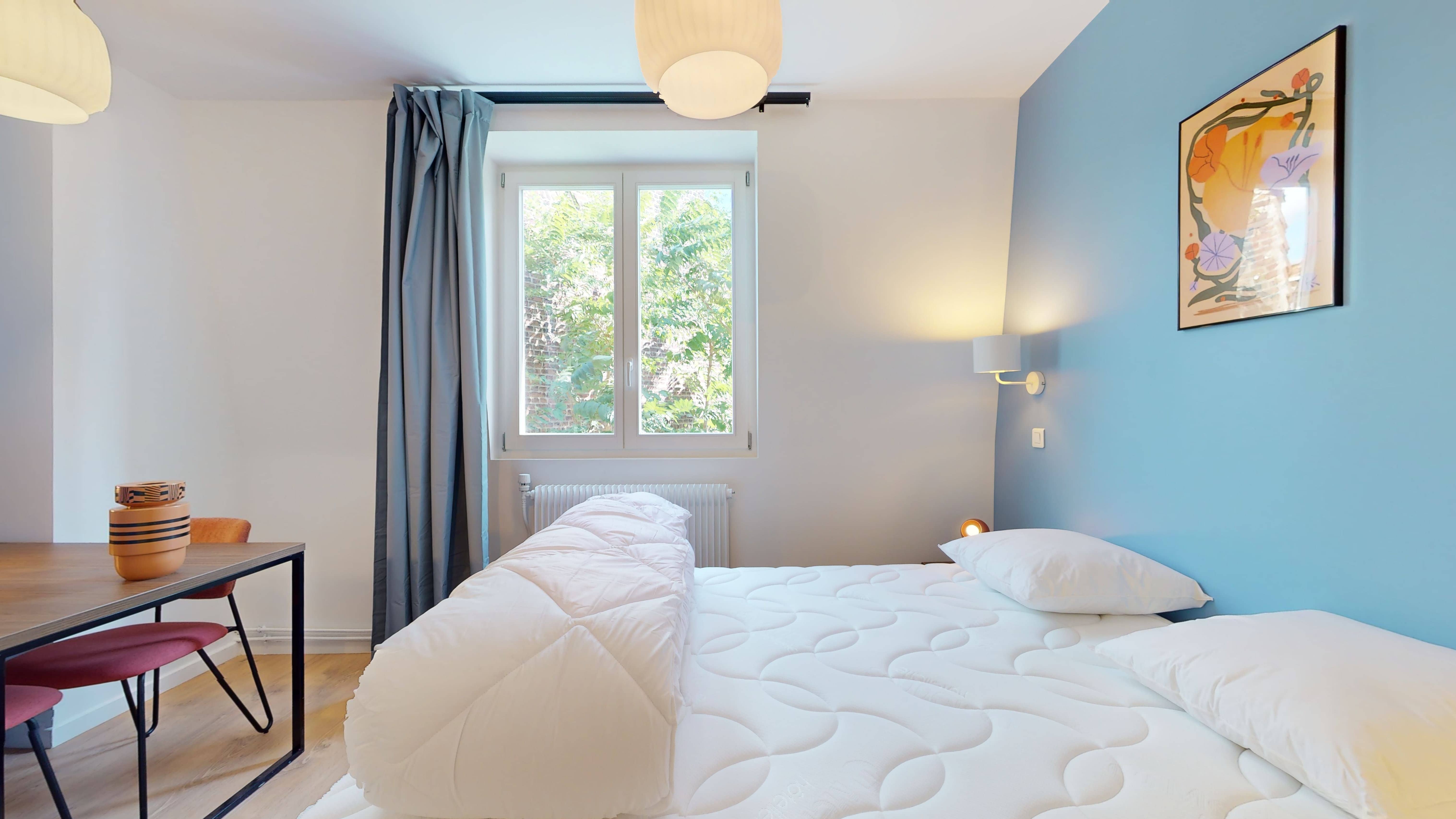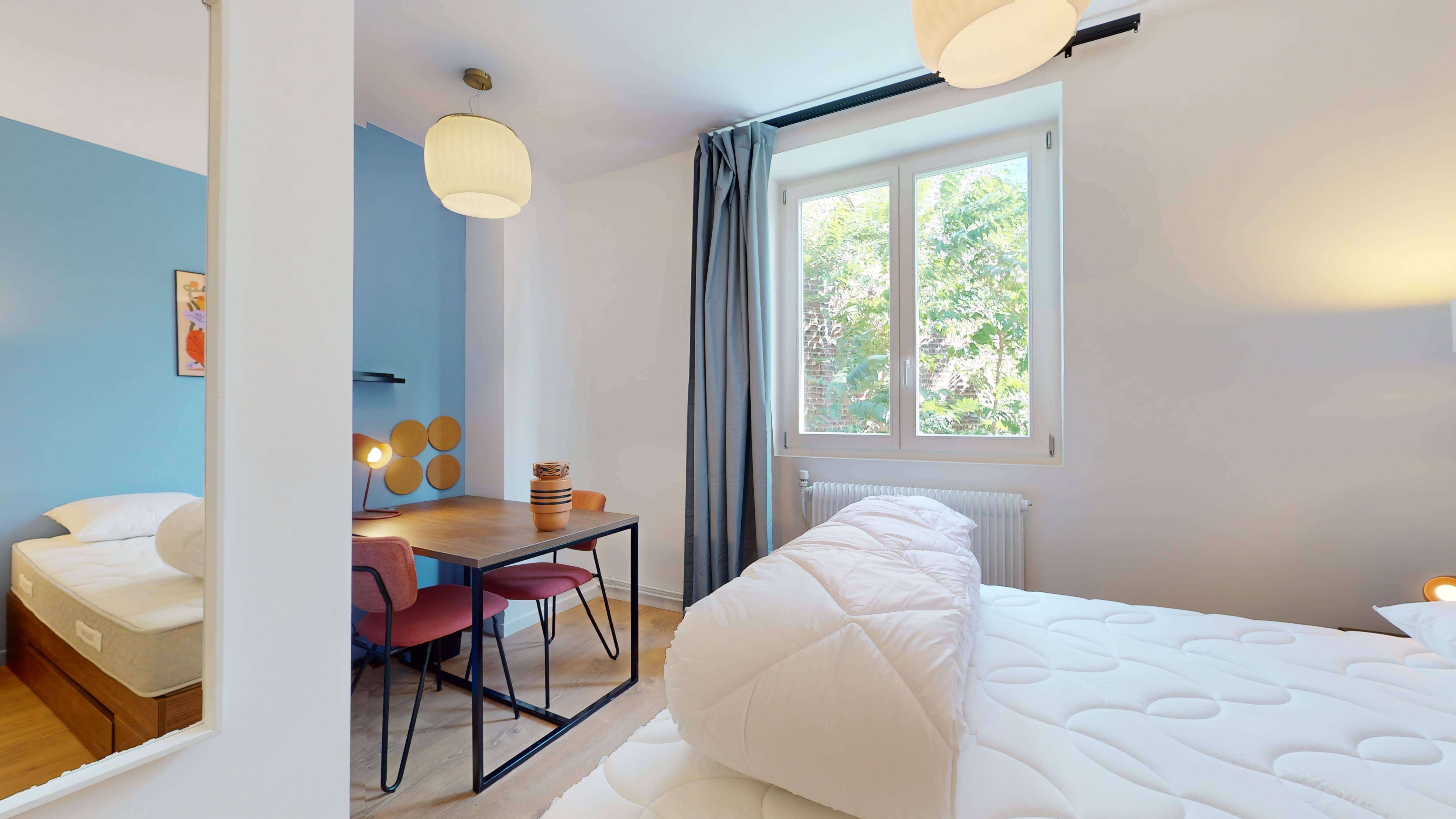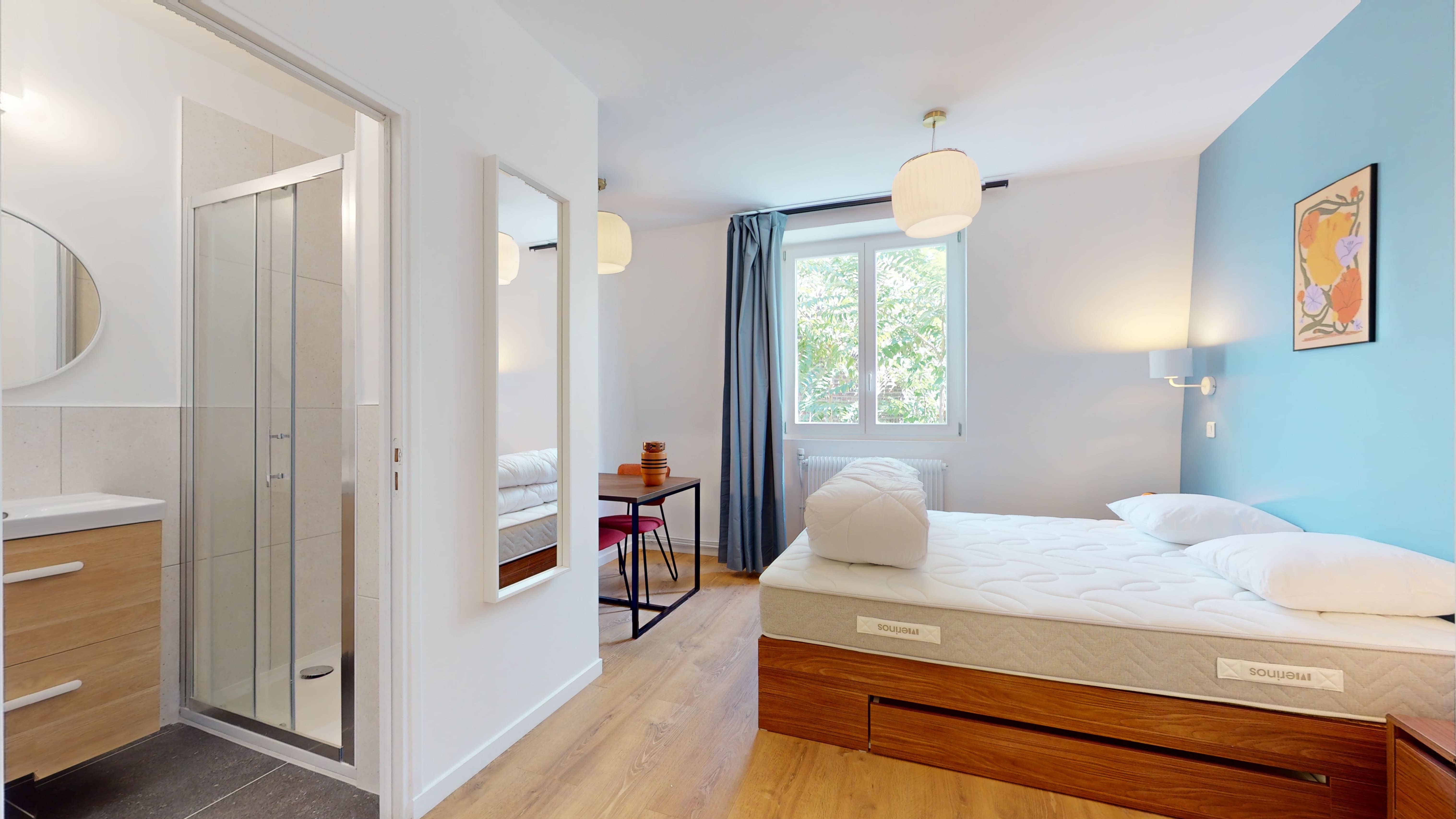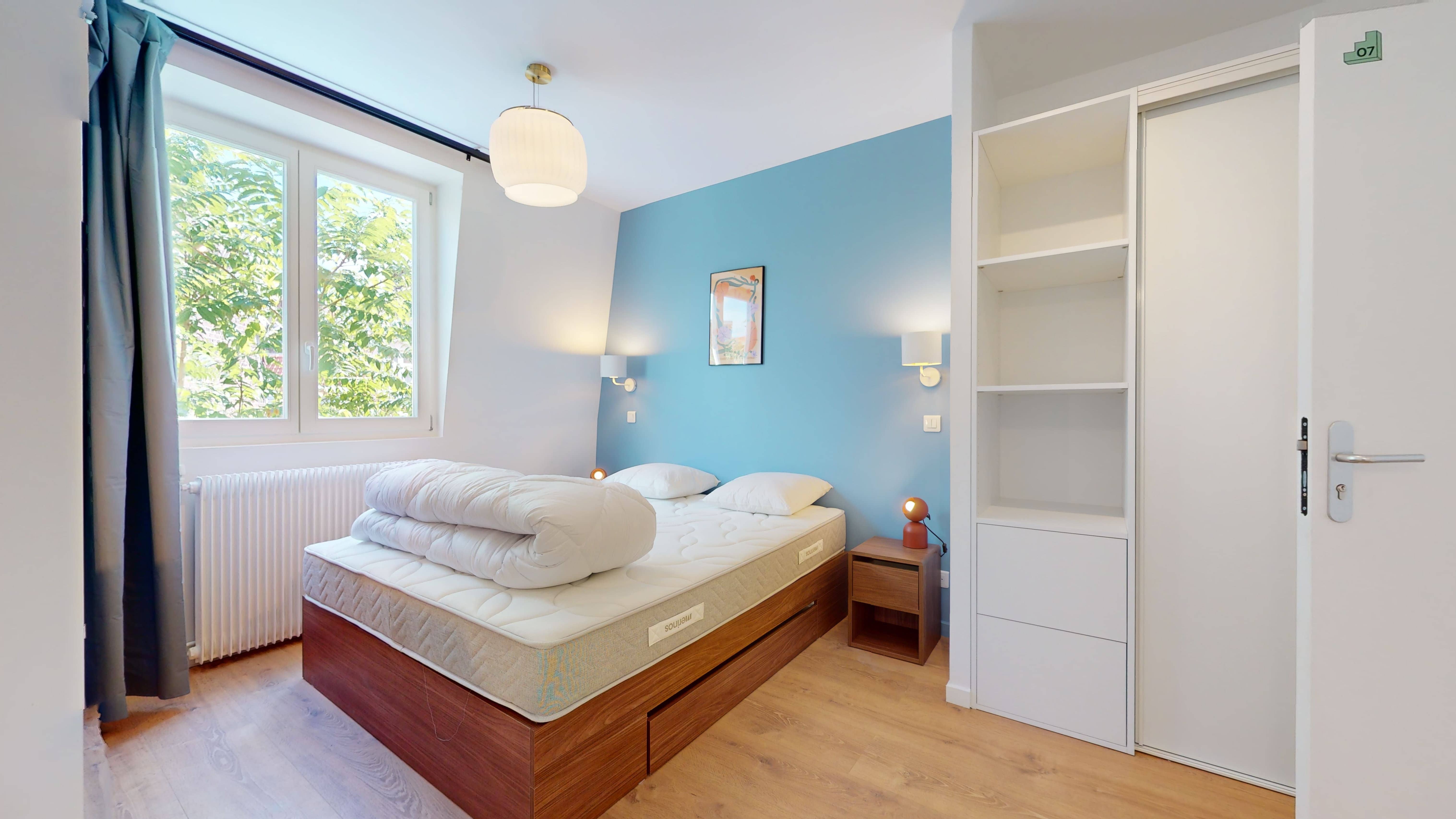 La chambre "Room for two people - 7" se trouve au deuxième étage et est idéale pour une vie à deux. Elle est équipée d'un lit double confortable avec rangement intégré, d'une armoire pour vos affaires, d'un bureau avec chaise pour travailler ou étudier, et d'une salle de bain privée avec douche. Vous y trouverez également tout le nécessaire pour votre confort : radiateur, linge de lit de qualité, étagère murale, lampes et internet haut débit.
