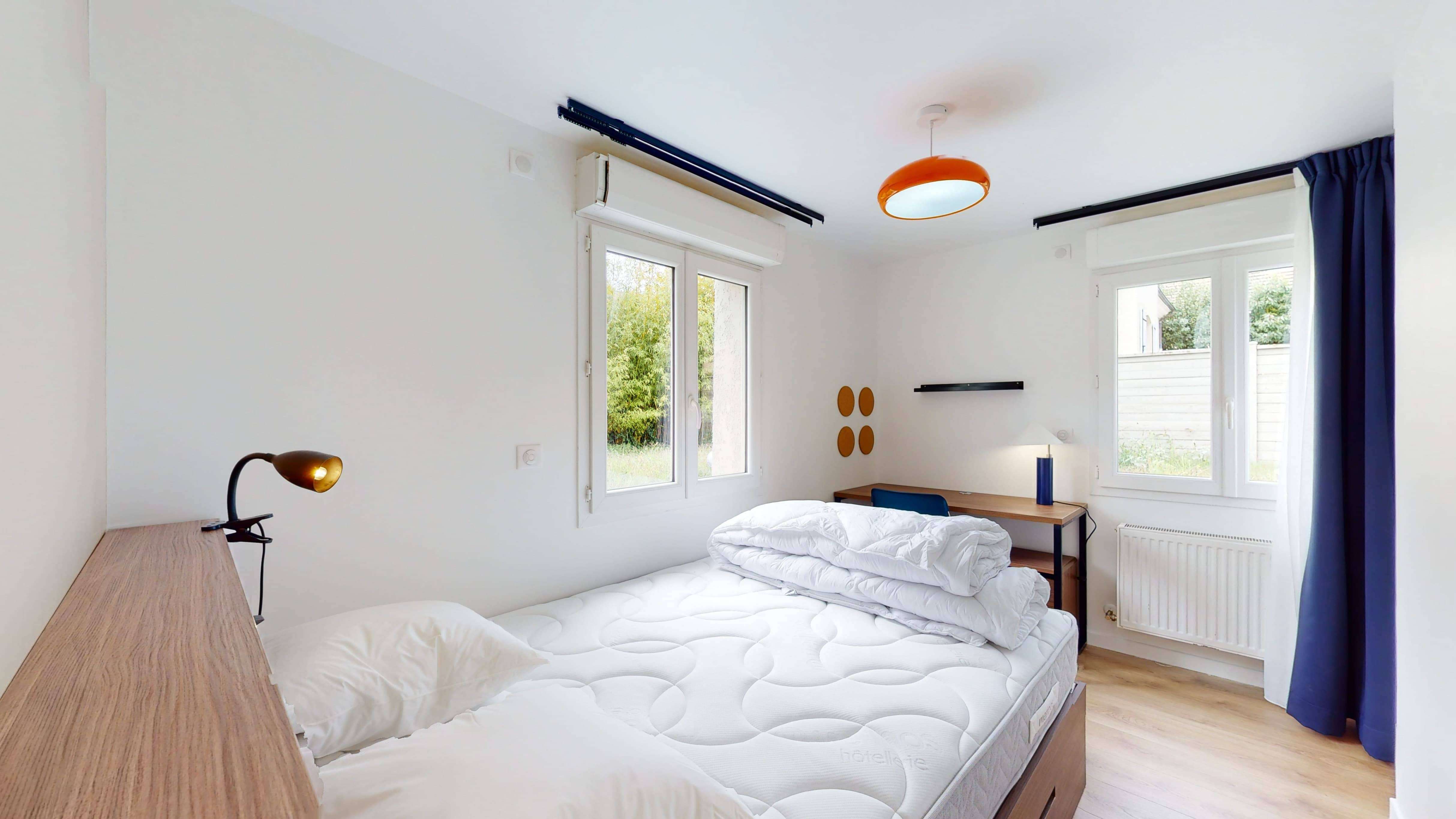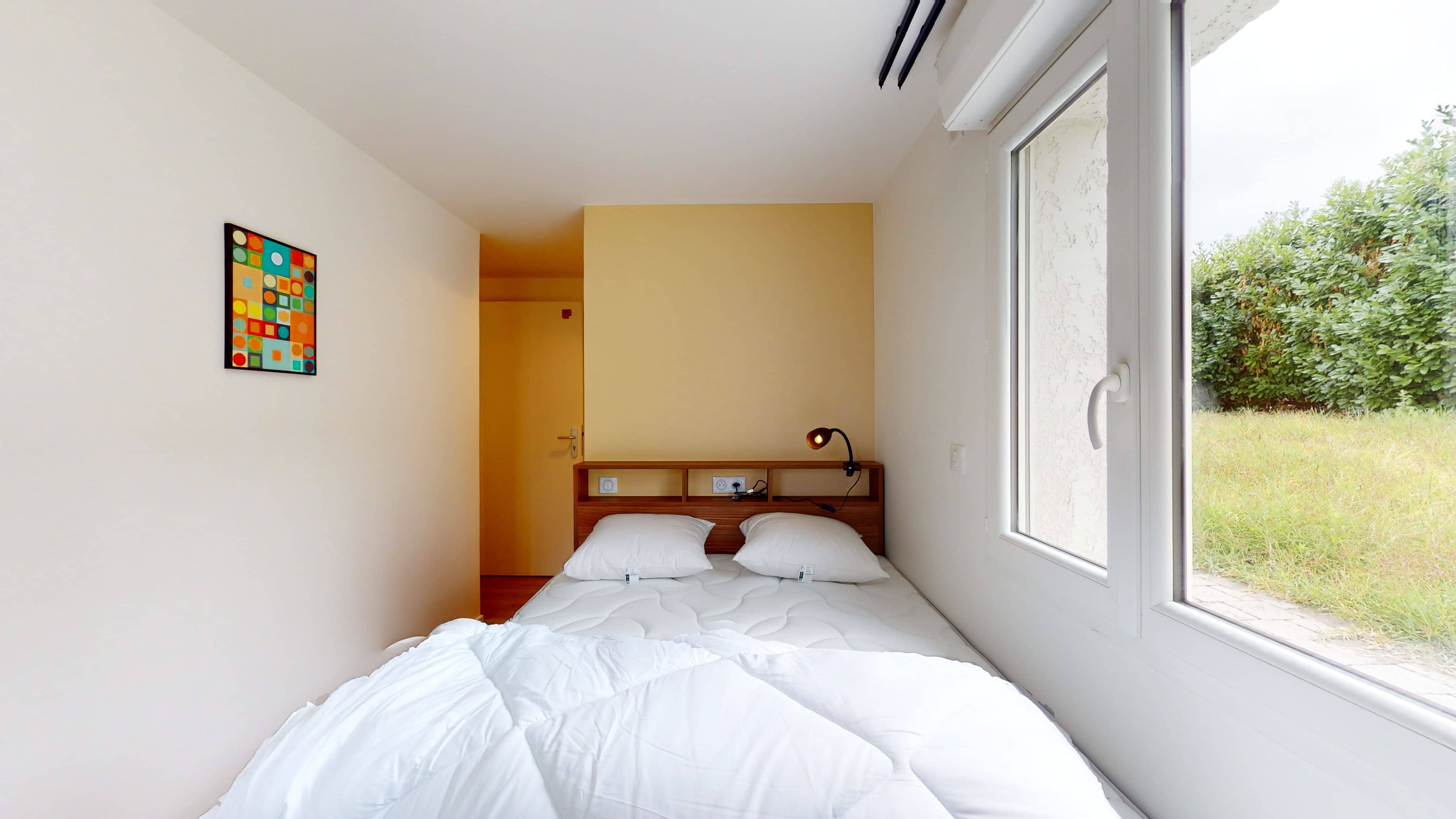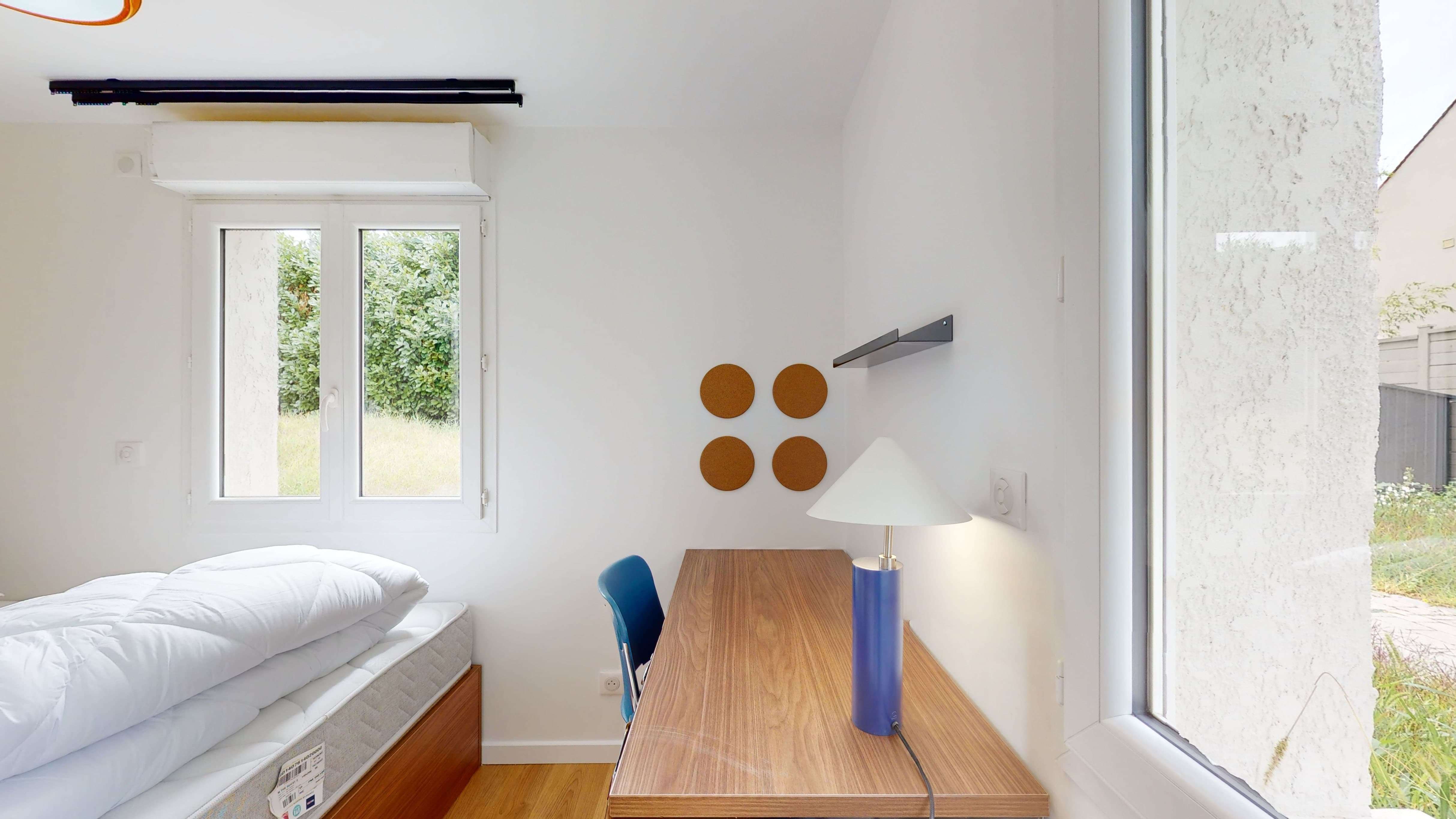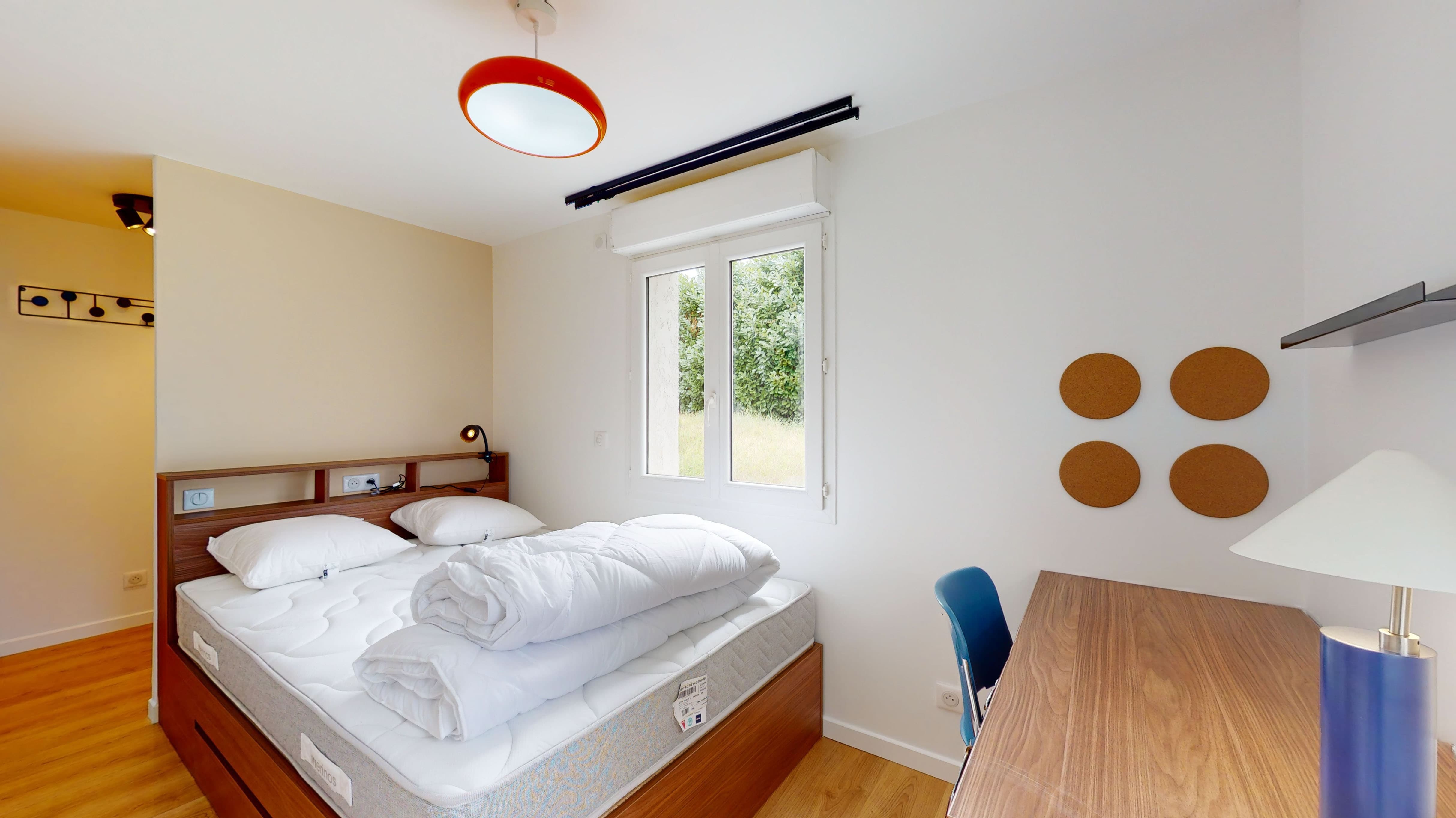 La chambre "Room for one person - 3" est un cocon de confort de 11m2 situé au rez-de-jardin. Elle est parfaitement équipée pour votre intimité et votre confort avec un lit double doté d'une literie de qualité, une armoire spacieuse, un bureau et une chaise pour travailler ou étudier, et une salle de bain privative avec douche. La chambre bénéficie également d'une connexion internet haut débit et d'autres commodités pour rendre votre séjour agréable.