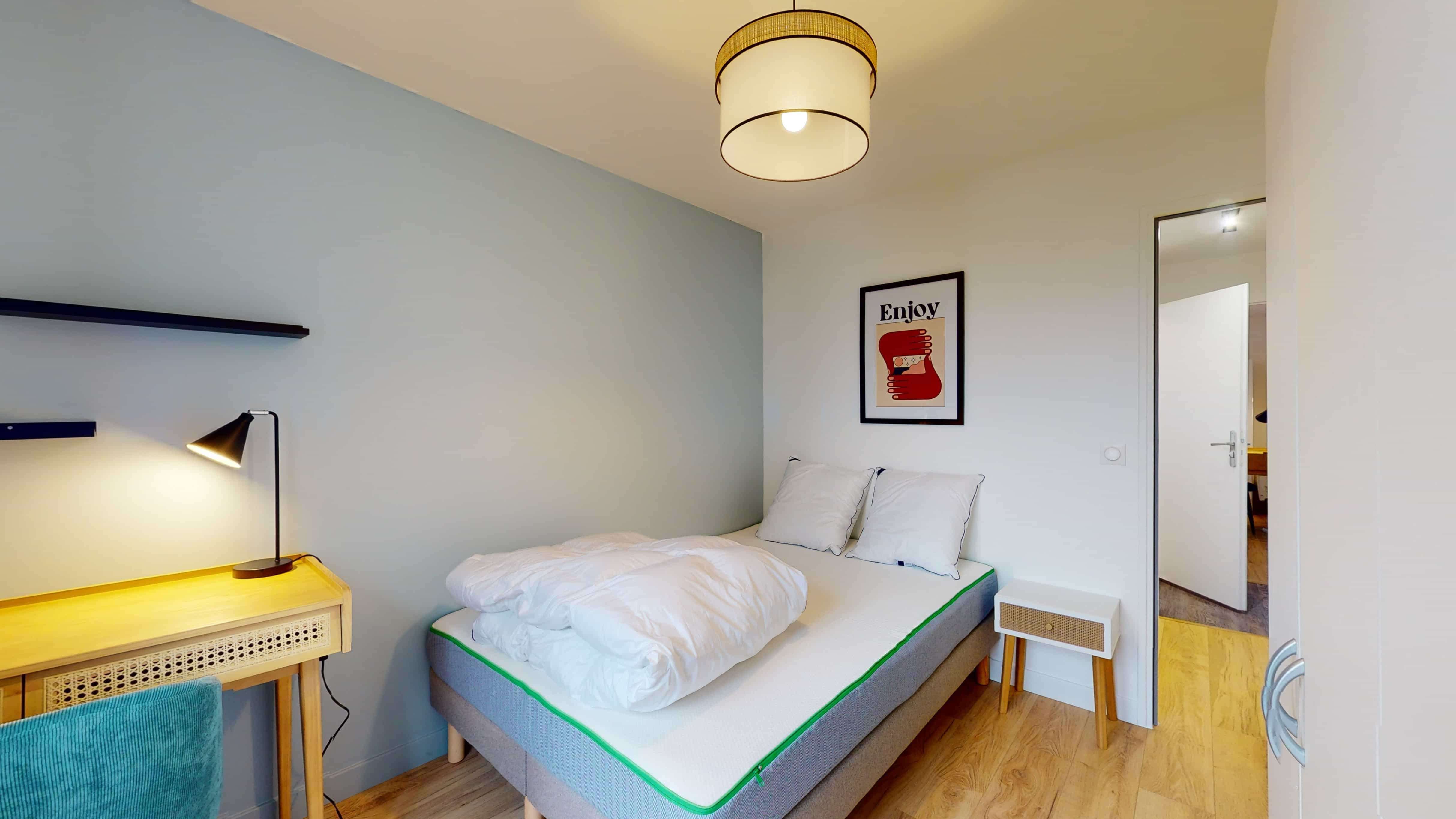 La chambre Room 1 est parfaite pour une personne. Elle est meublée avec un lit double confortable, une armoire où vous pouvez ranger vos affaires, un bureau et une chaise pour travailler ou étudier. Vous partagerez une salle de bain moderne avec douche et toilettes avec d'autres colocataires.
