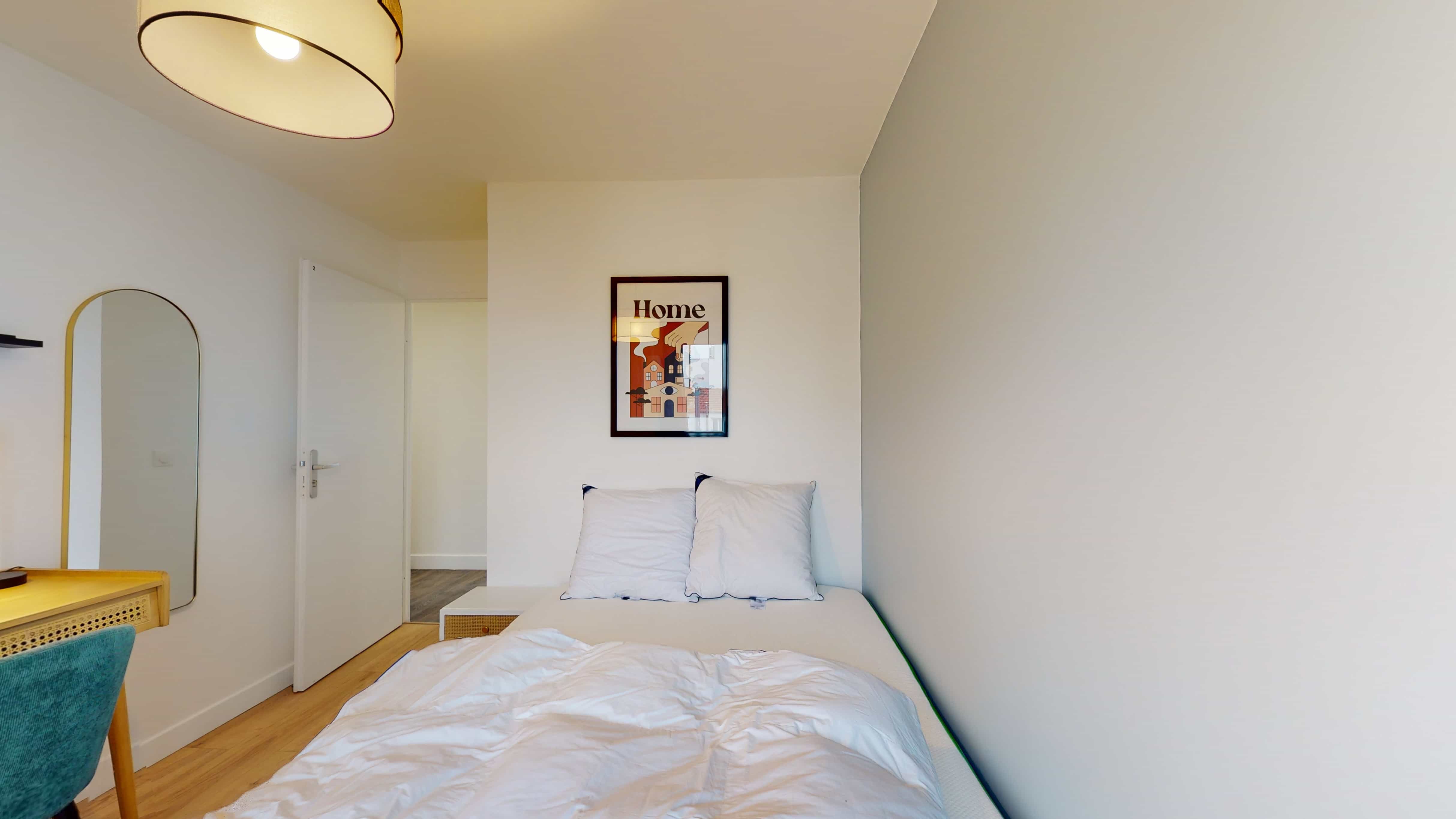 Room 2 est spécialement conçue pour une personne. Elle est meublée d'un lit double confortable avec de la literie de qualité, d'une armoire pour vos vêtements, d'une chaise et d'un bureau pratique pour travailler ou étudier. Vous partagerez une salle de bain moderne, équipée d'une douche et de toilettes, avec quelques autres locataires.