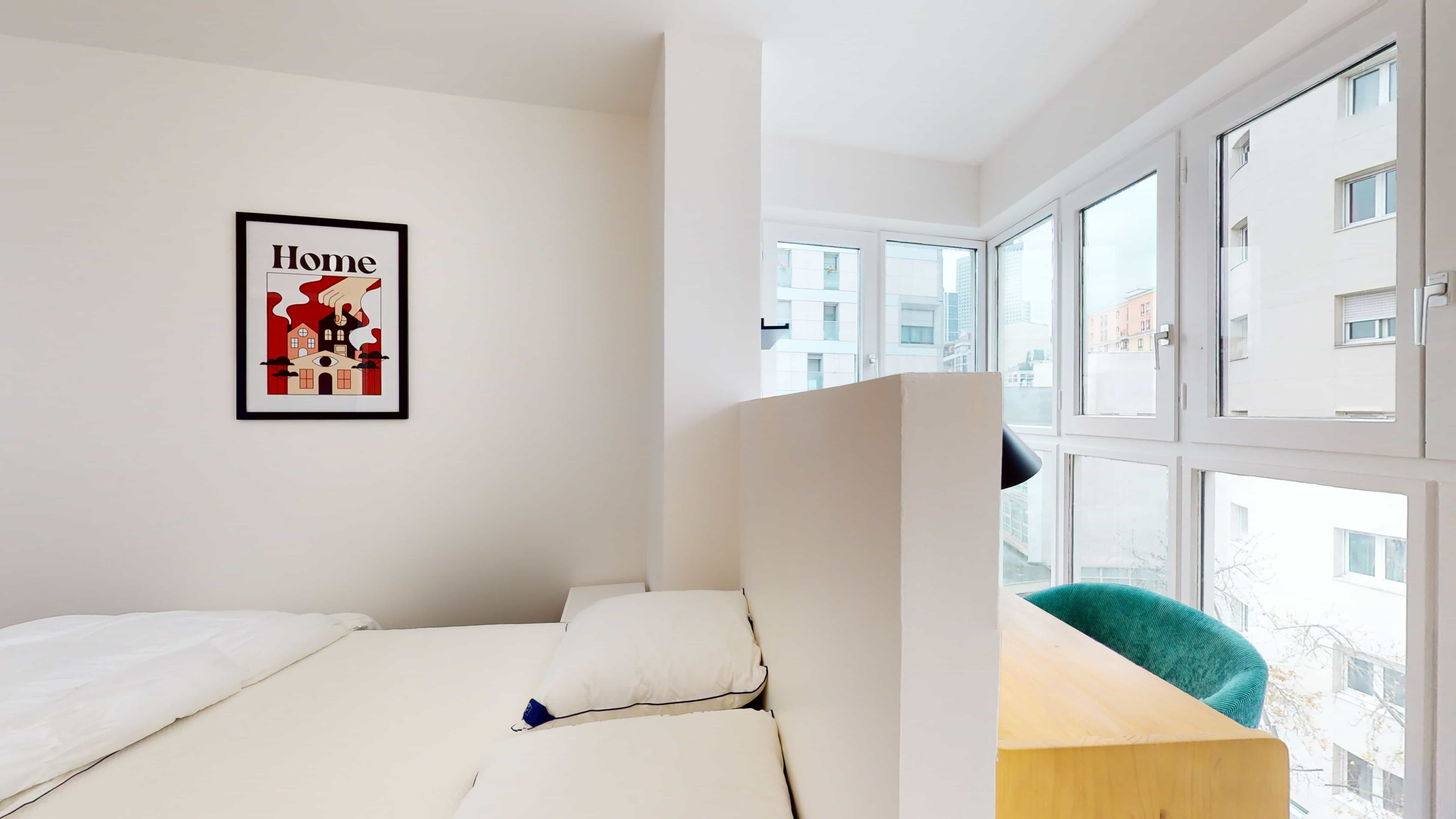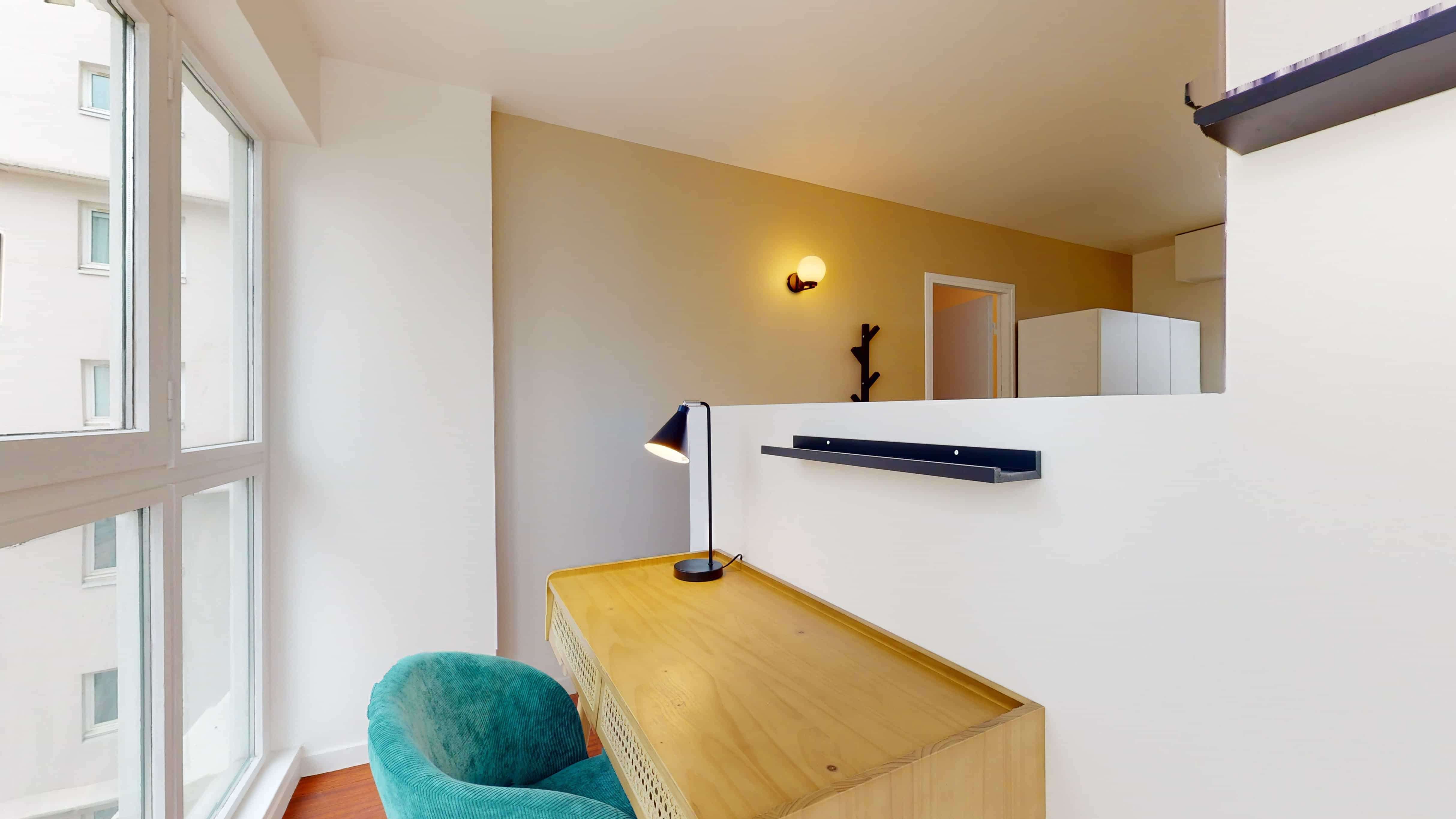 La chambre Room 5, destinée à une seule personne, est un vrai cocon de confort. Avec ses 12 m², elle offre un lit double doté de literie de qualité, une armoire spacieuse pour toutes vos affaires, un bureau et une chaise pour travailler en toute tranquillité. La chambre partage une salle de bain propre et moderne avec d'autres locataires.