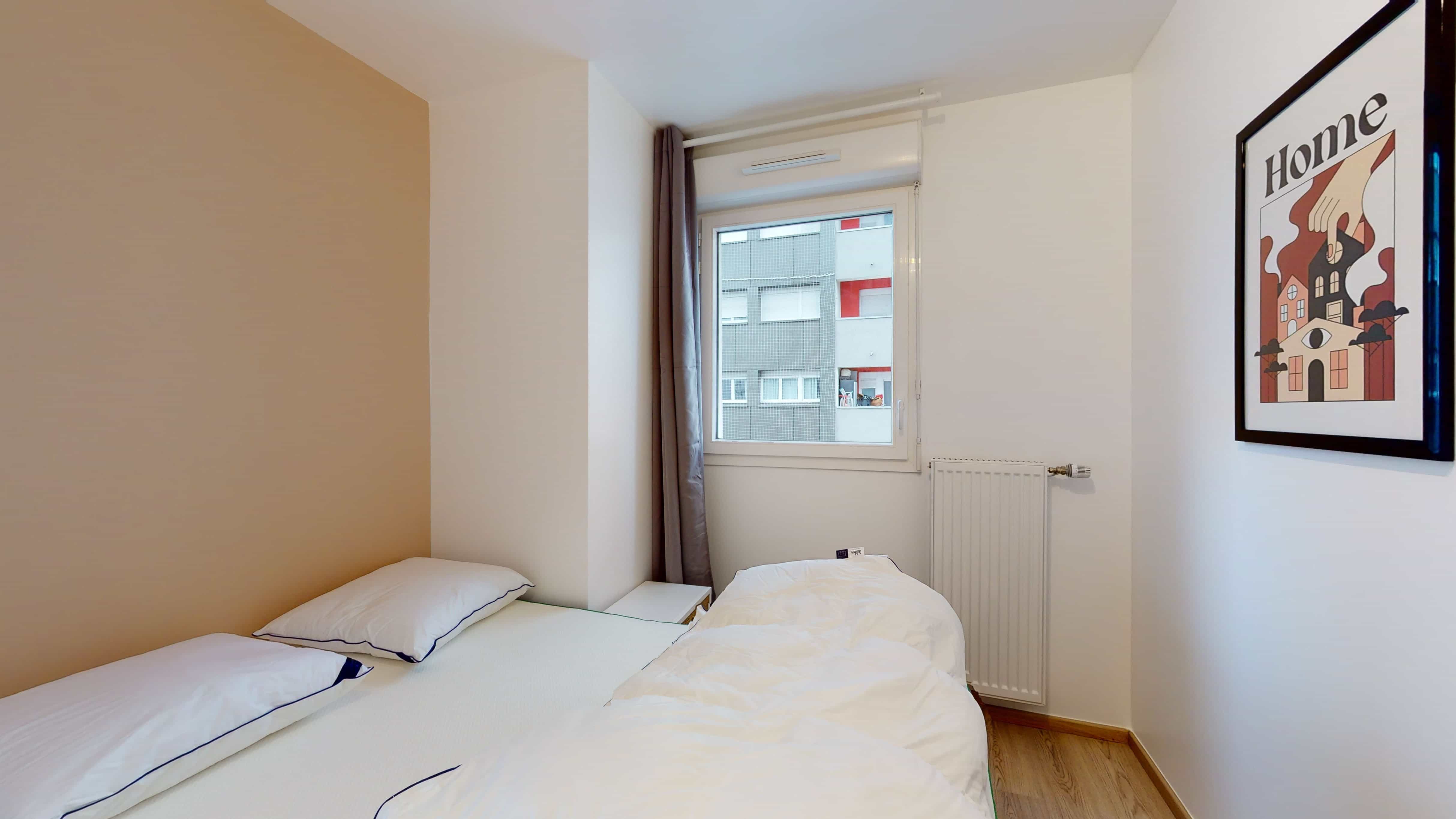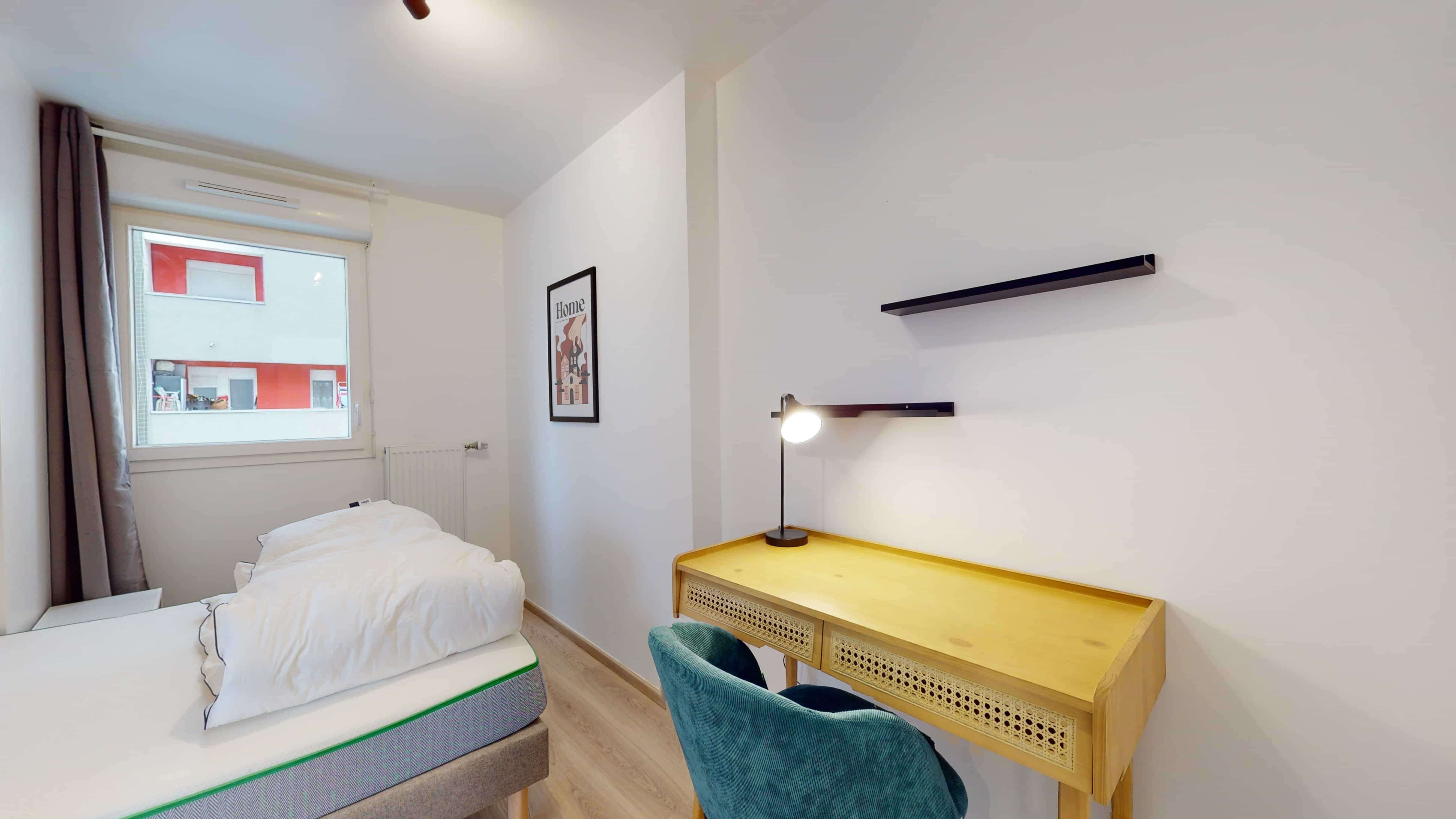 Room 4 est votre espace personnel, parfait pour une personne. Elle est meublée avec un lit double confortable, une grande armoire pour vos vêtements, ainsi qu'une chaise et un bureau pour travailler ou étudier. La chambre partage une salle de bain bien équipée avec une douche, un lavabo et des toilettes.