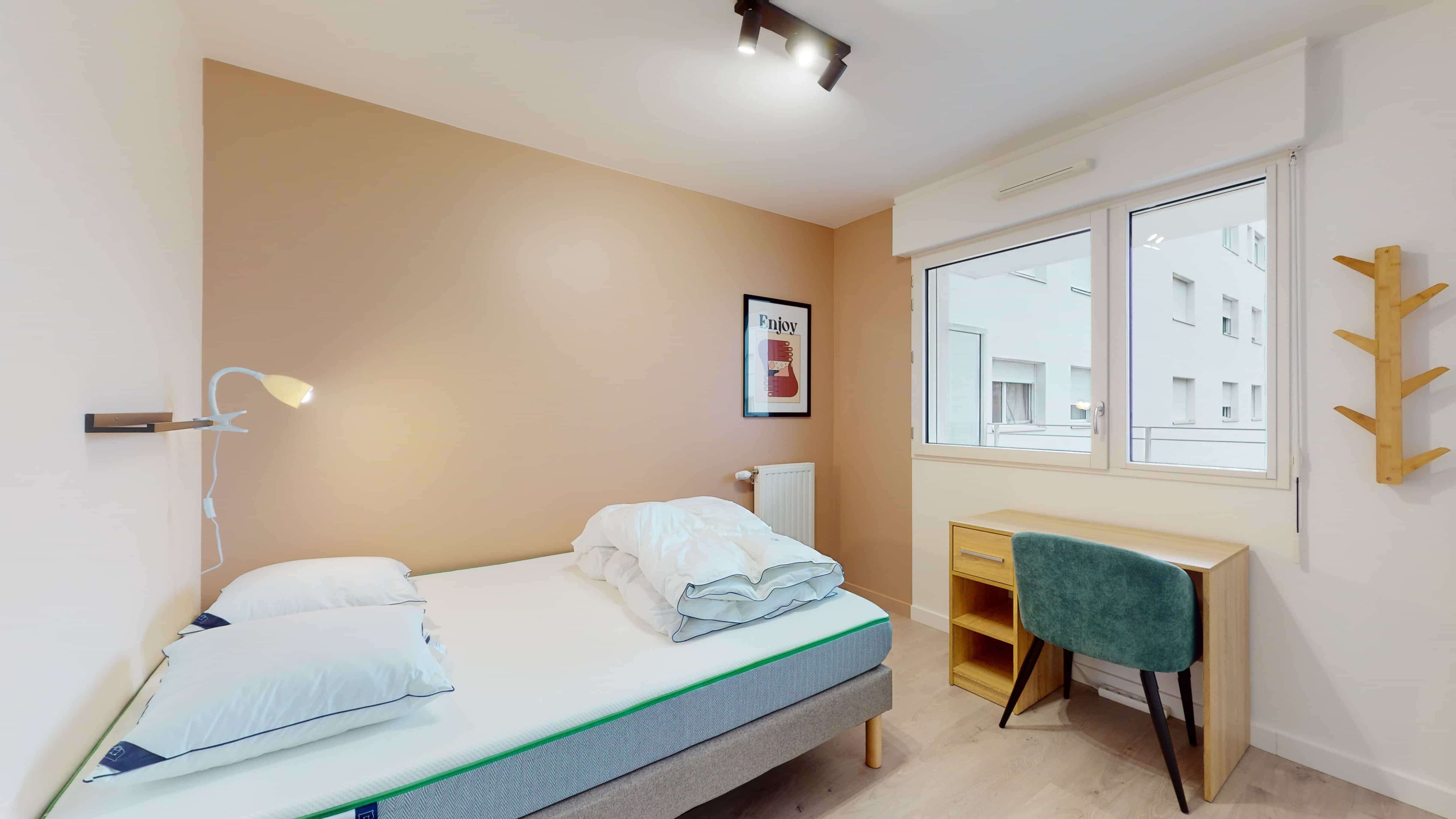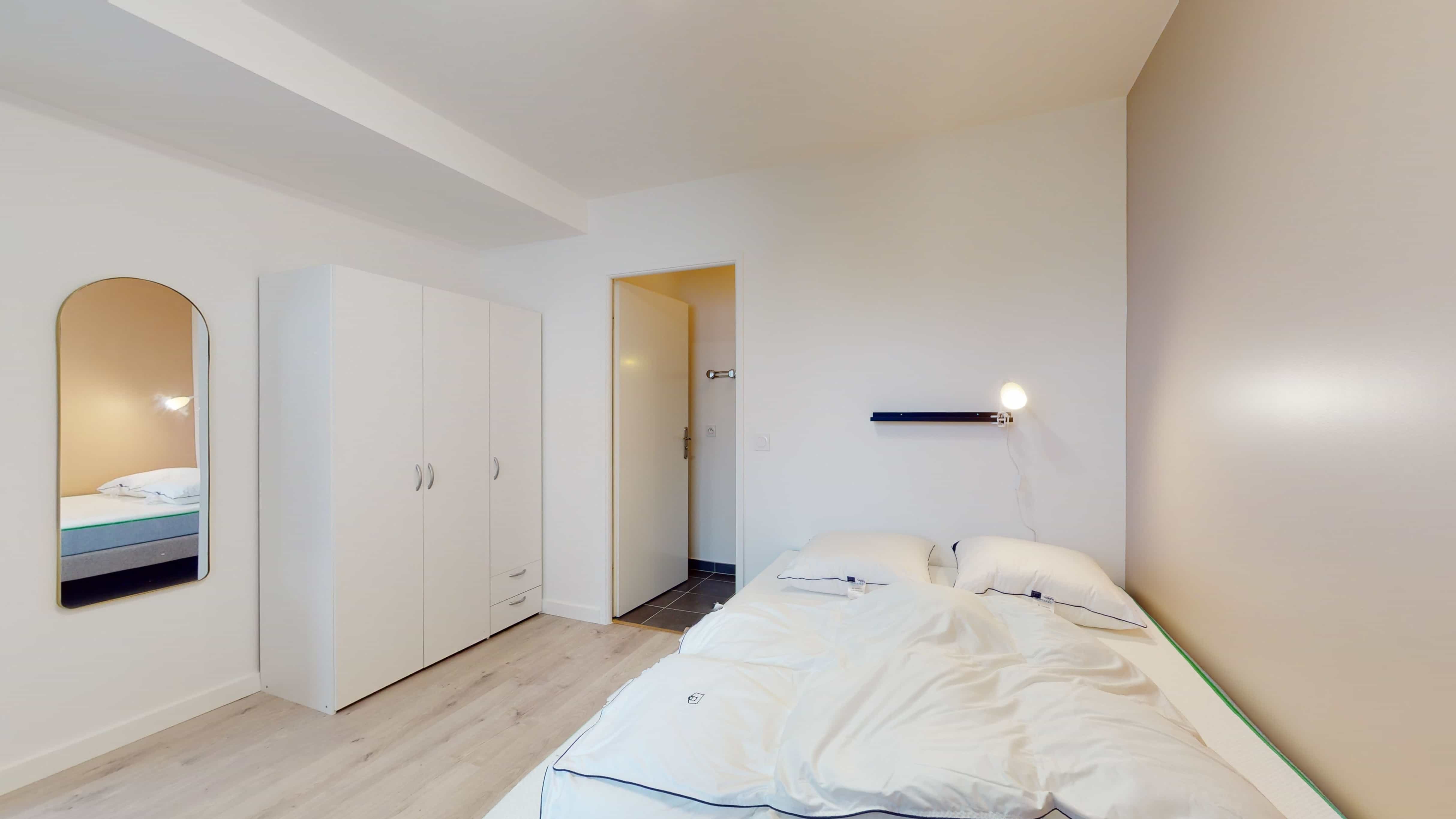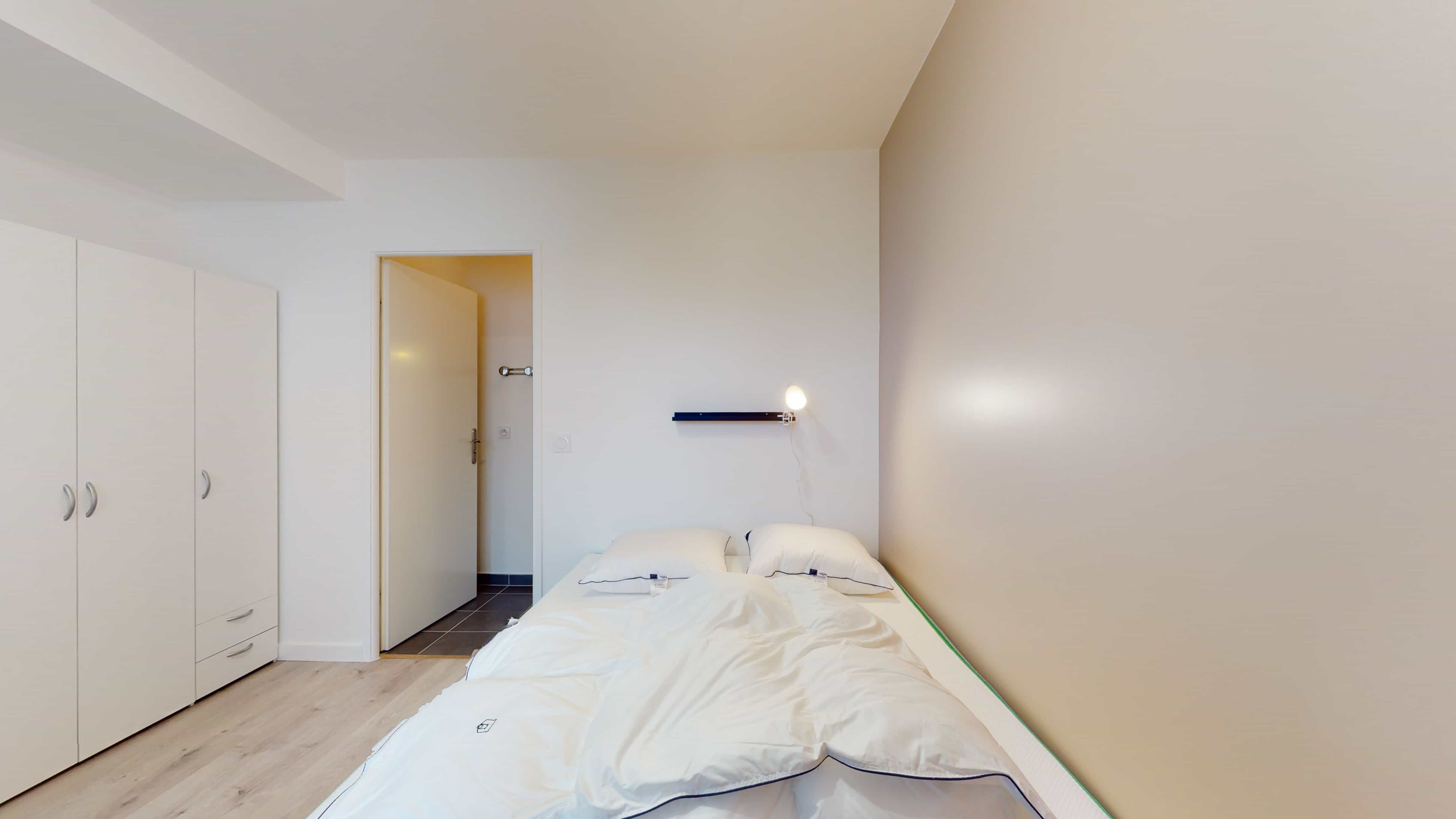 La chambre Room 1, d'une superficie de 11m², est spécialement conçue pour une personne. Elle est meublée d'un lit double avec une literie de qualité, d'une armoire pour vos affaires, ainsi que d'un bureau et d'une chaise pour travailler confortablement. Profitez de l'intimité de votre salle de bain privative avec douche, lavabo et toilettes, sans oublier l'accès à un balcon privé pour un moment de détente en plein air.