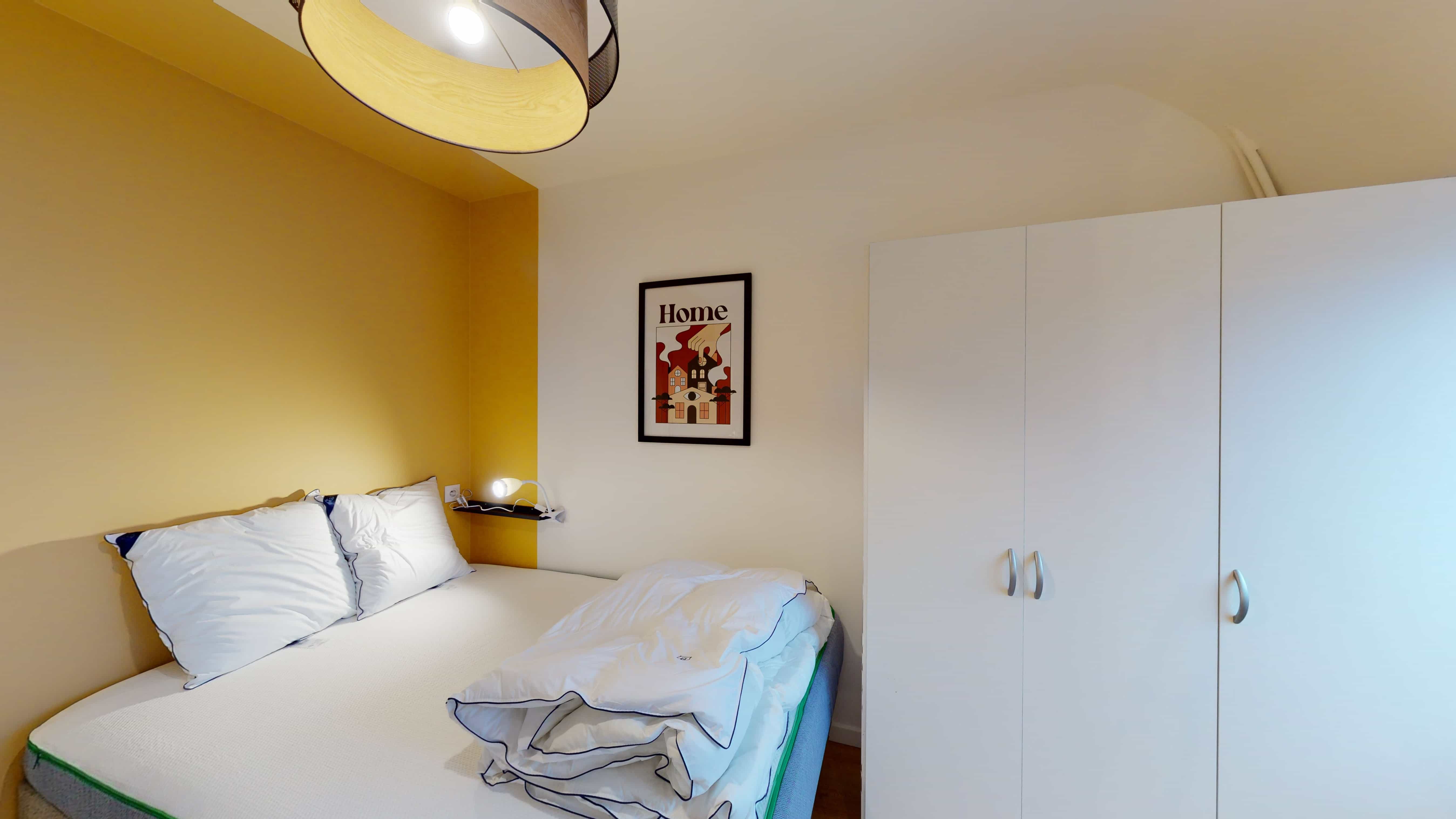 La chambre "Room 1" est un petit cocon privé rien que pour toi. Elle a tout ce qu'il faut : un grand lit confortable pour bien dormir, une armoire pour tes vêtements, une chaise et un bureau pour travailler ou étudier. Et ne t'inquiète pas, tu partageras une salle de bain moderne avec juste quelques autres locataires.