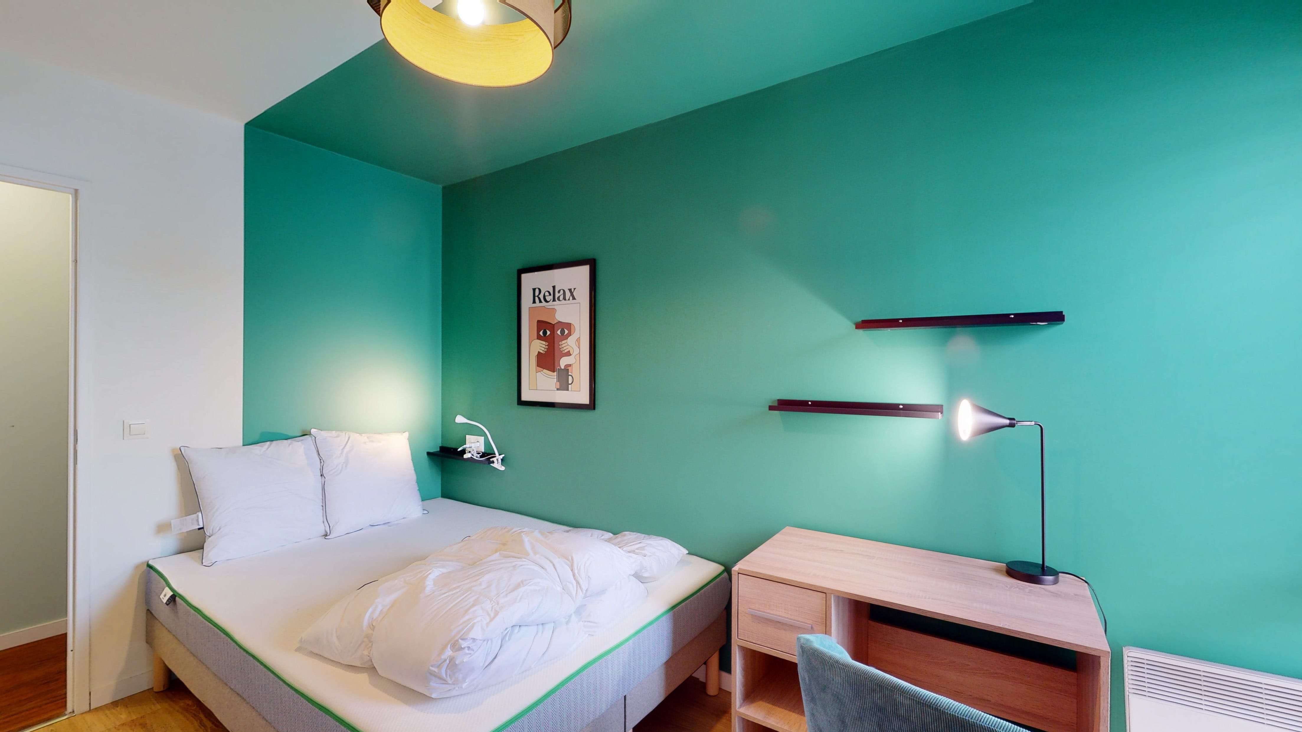 Room 2 est spécialement aménagée pour une personne, offrant un espace privé agréable de 9 m². Vous y trouverez un lit double doté d'une literie de qualité, une armoire pour vos affaires, une chaise et un bureau pour étudier ou travailler. La chambre partage une salle de bain propre et moderne avec d'autres locataires.